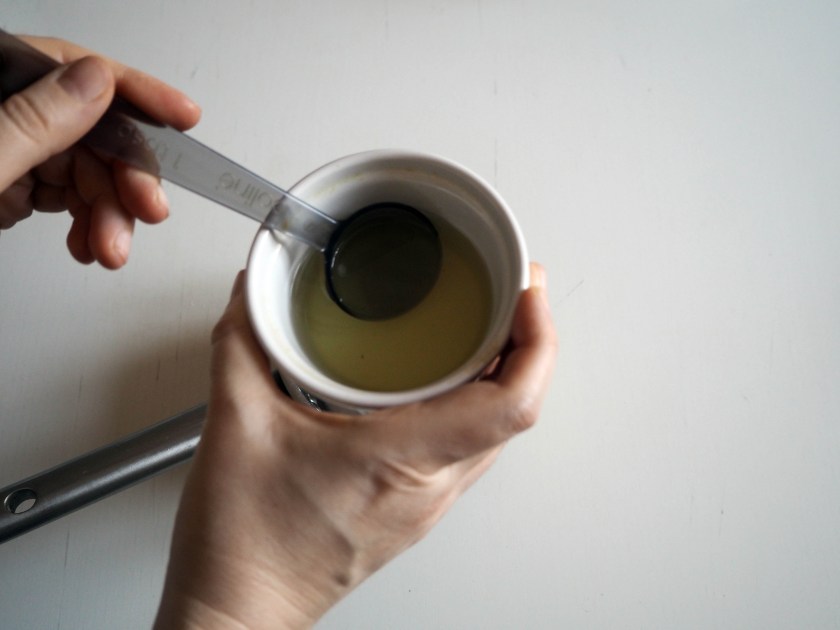 2. In a small bowl, put apple cider vinegar and coconut coffee cream (or soy milk) and whisk a little. Put aside to let it curdle.