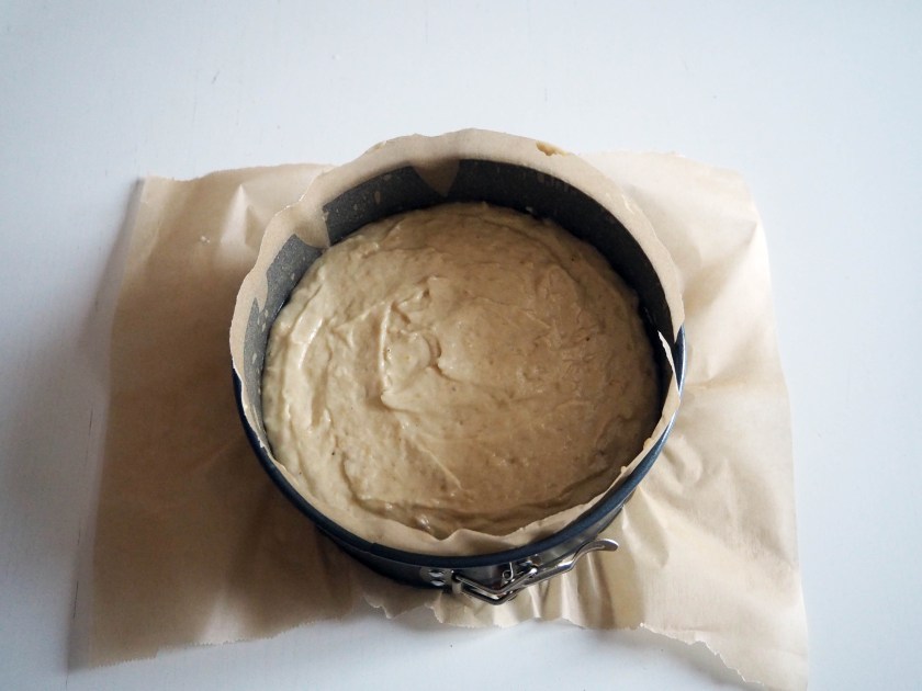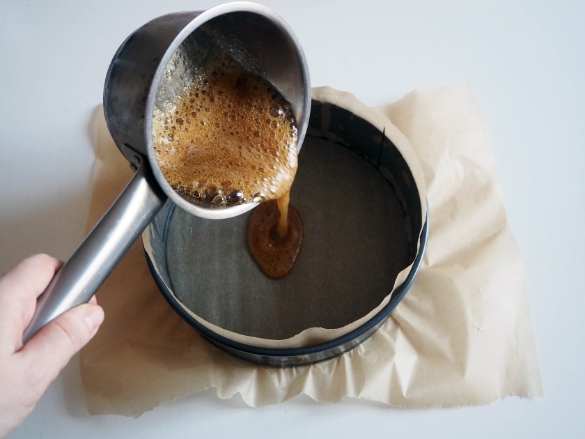 1. Preheat the oven to 180C. Grease a 22cm cake pan (I used springform) with canola oil and cover the base with a baking paper. I put the baking in between two parts of springform pan as seen in the photo, as a rather big piece in case a bit of caramel leaks out while baking (which, it did!).