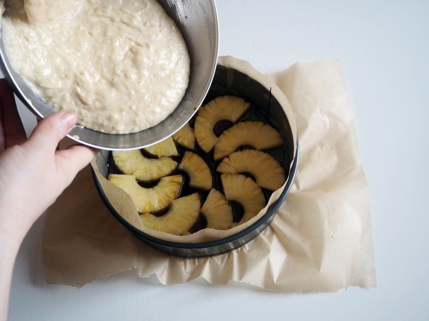 I did upside down cakes a few times before – with oranges, apples and pears. But I think the best result came out with pineapple. In this version I halved each slice and arranged them like this. However, in another time I made it, I kept the slices as a whole and put a cherries in the middle of each slice, and it was equally beautiful, so feel free to arrange however you like!