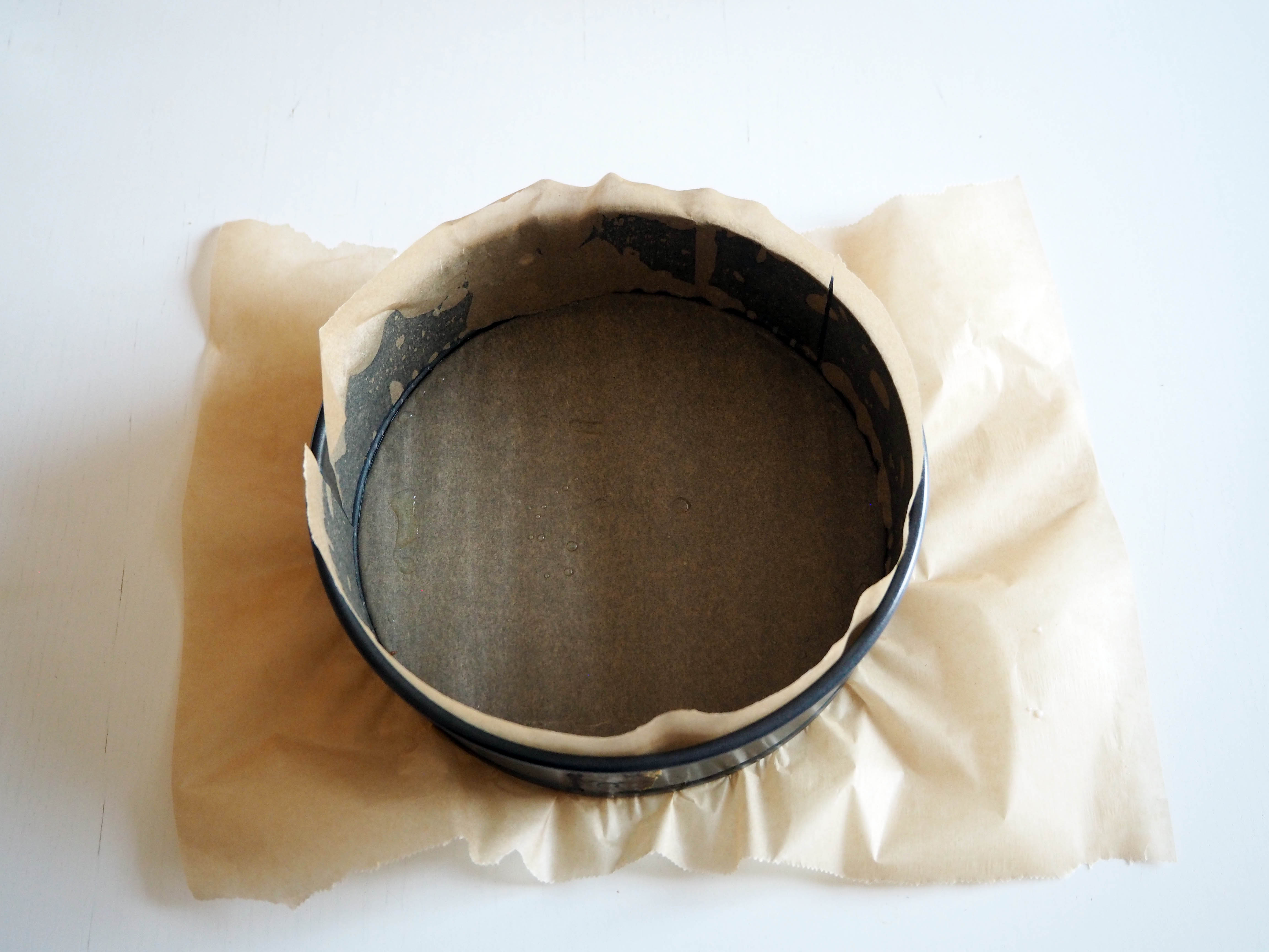 1. Preheat the oven to 180C. Grease a 22cm cake pan (I used springform) with canola oil and cover the base with a baking paper. I put the baking in between two parts of springform pan as seen in the photo, as a rather big piece in case a bit of caramel leaks out while baking (which, it did!).