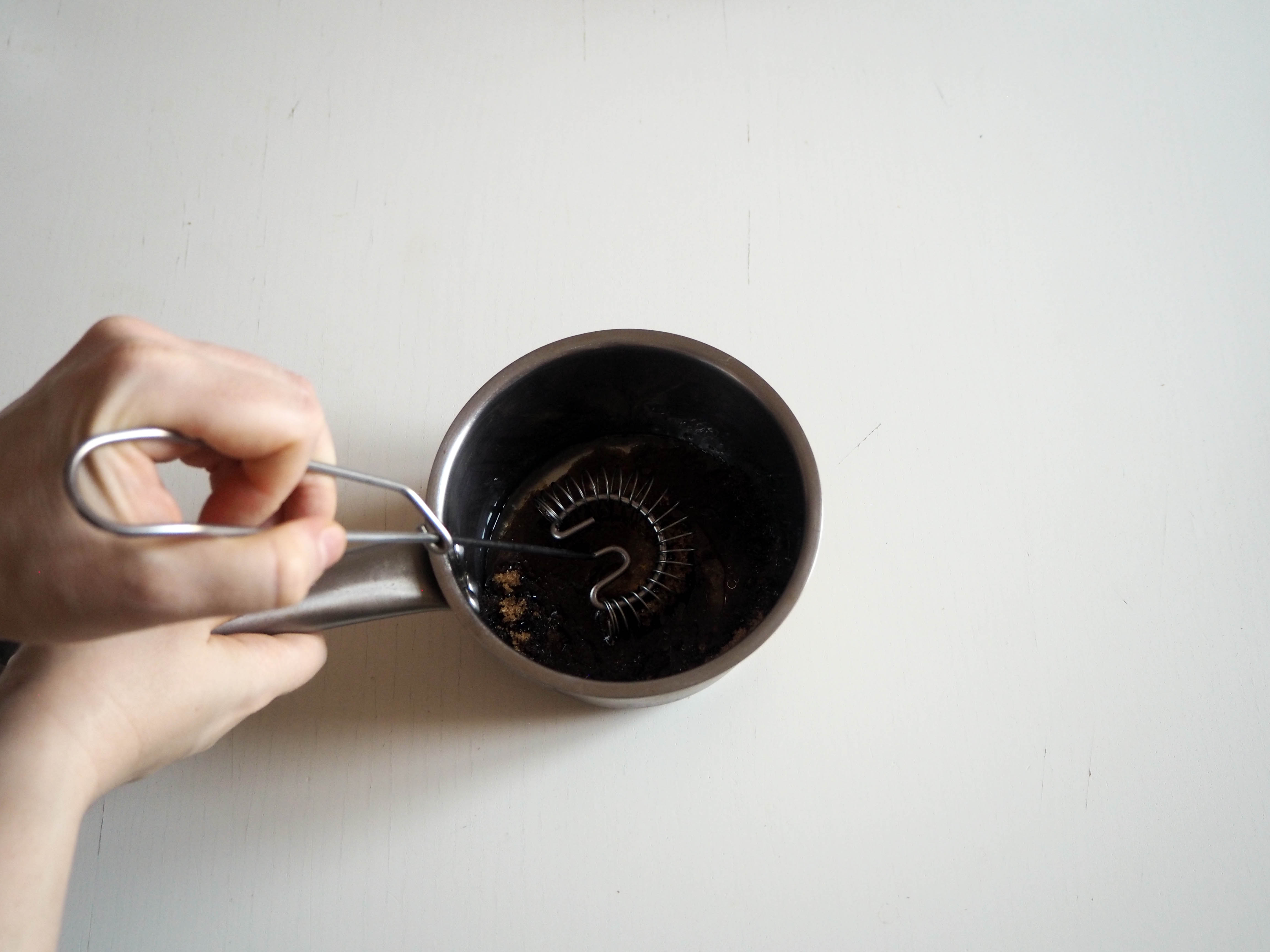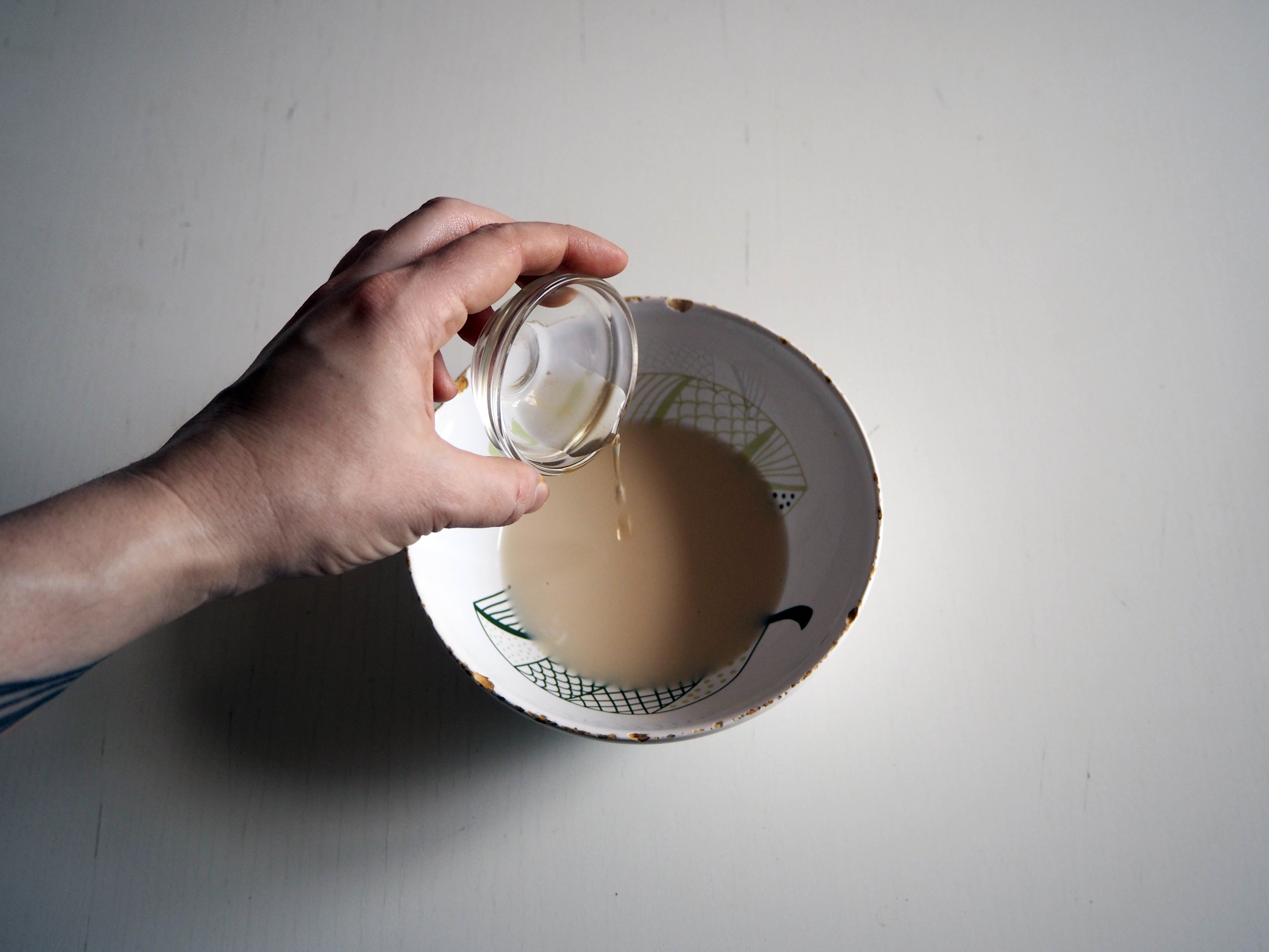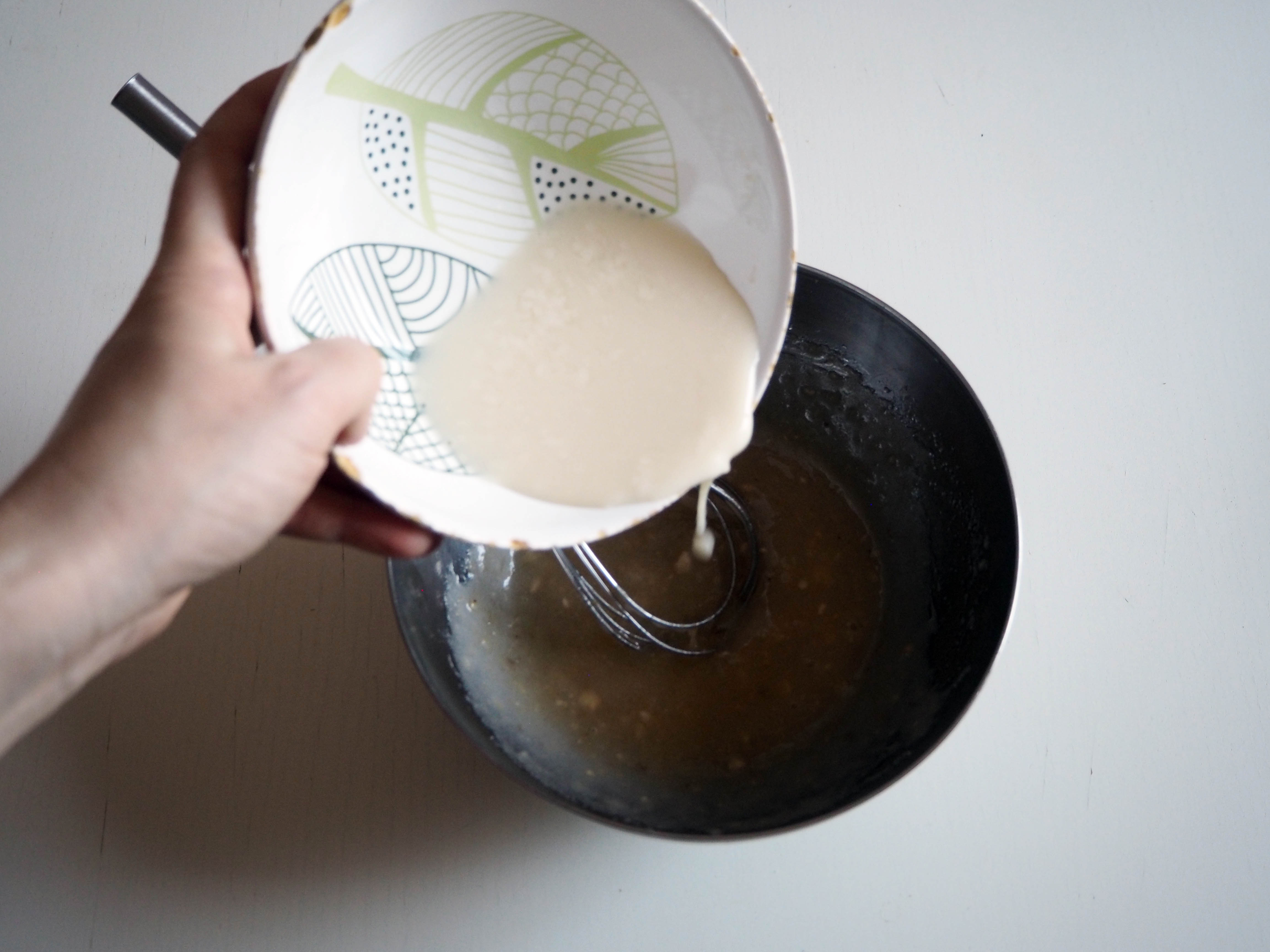 2. In a small bowl, put apple cider vinegar and coconut coffee cream (or soy milk) and whisk a little. Put aside to let it curdle.