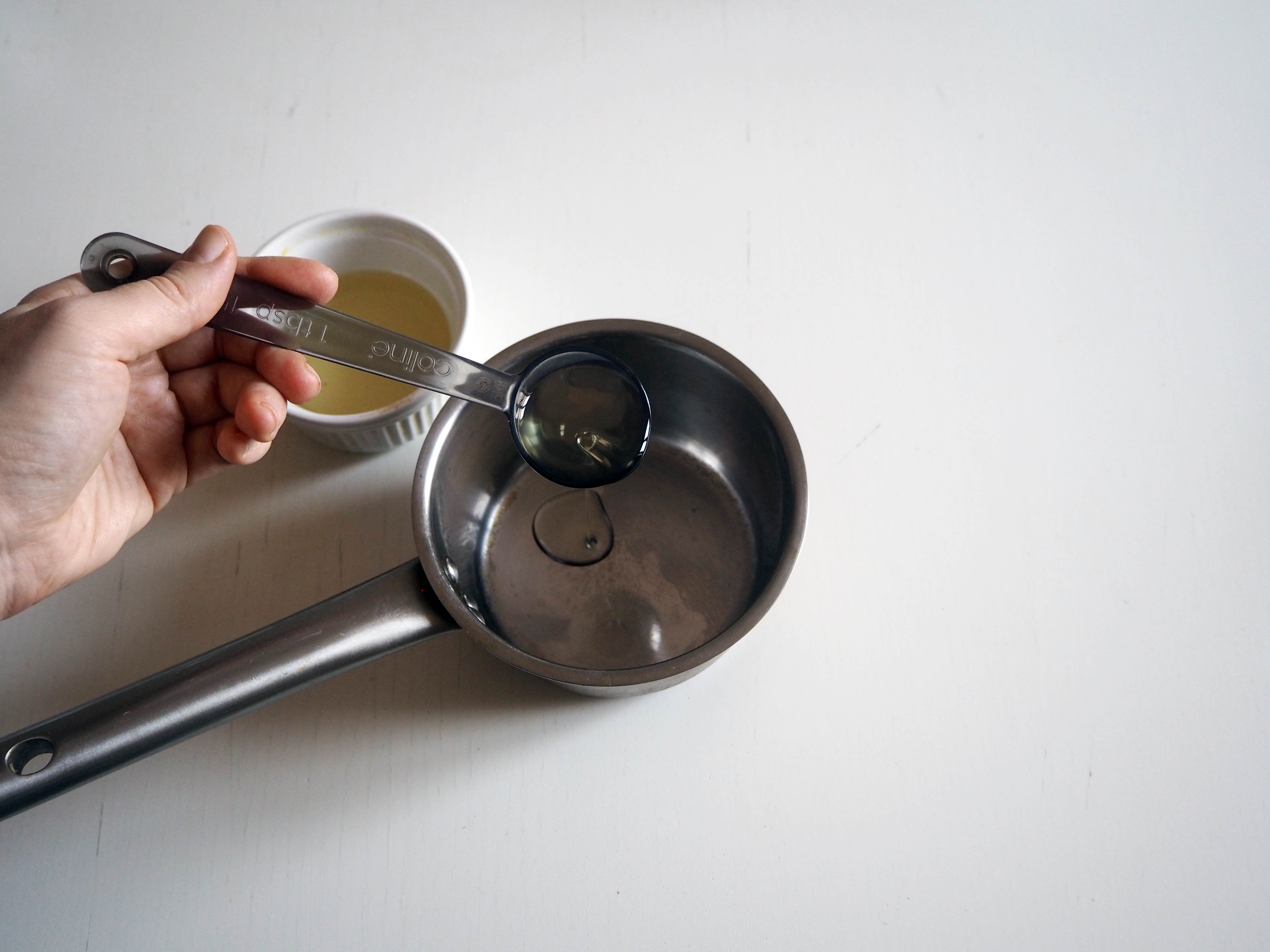 4. Take 1 tbsp from the canola oil and put it in a small saucepan together with pineapple juice and brown sugar. Whisk and put on medium heat. Let it boil while continuing to whisk and cook for 1 more minute after boiling.