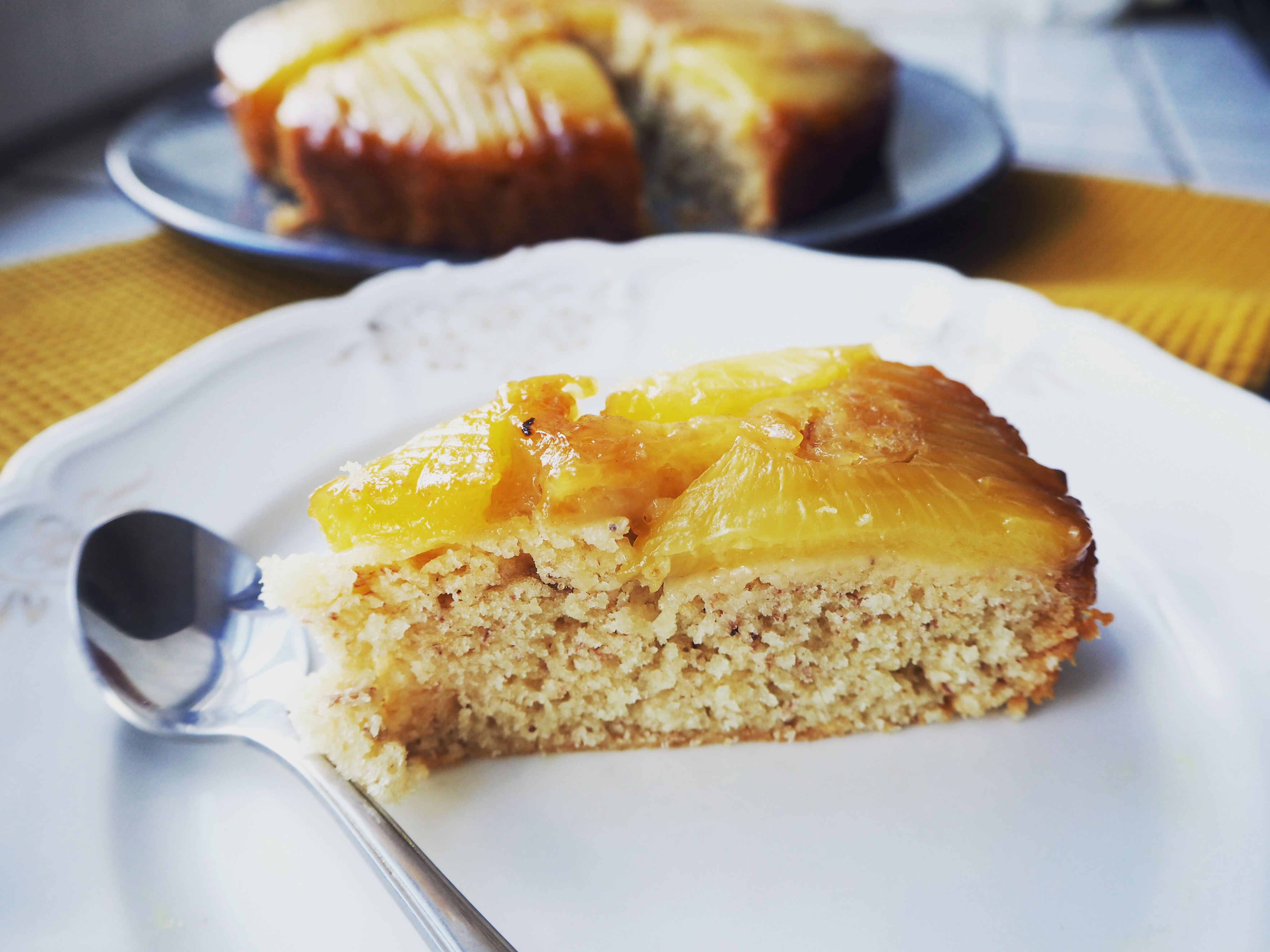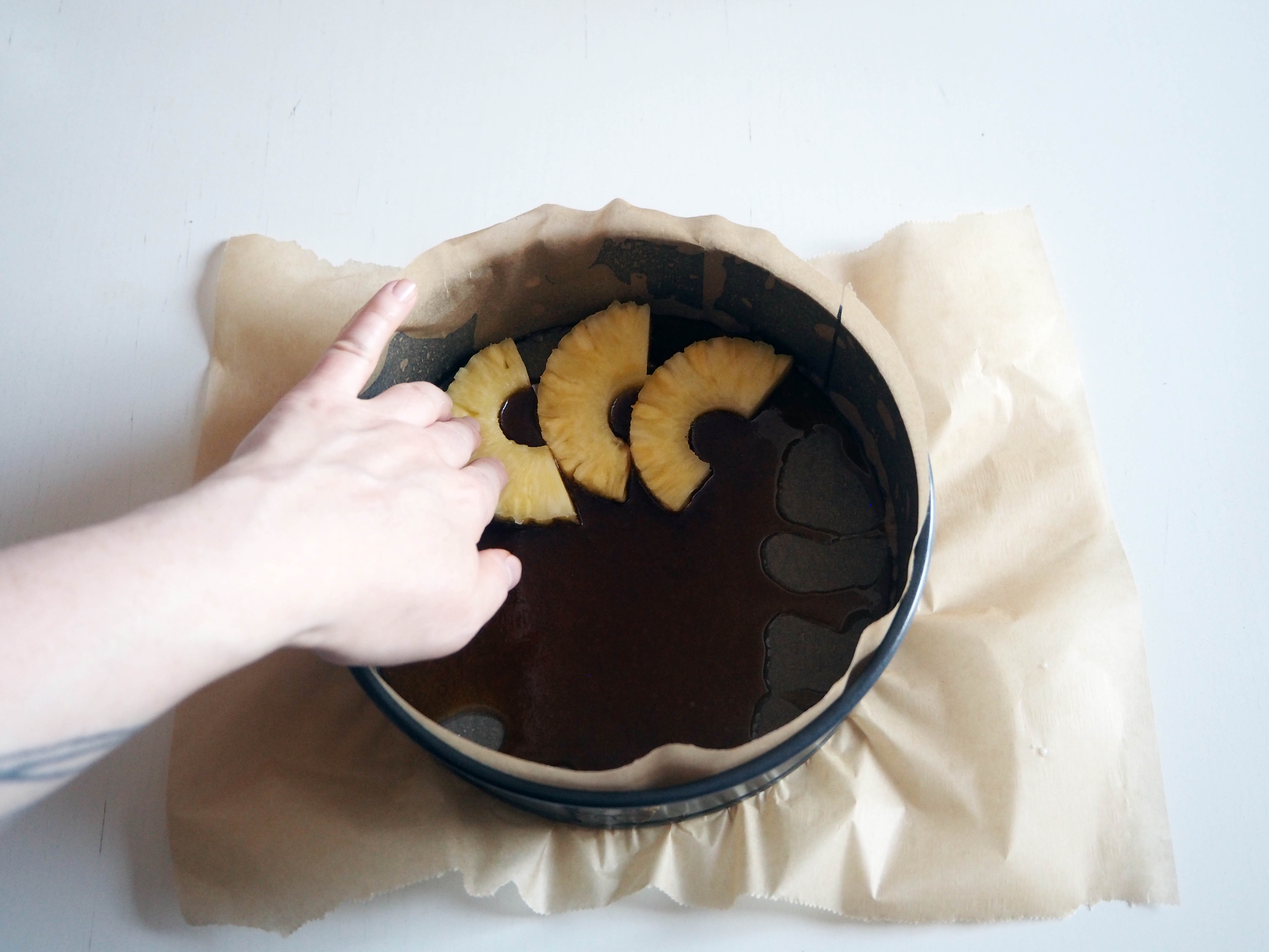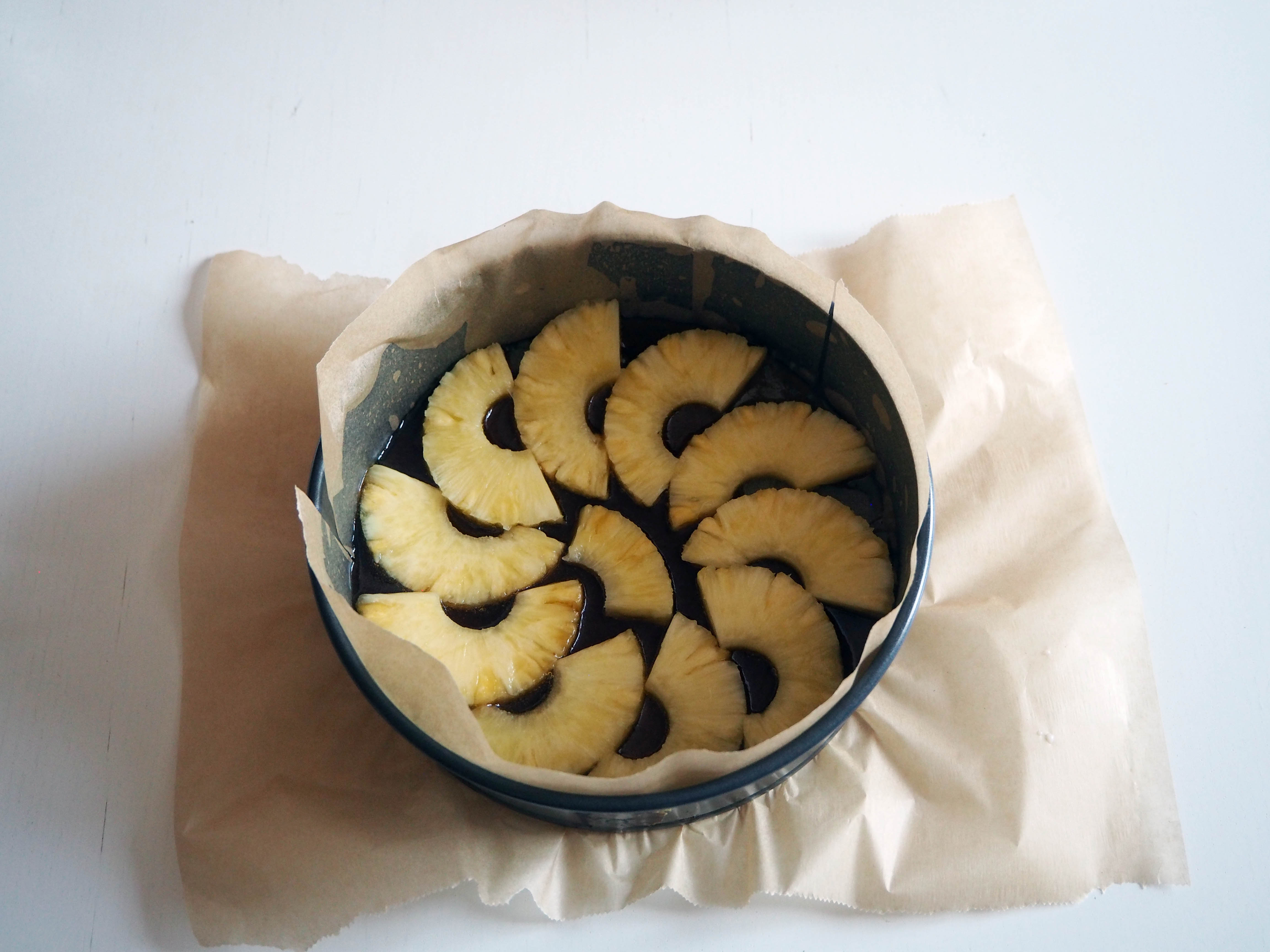 I did upside down cakes a few times before – with oranges, apples and pears. But I think the best result came out with pineapple. In this version I halved each slice and arranged them like this. However, in another time I made it, I kept the slices as a whole and put a cherries in the middle of each slice, and it was equally beautiful, so feel free to arrange however you like!