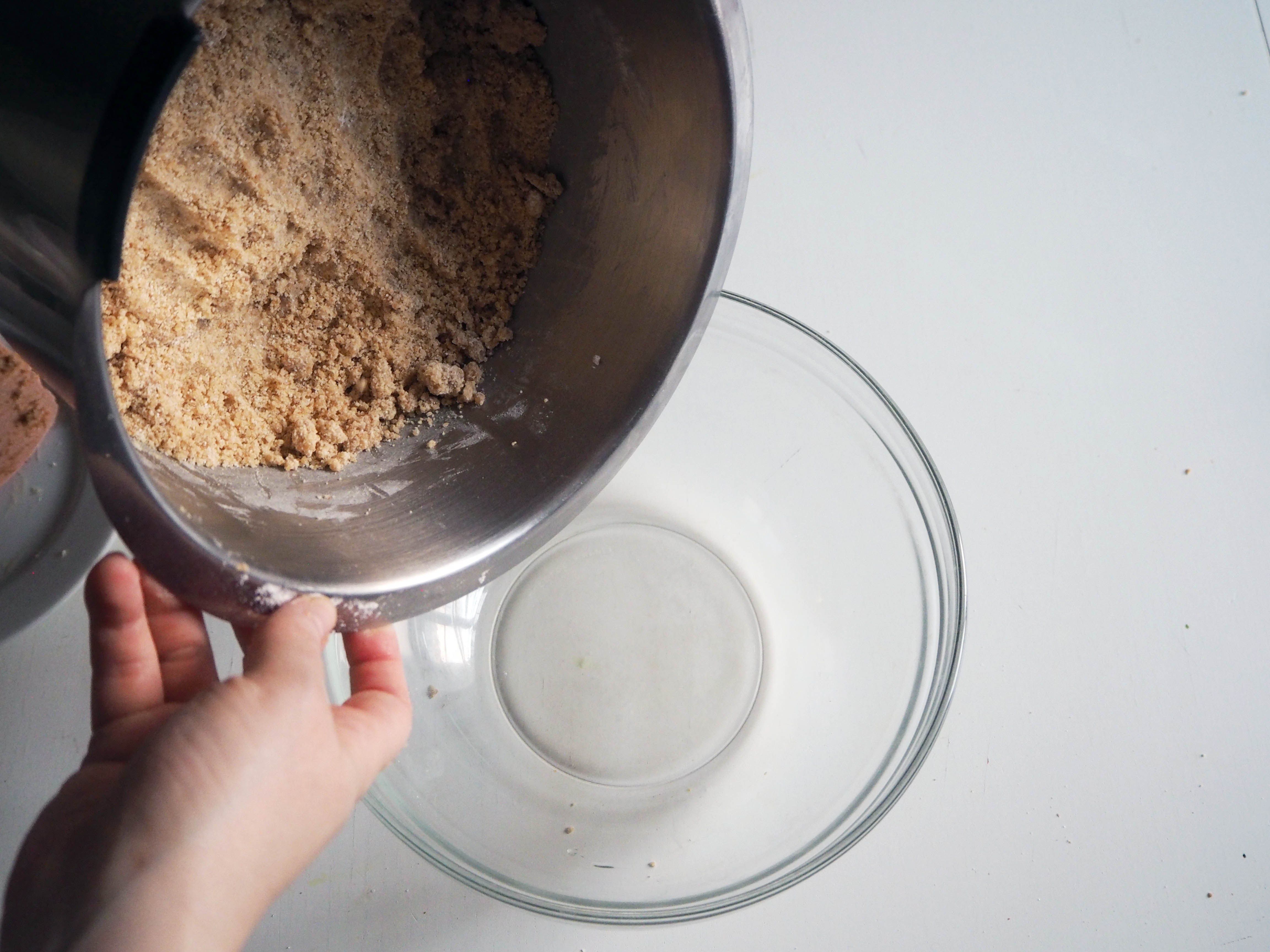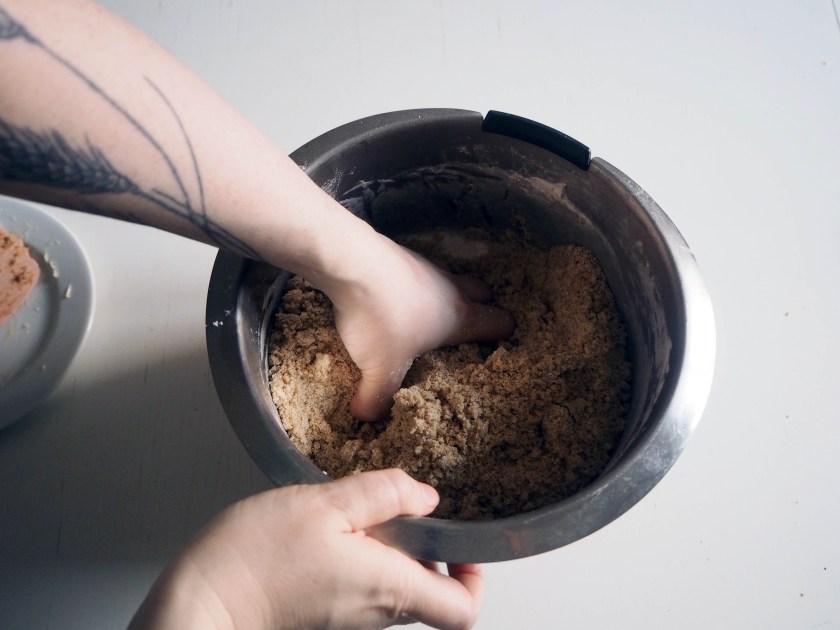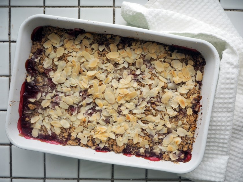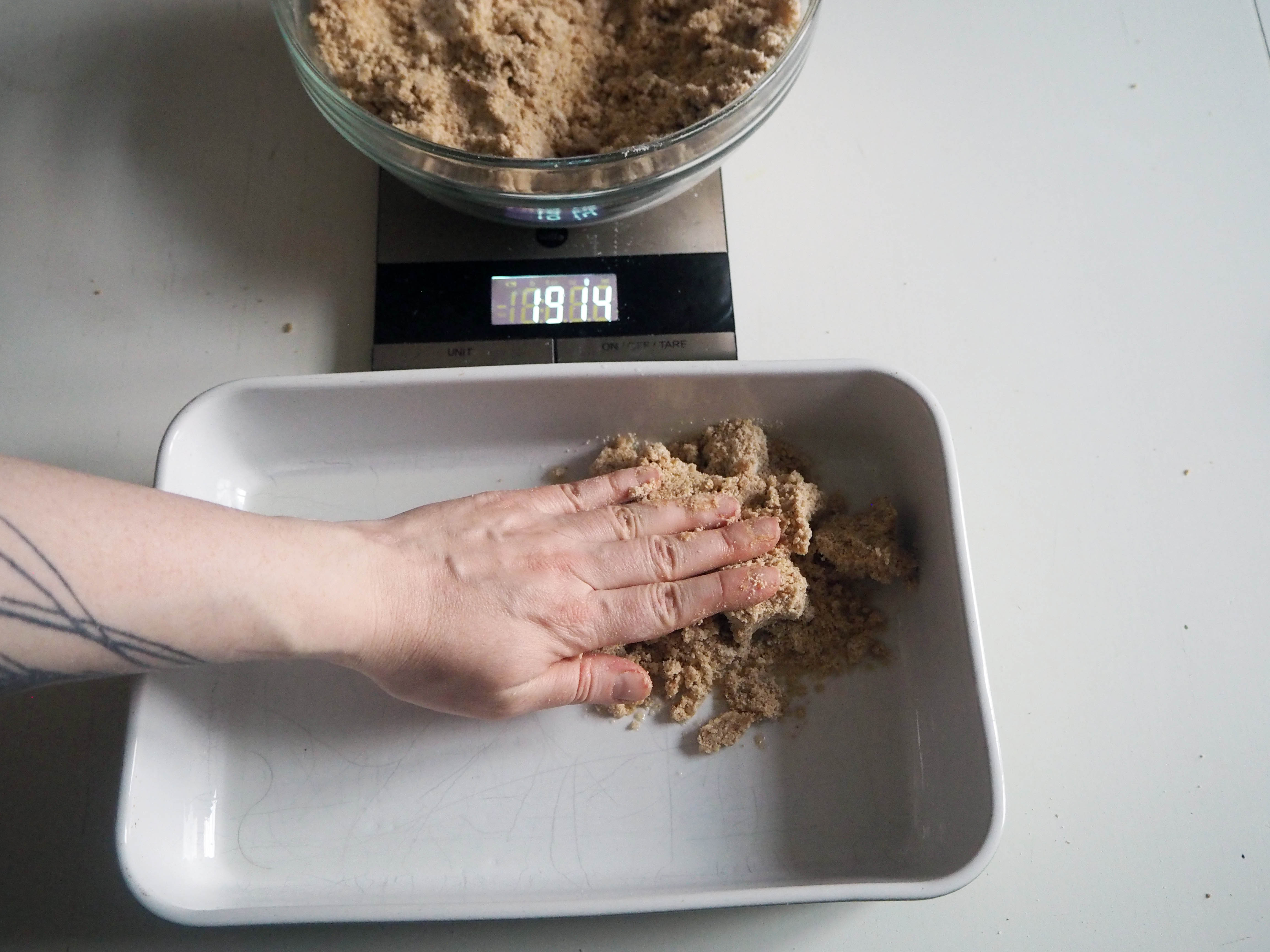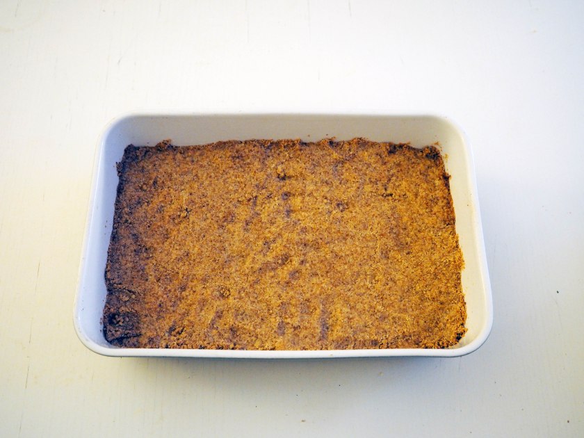 If you have a rectangle or square tin with removable base, I would recommend to use that one to be honest. I didn’t have any so I baked in a ceramic oven dish. It was alright to bake in that, however it was a little hard to take away the pieces.