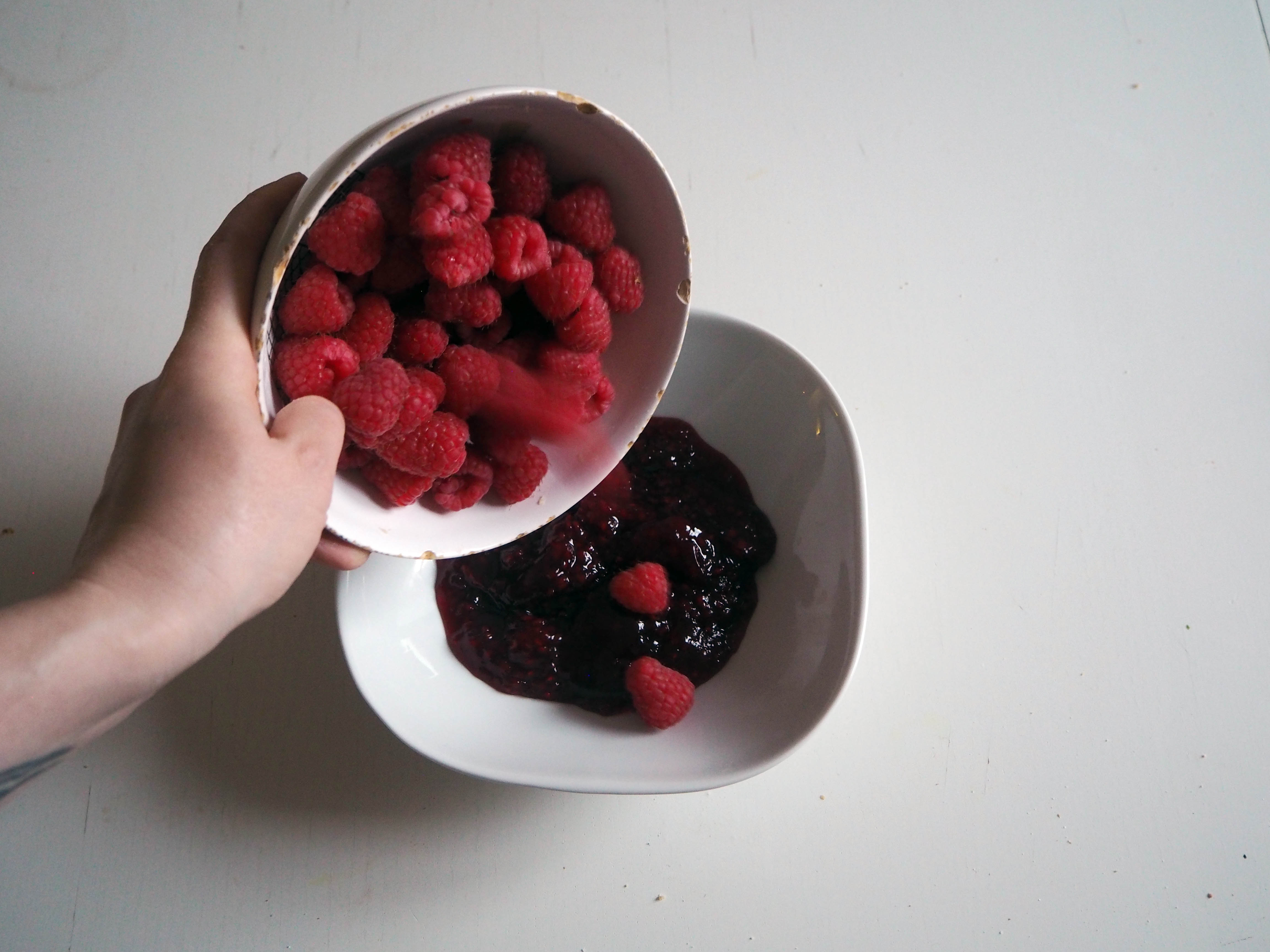 6. While the first step of baking is happening, in a medium bowl, put raspberries and jam. Using a fork, squash the raspberries a little into the jam.