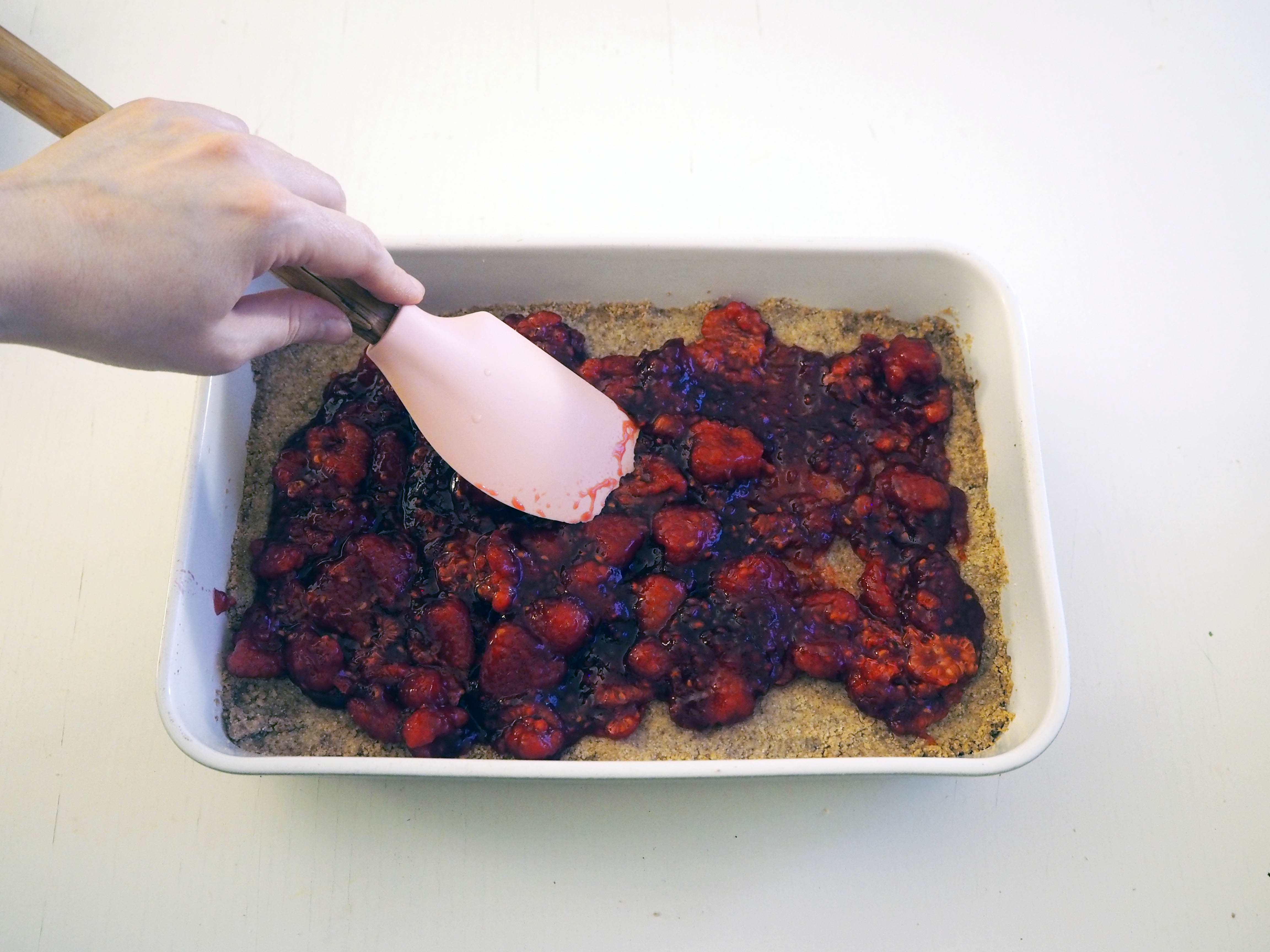 7. Take out the partially baked batter out of the oven, spread raspberry mixture on top of it evenly with a spatula.