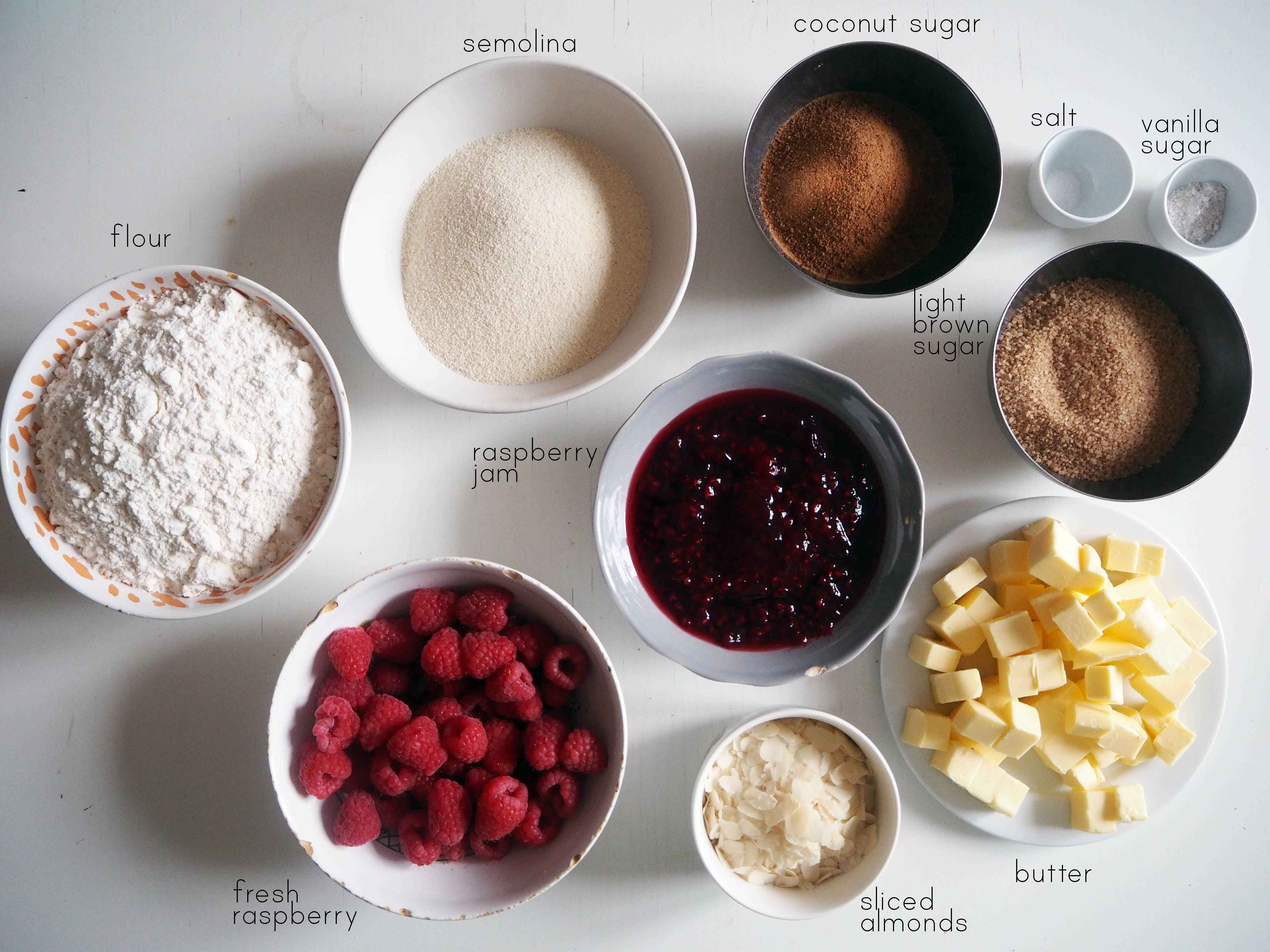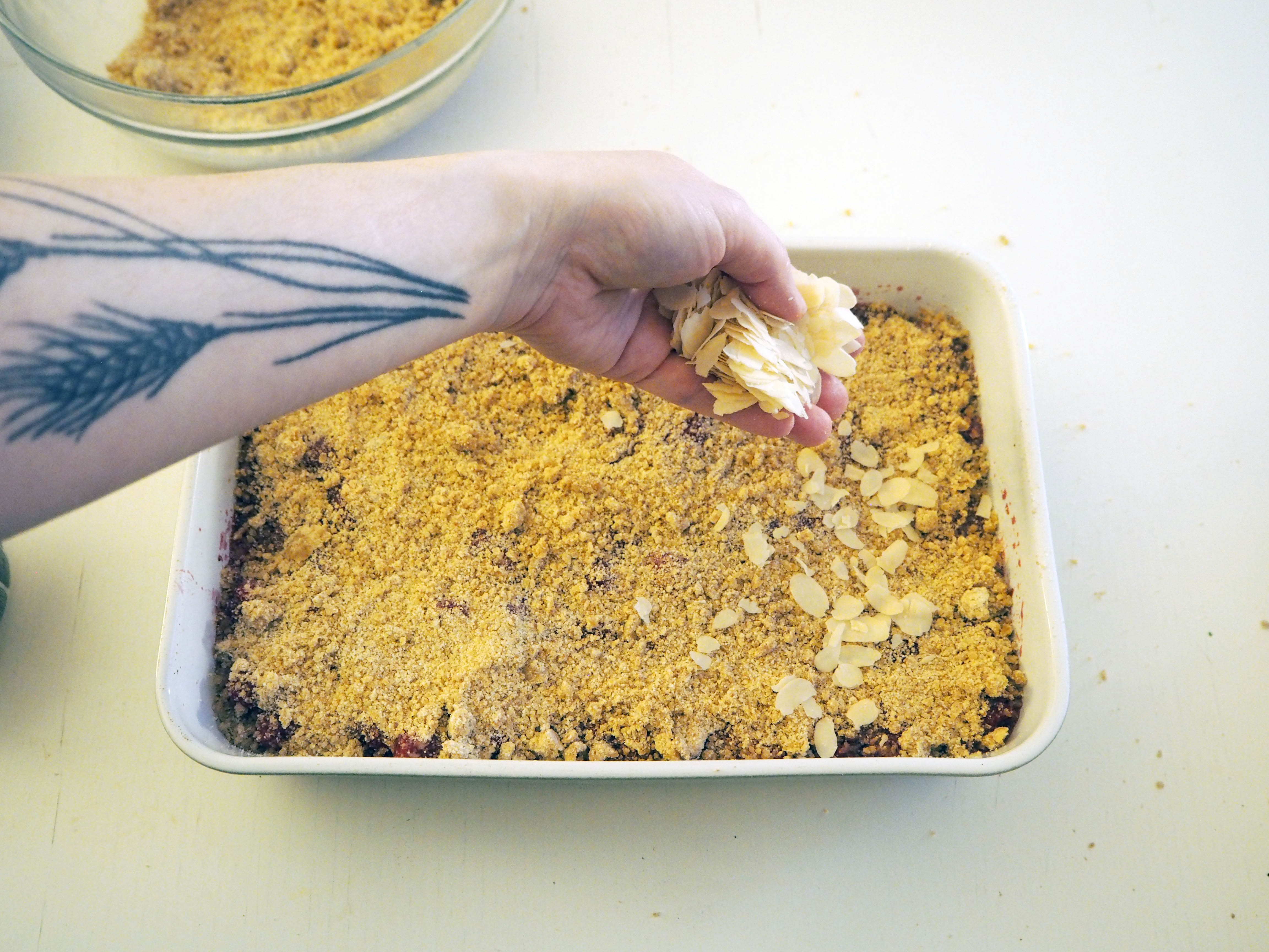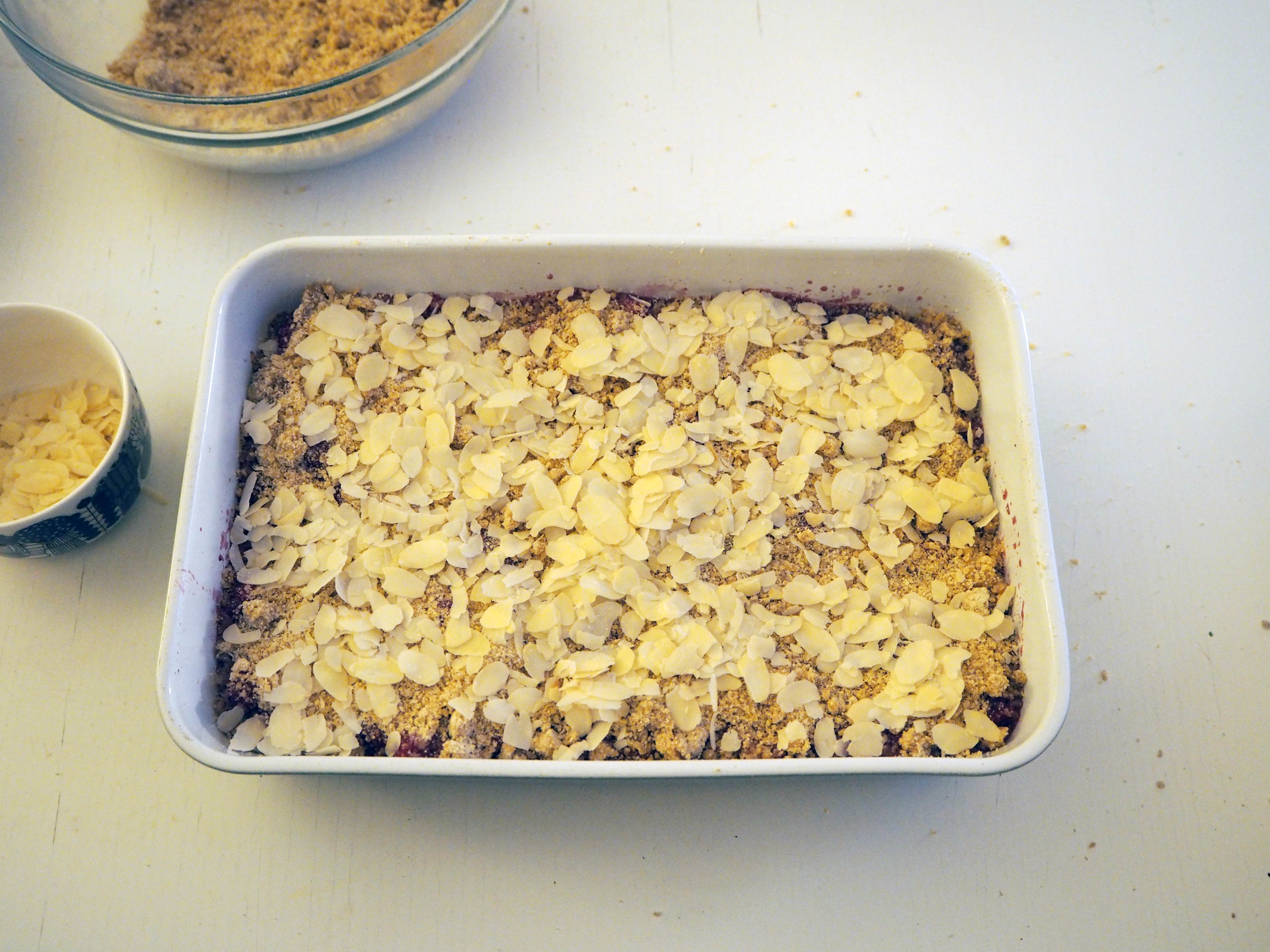 8. Spread the remaining batter on top of raspberry mixture and finally, spread sliced almonds to cover the whole surface. Put the dish back in the oven and continue to bake for about 30-35 minutes, until the surface gets golden brown. When it is baked, take out of the oven and let it cool to room temperature, then cut in slices. Enjoy with fresh tea or coffee!