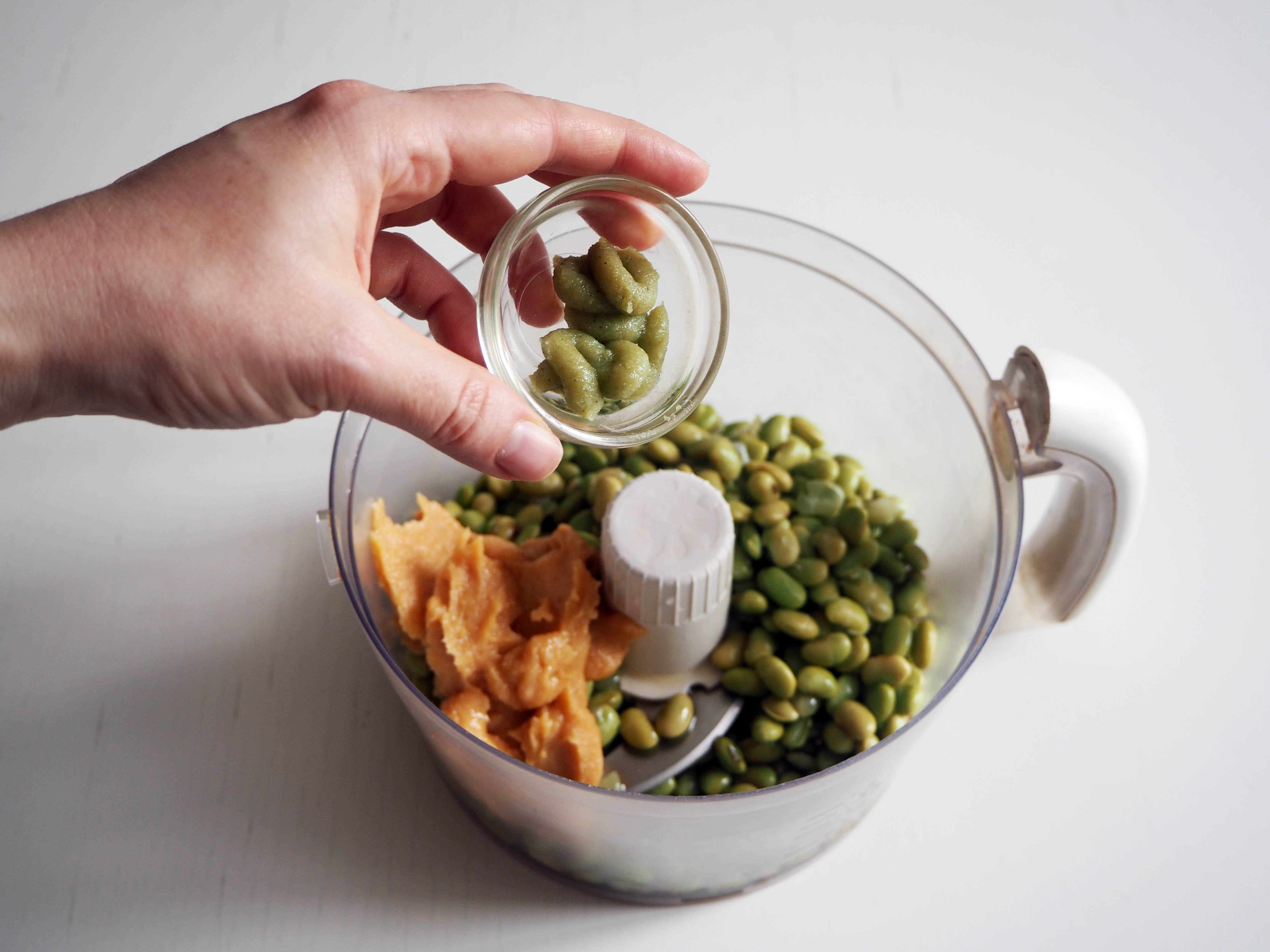 3.5 dl (or 1 1/2 cups or 200 gr) frozen or fresh edamame beans, cooked and drained
