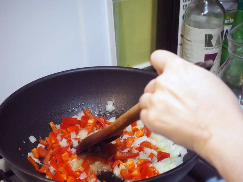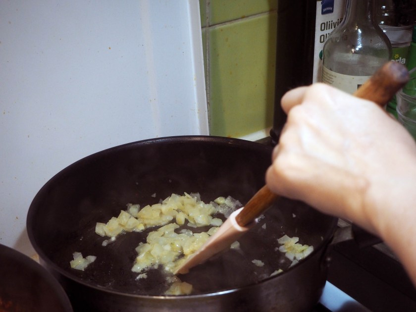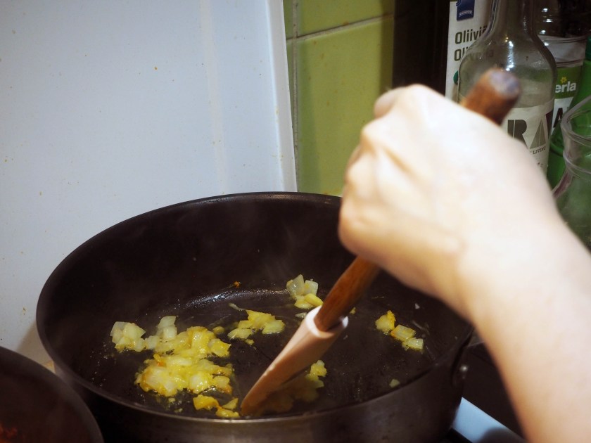 1. In a large and deep pan (I actually used a wok) put olive oil on medium high heat and let it warm for half a minute. Then add onions and saute for 2-3 minutes, until the onion starts to get translucent.