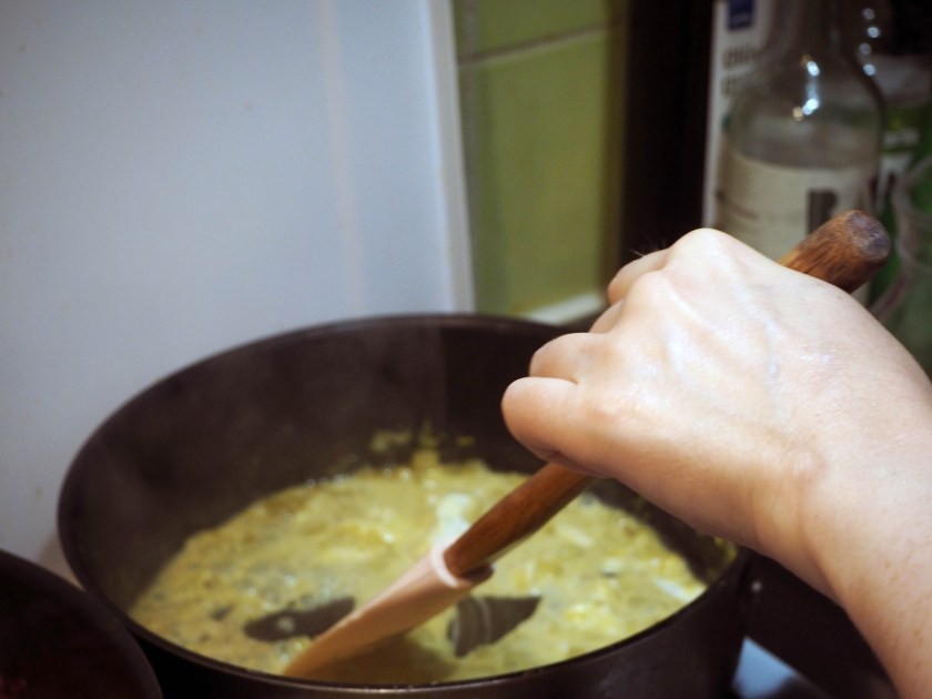 10. Add turmeric and continue to stir until everything is coated in turmeric’s yellow colour.