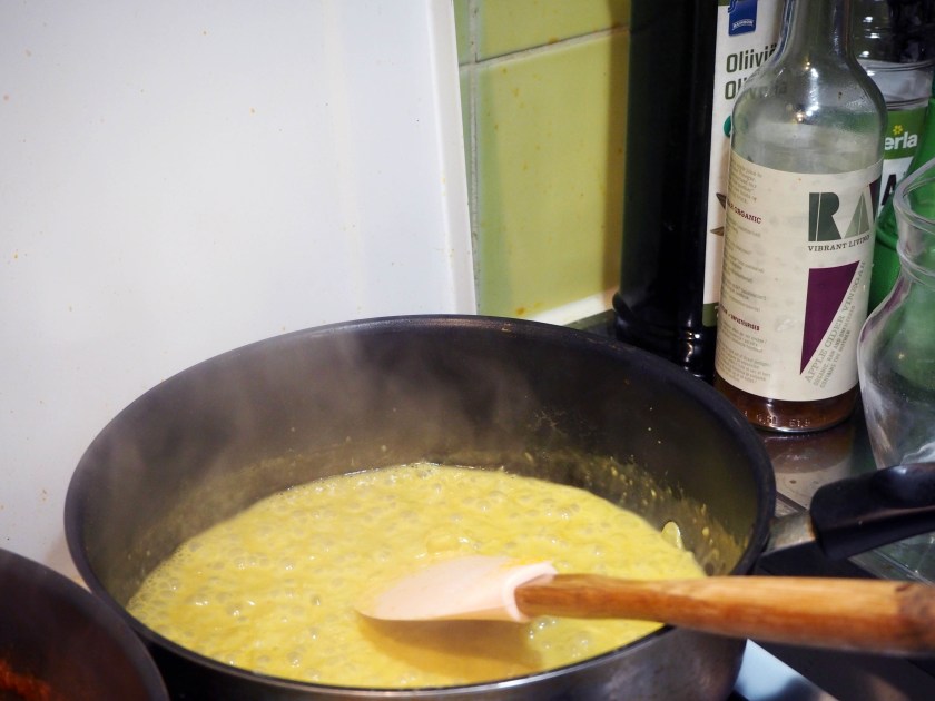 12. Add dairy-free creme fraîche and stir. Let the mixture cook for a few minutes while some of the creme fraiche evaporates. (A TIP: You can also use this tofu scramble recipe without the whole tomato sauce and shakshouka part. But if you are going to eat it like scrambled eggs, increase the amount of creme fraiche to 2 dl – or 3/4 cup + 4 tsp – and do not evaporate it much, so that your tofu scramble becomes creamier).