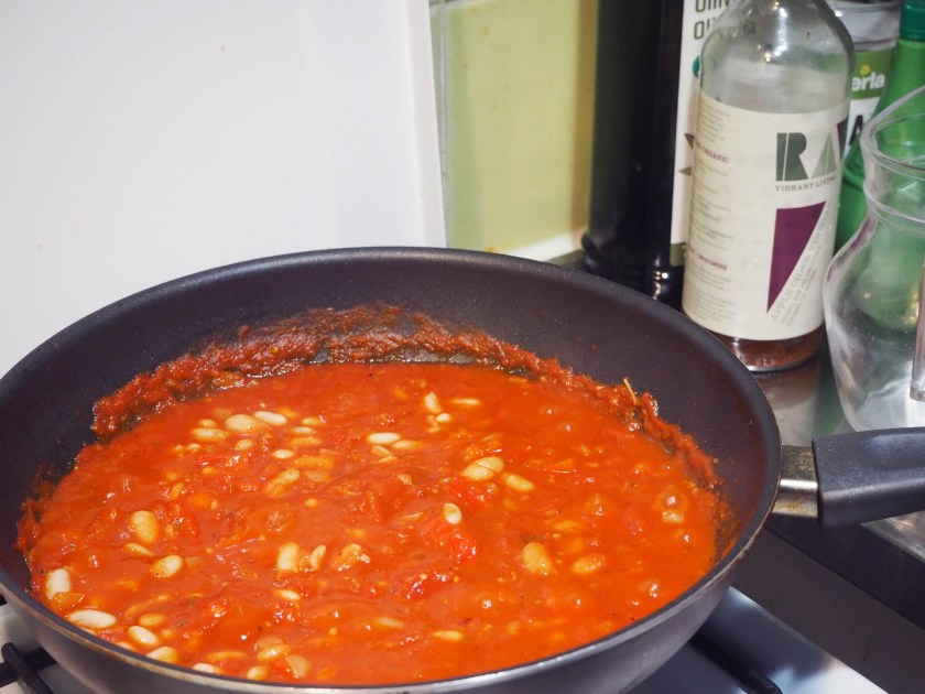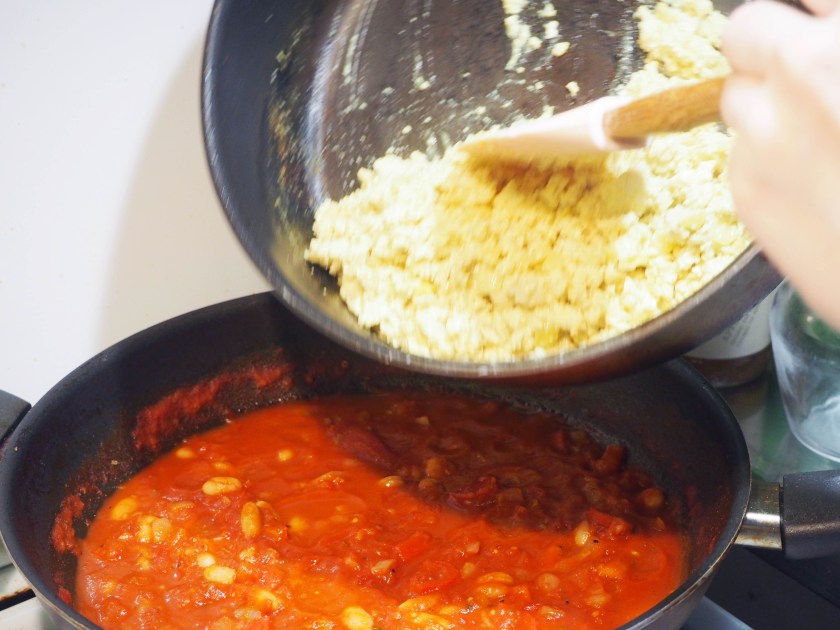 6. Add cannellini beans and stir. Lower the heat to medium and let the sauce cook while making the tofu scramble.