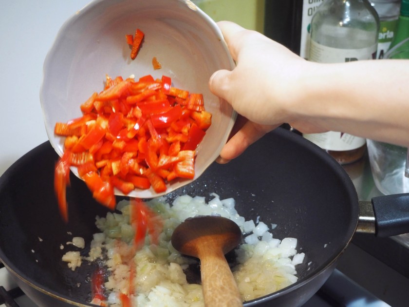 3. Add diced red pepper and cook them altogether by frequently stirring, for about 5 minutes.
