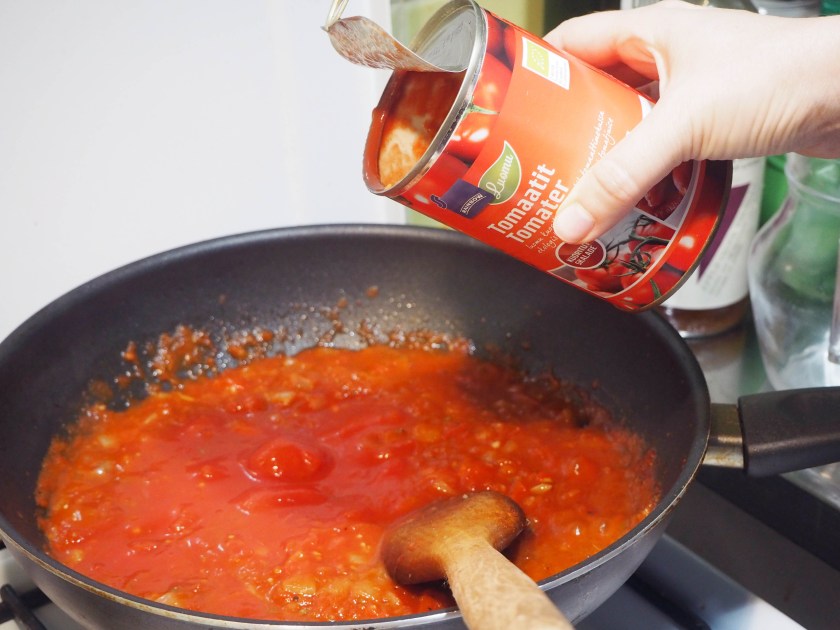 5. Add whole canned tomato and crush the tomatoes using the wooden spoon. Stir well and let it cook for a couple of minutes.