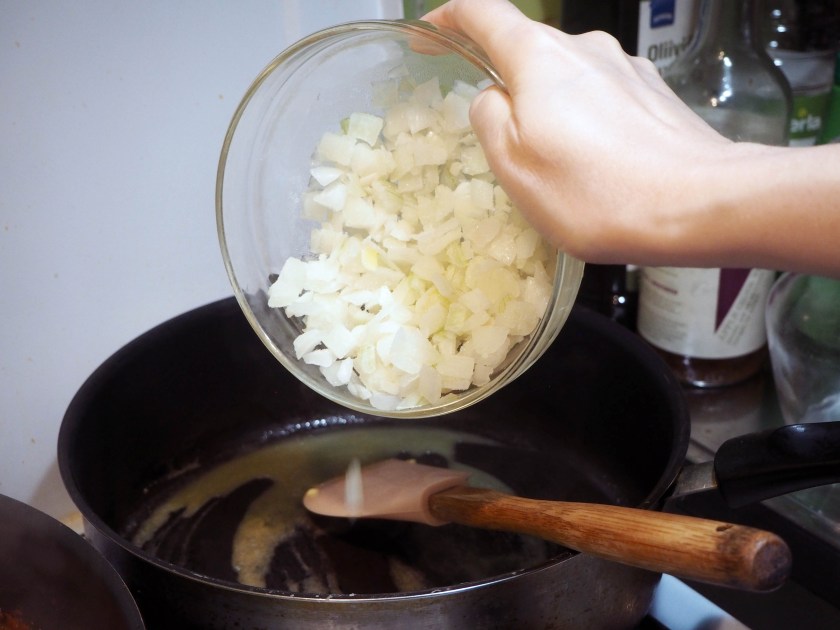 8. When butter melts, add onion and saute for a few of minutes until the onion gets translucent and cooks quite fine, if not fully.
