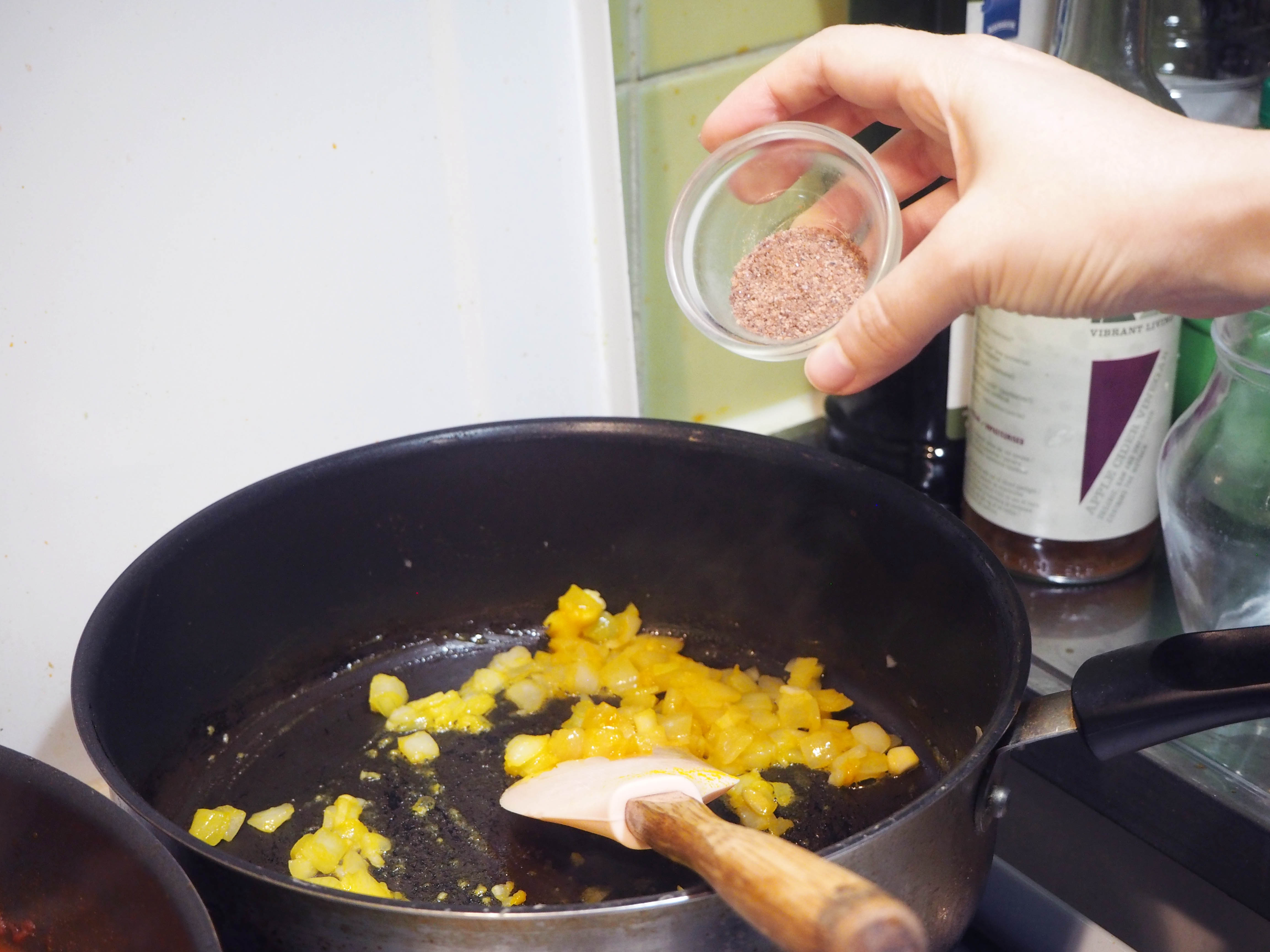 10. Add turmeric and continue to stir until everything is coated in turmeric’s yellow colour.