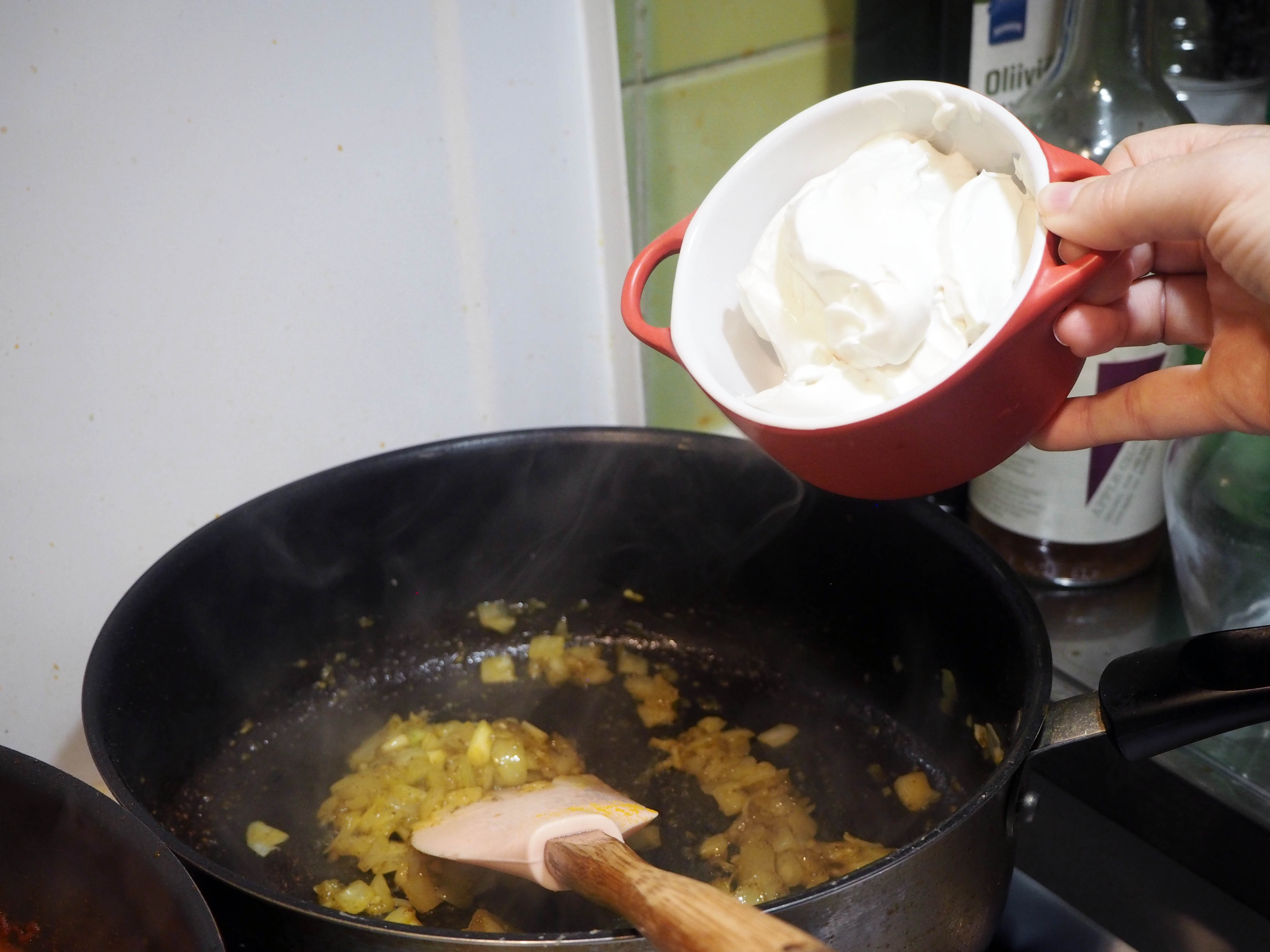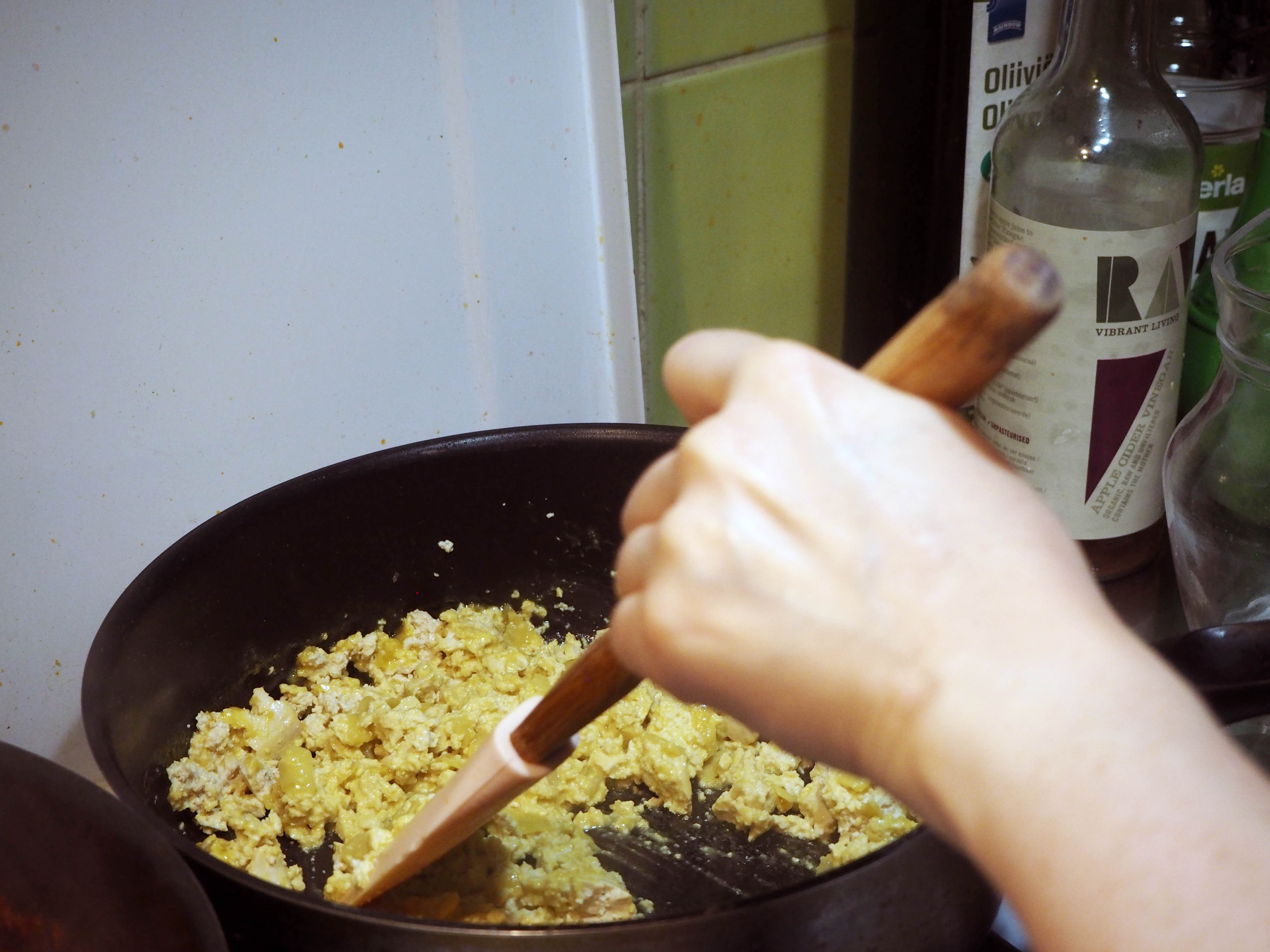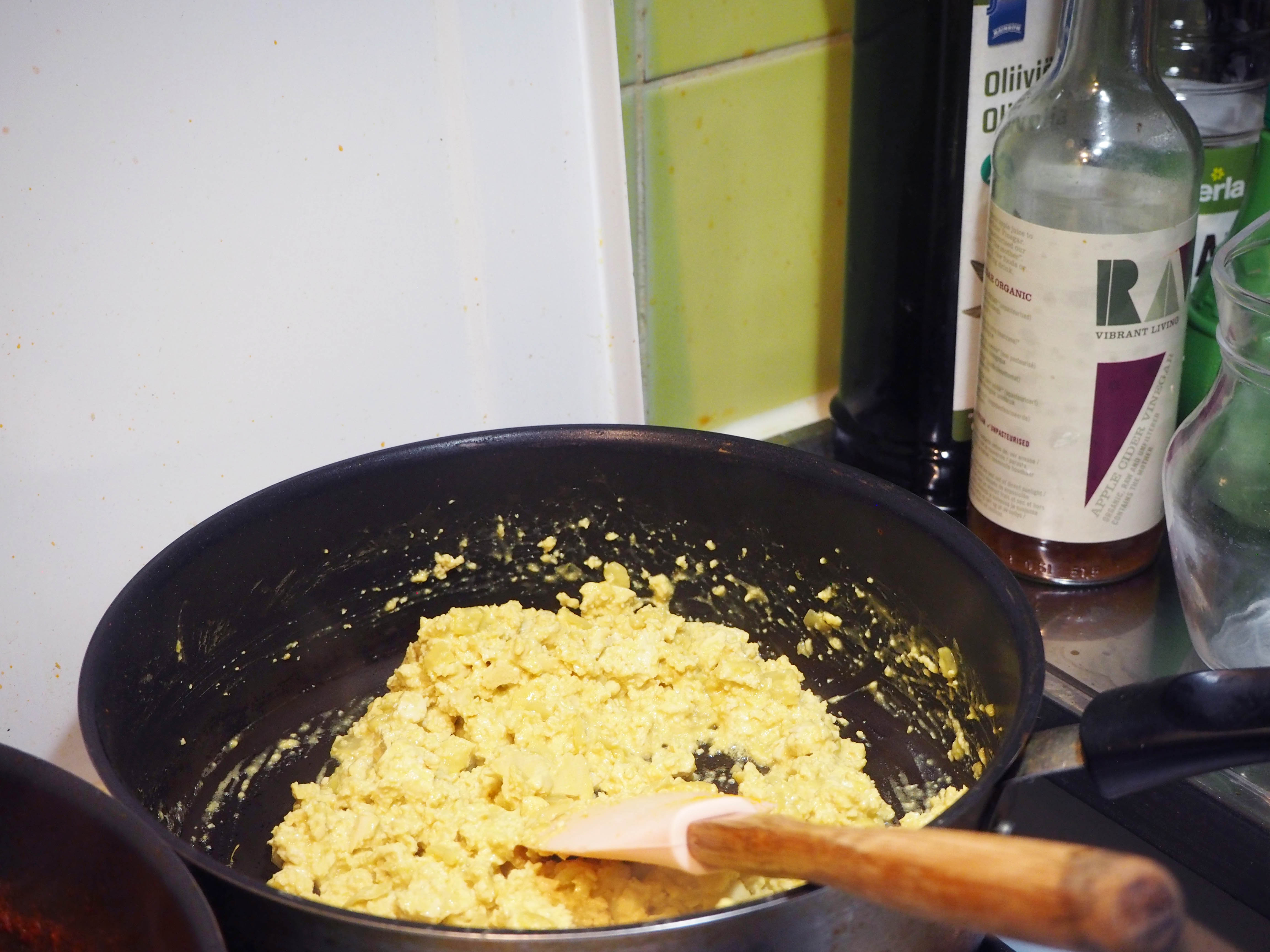 12. Add dairy-free creme fraîche and stir. Let the mixture cook for a few minutes while some of the creme fraiche evaporates. (A TIP: You can also use this tofu scramble recipe without the whole tomato sauce and shakshouka part. But if you are going to eat it like scrambled eggs, increase the amount of creme fraiche to 2 dl – or 3/4 cup + 4 tsp – and do not evaporate it much, so that your tofu scramble becomes creamier).