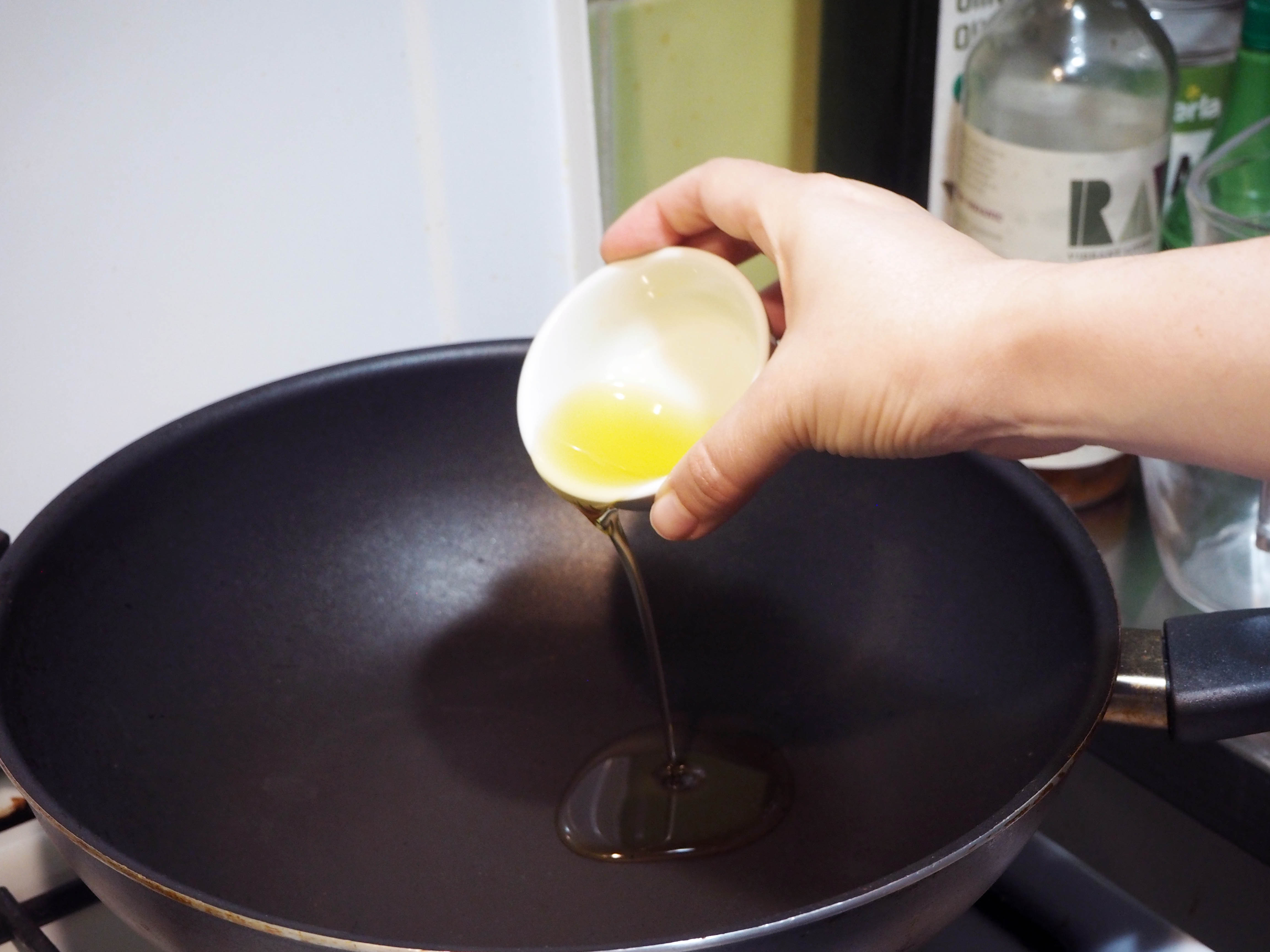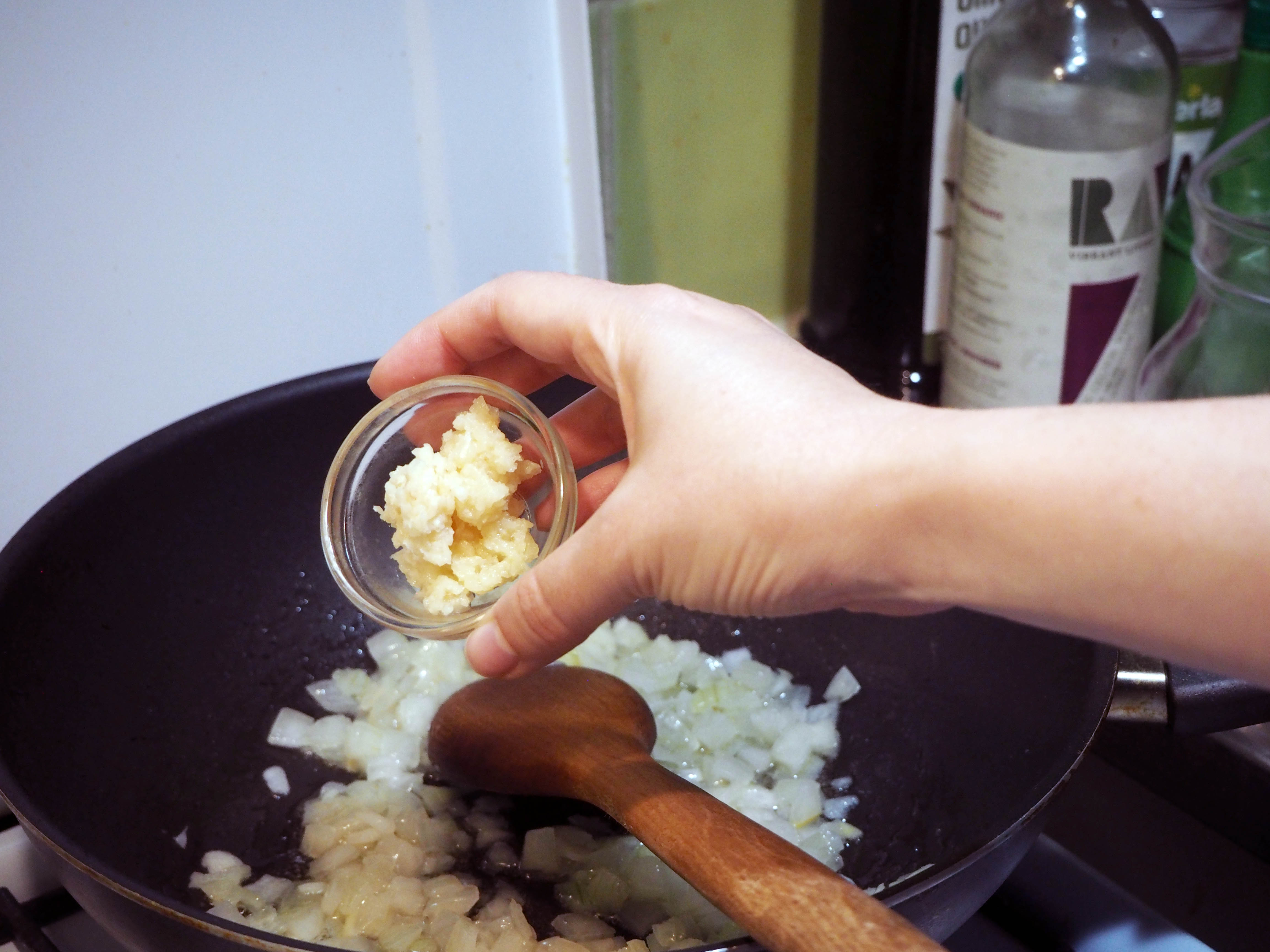 1. In a large and deep pan (I actually used a wok) put olive oil on medium high heat and let it warm for half a minute. Then add onions and saute for 2-3 minutes, until the onion starts to get translucent.