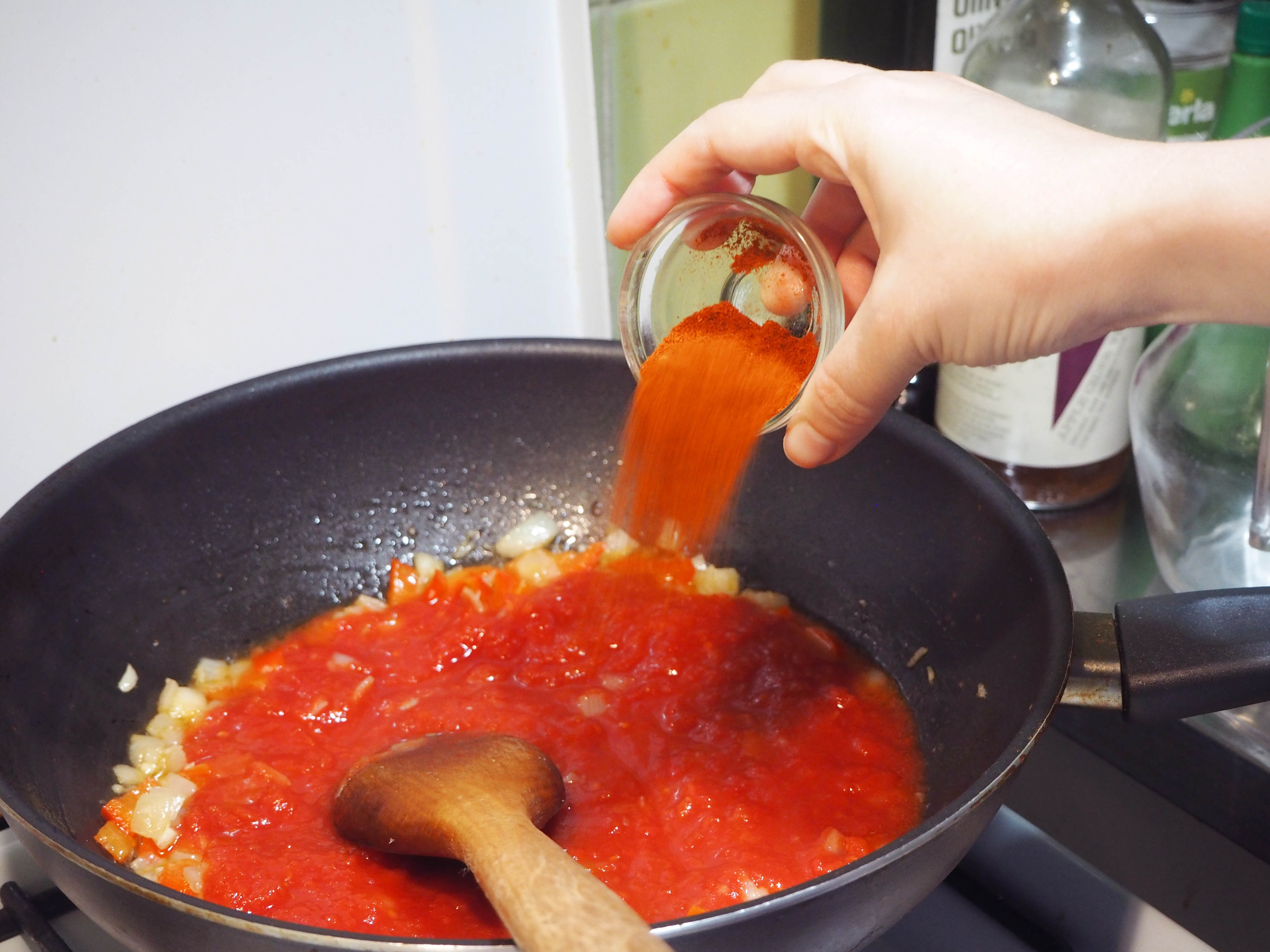 4. Add pureed canned tomato and all the spices (in the list above, starting with ground cumin and ending with ground paprika) and stir.