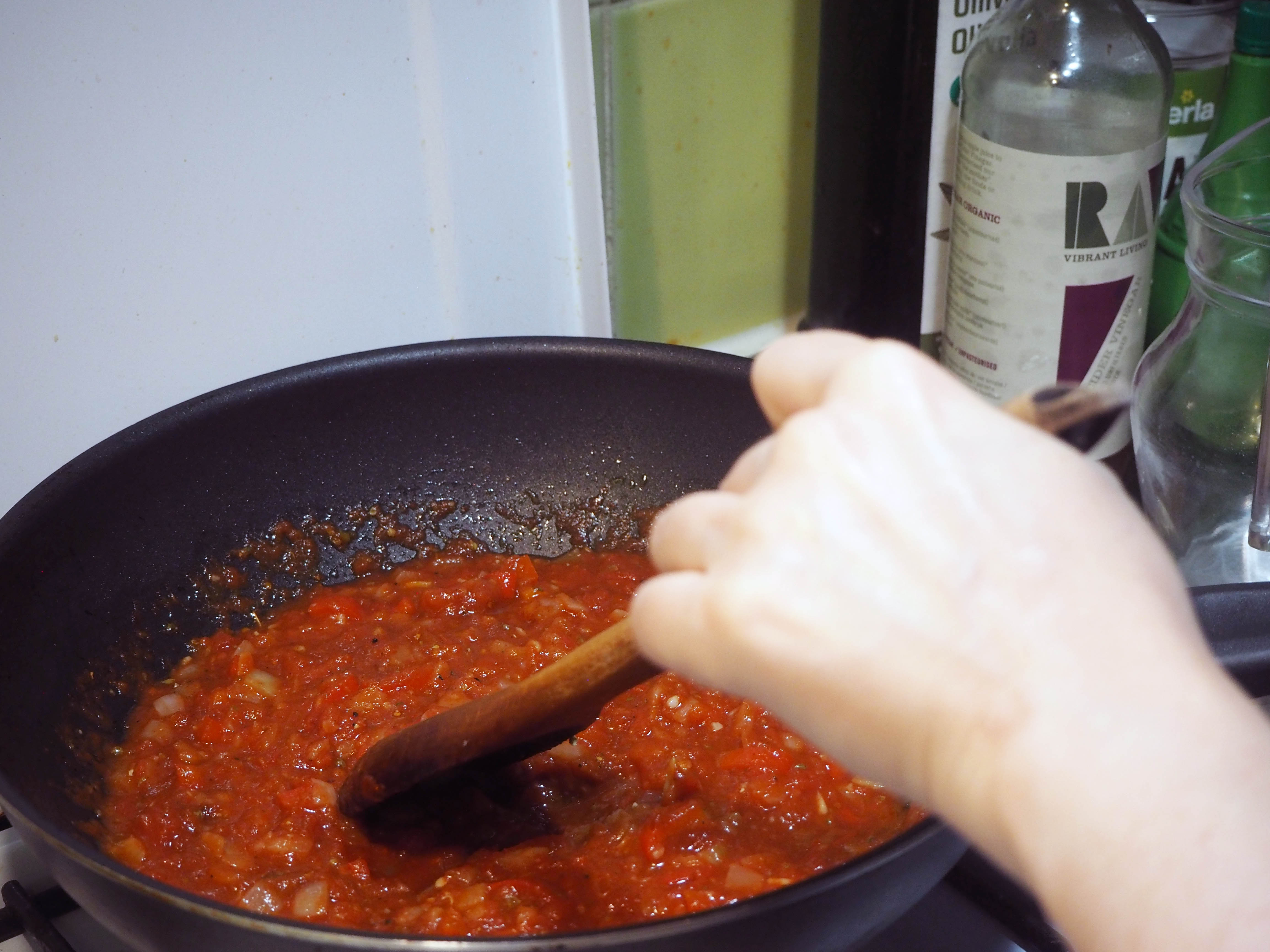 5. Add whole canned tomato and crush the tomatoes using the wooden spoon. Stir well and let it cook for a couple of minutes.