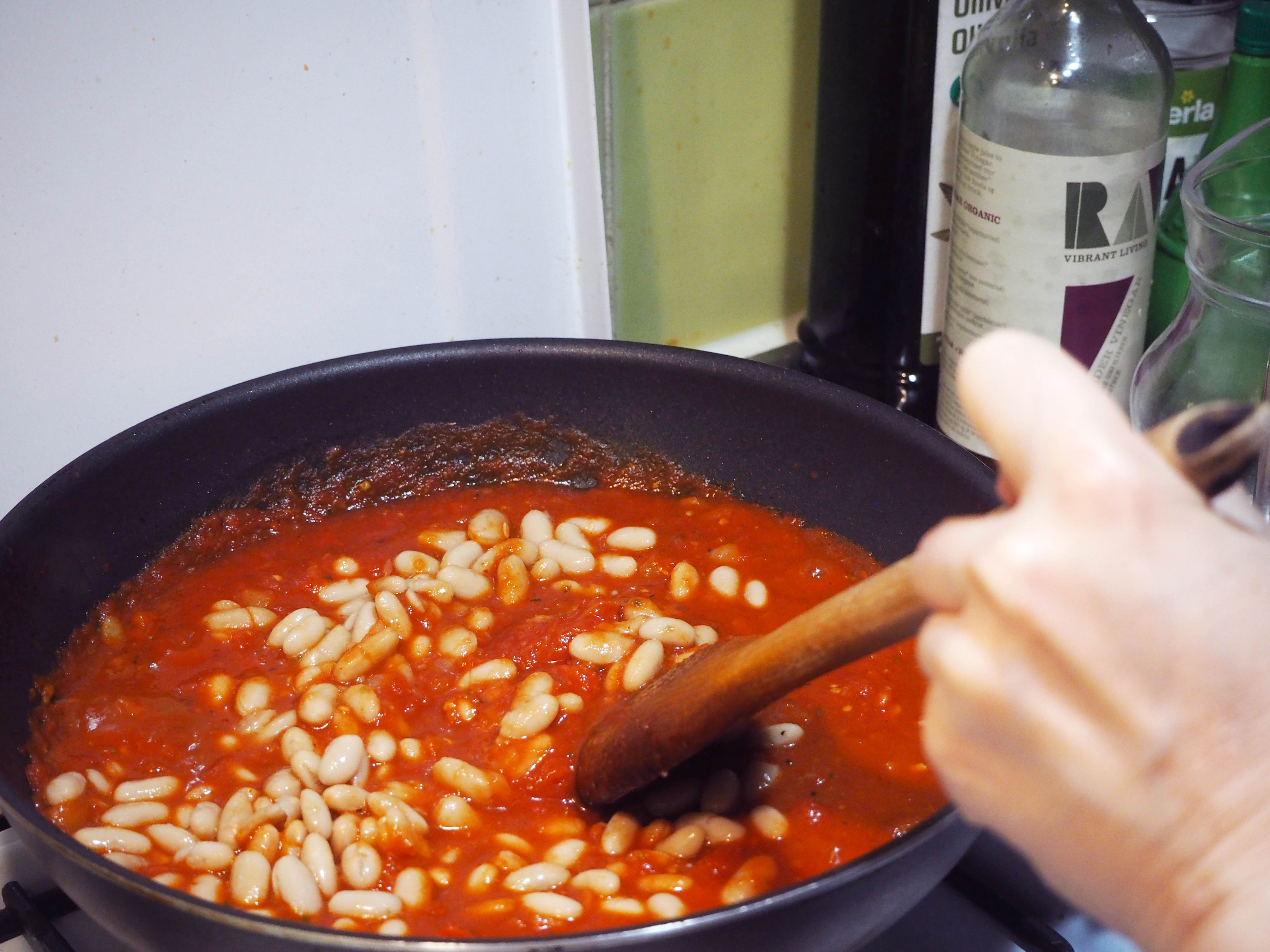 6. Add cannellini beans and stir. Lower the heat to medium and let the sauce cook while making the tofu scramble.