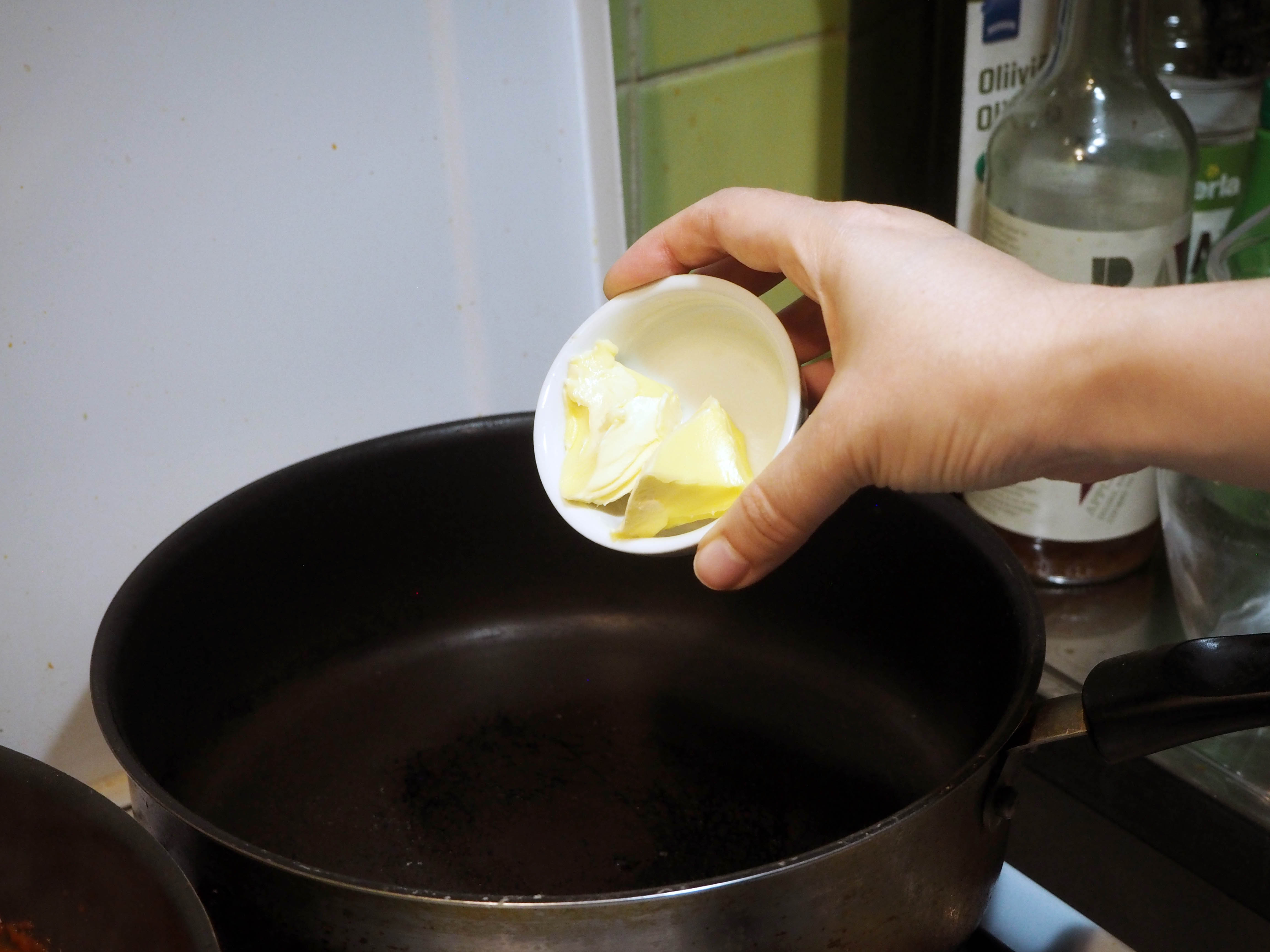 7. In another pan on medium heat, put dairy-free butter and let it melt while stirring to coat the base of the pan.