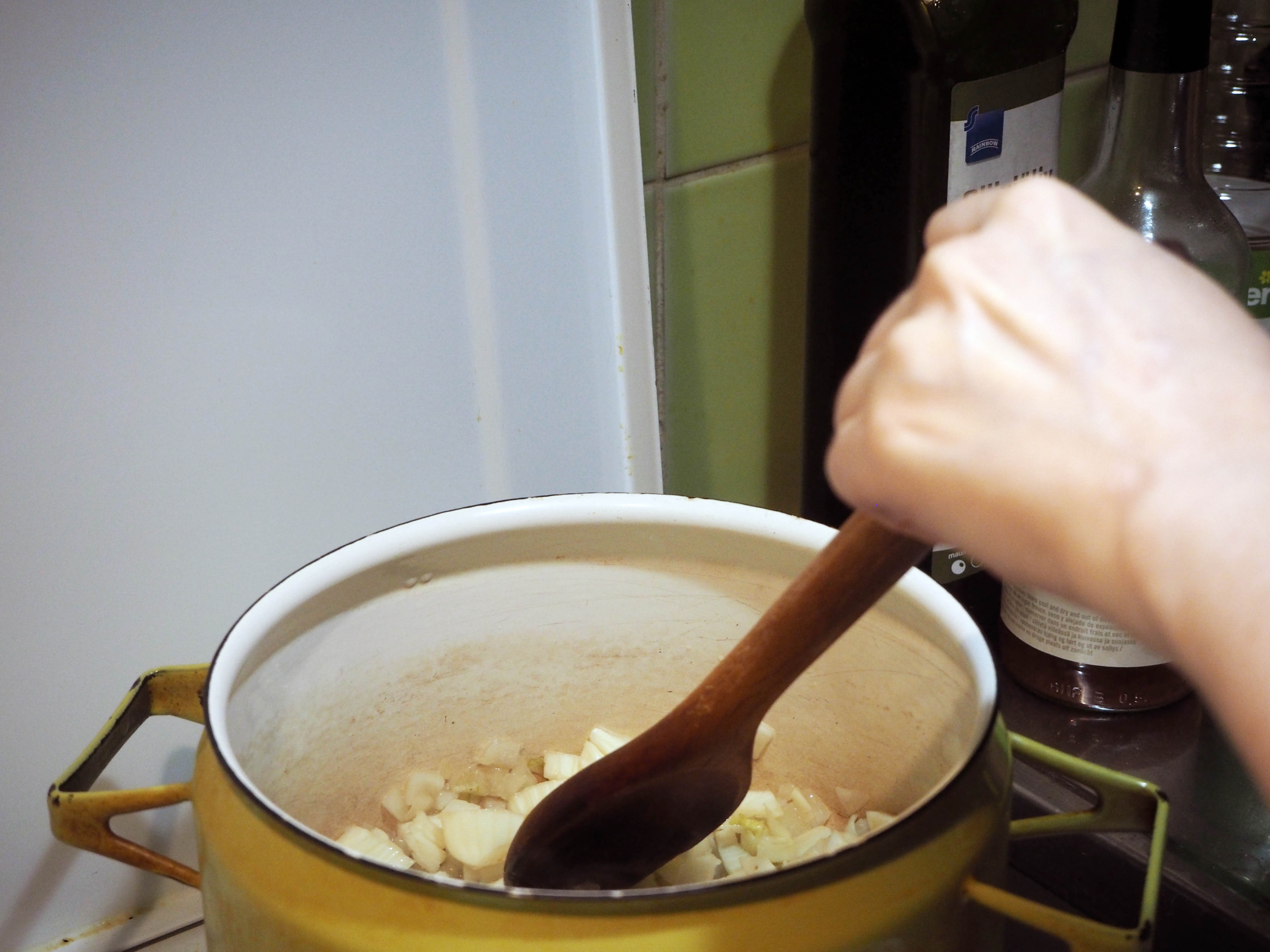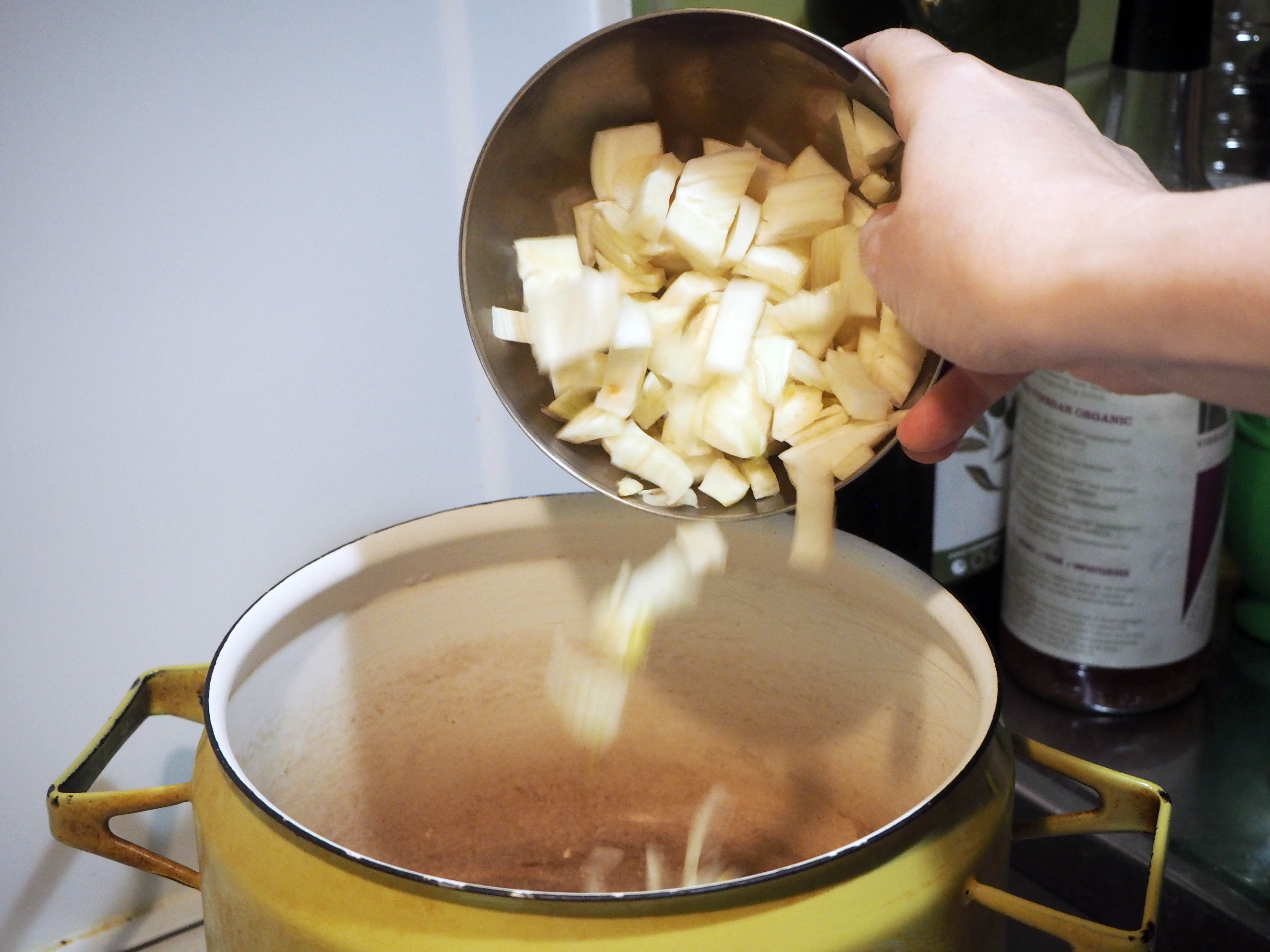 1. In a large pan suitable for soup, put olive oil on medium high heat for about 20 seconds, then add onion and fennel. Saute for about 5 minutes, until onion becomes translucent.