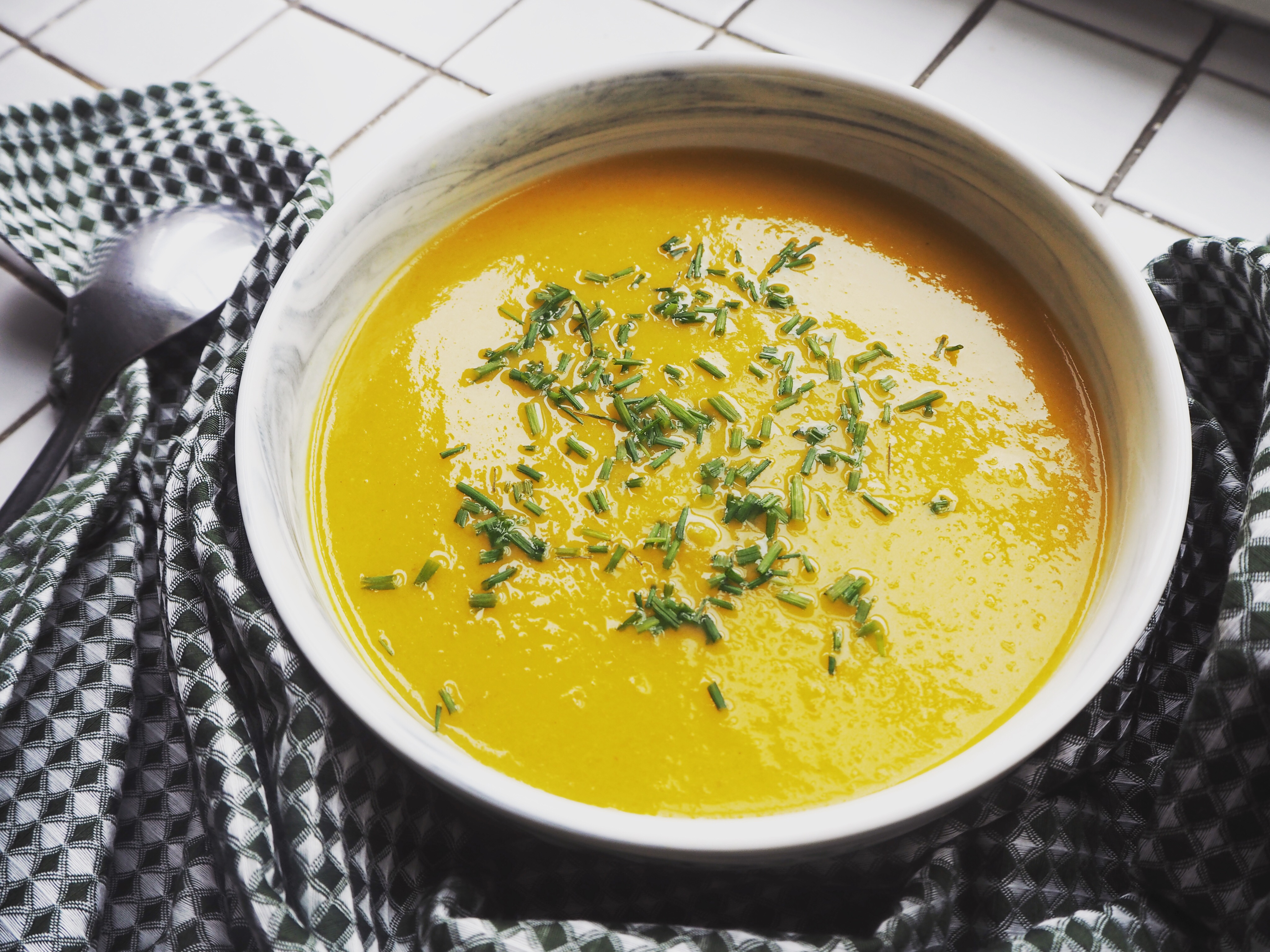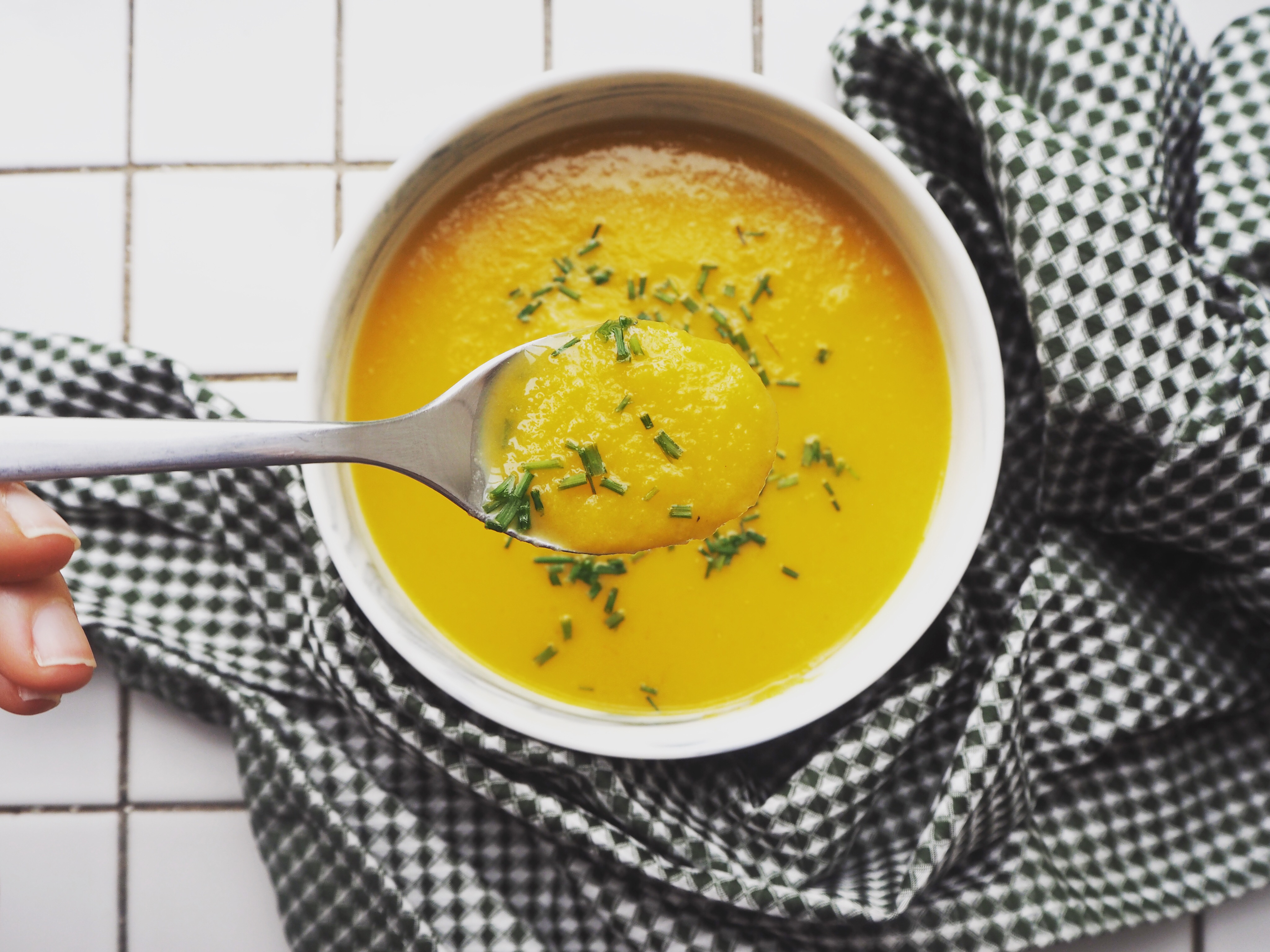 6. Put puree soup back on medium heat. Add orange and lemon juice and stir. Cook for about 3-4 minutes. Taste and add more salt if needed. Turn off the heat and serve warm with fresh chives or fresh mint. Enjoy!
