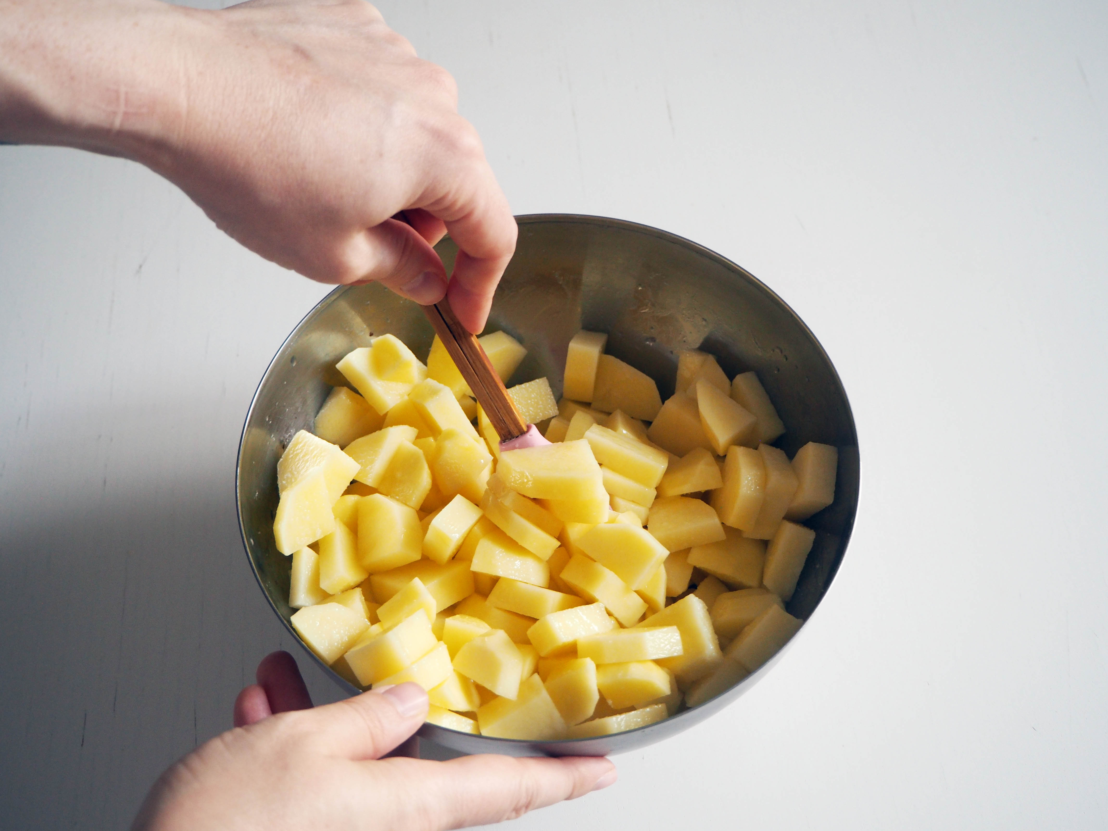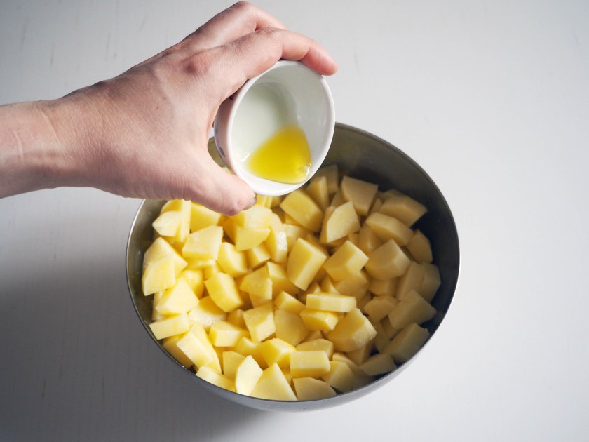 8 medium potatoes (about 950 gr. before peeling), diced (I made the pieces a bit thin to let them bake fast)
