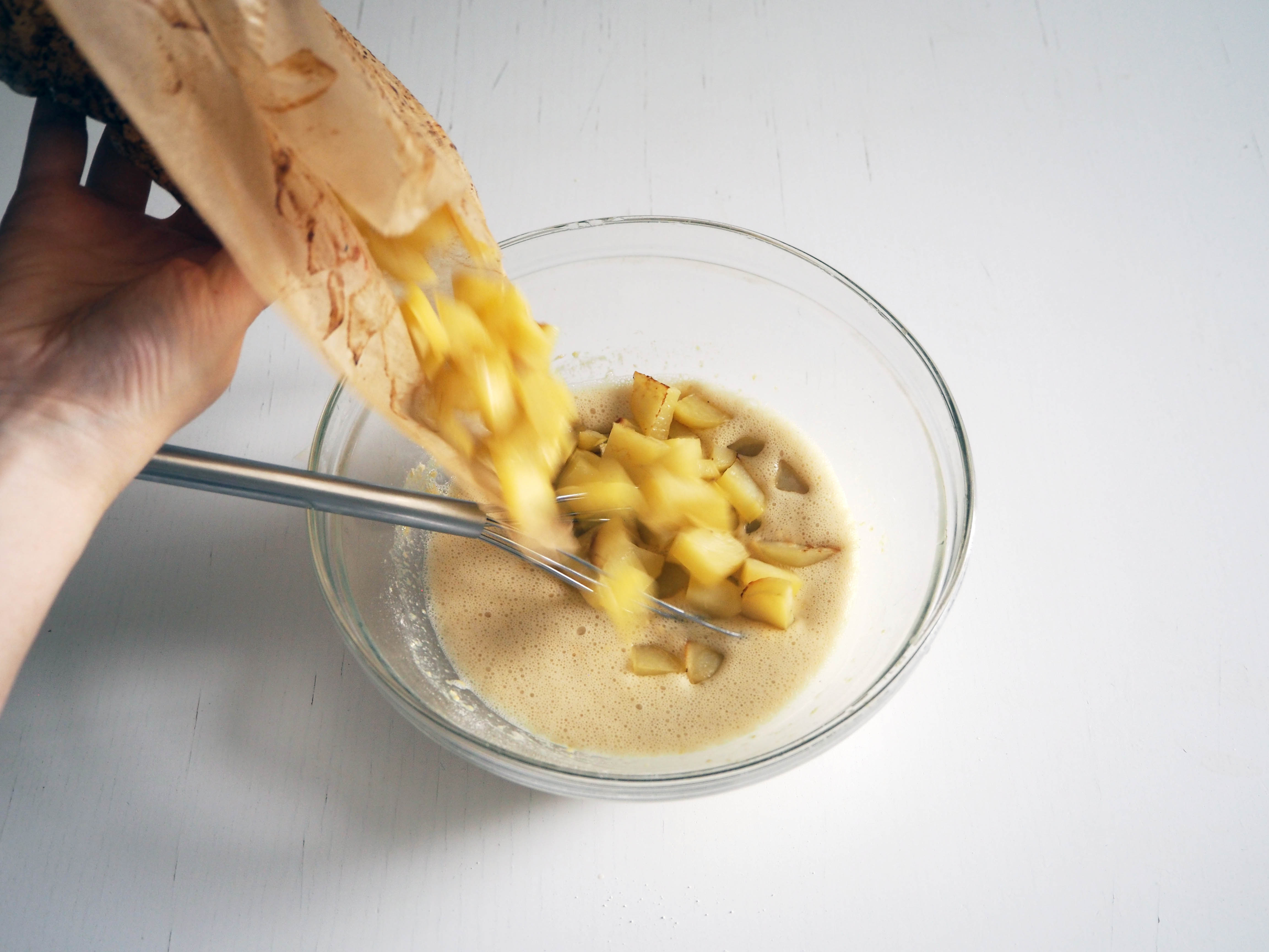 4. Add baked potatoes and continue gently whisking.