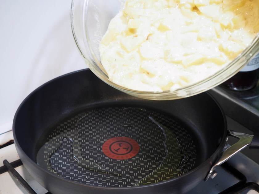 6. Take a 24cm pan and add 2 tbsp olive oil. Make sure the base and side of the pan are covered well with oil. Warm the oil on medium high heat for about 1-1.5 minutes, the oil and pan should be pretty hot. Then add the mixture and using a spatula, flatten the surface and smoothen the sides to make a nice circle.