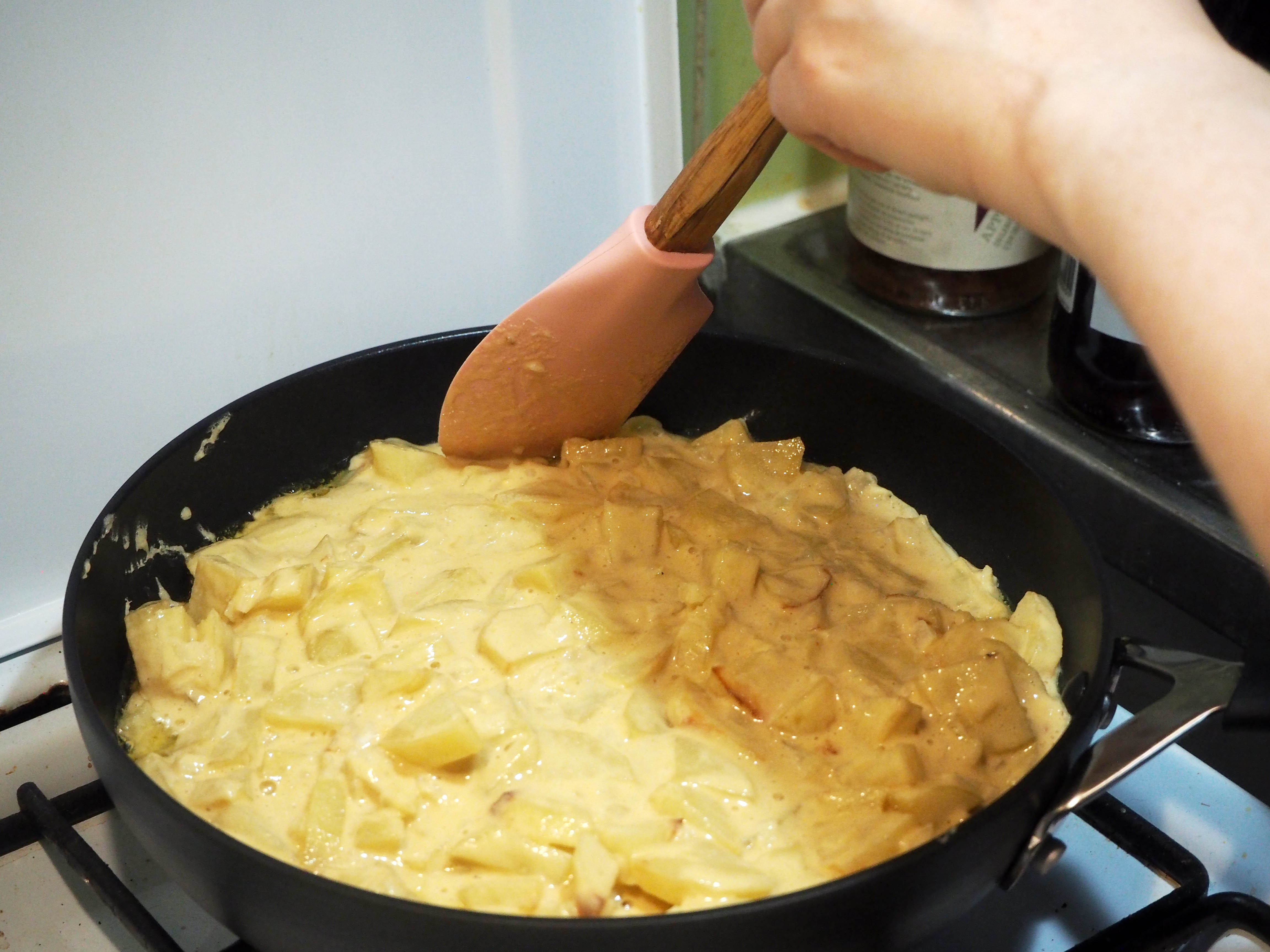 7. Cover the pan and decrease the heat to medium to rather slowly cook the omelette. It will take about 7-8 minutes to be ready to flip but the amount of time changes in different stoves so be sure to check the omelette often. How to do that? Check it with spatula, through the sides and see if the omelette is holding up together when you try to pick it up from the pan with spatula.