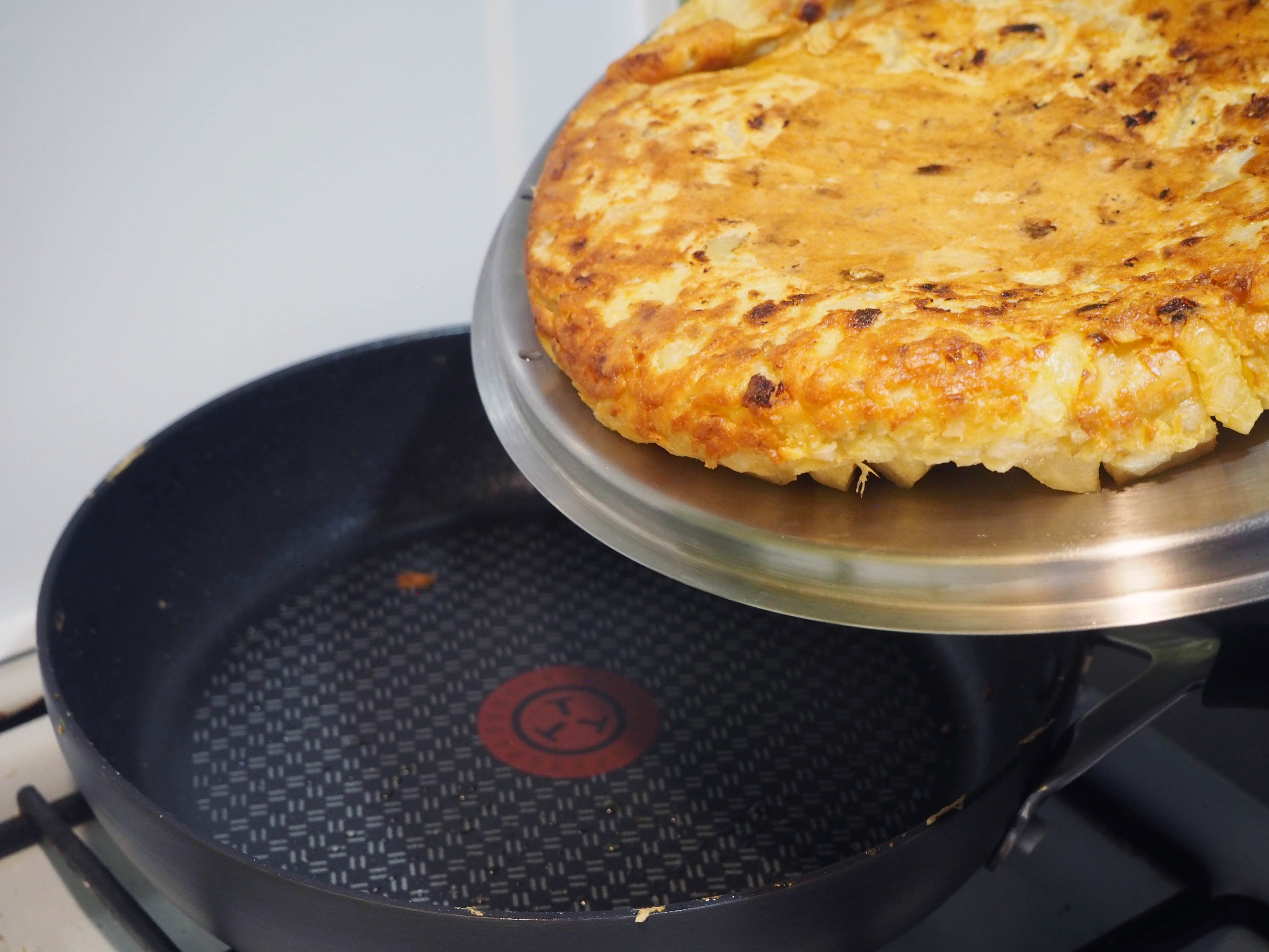 8. When the omelette is holding together, it’s ready to flip. Gently using a spatula, make sure that the omelette releases from the sides and base. Then put the lid on and flip the omelette onto the lid. After that, quickly and gently transfer the flipped omelette back to the pan. Continue to cook the omelette’s other side for about 3-4 minutes with the lid on (but again, check the base often with a spatula because the amount of time for you might be different). When it’s all cooked, transfer the omelette to a serving plate and serve warm. Enjoy!