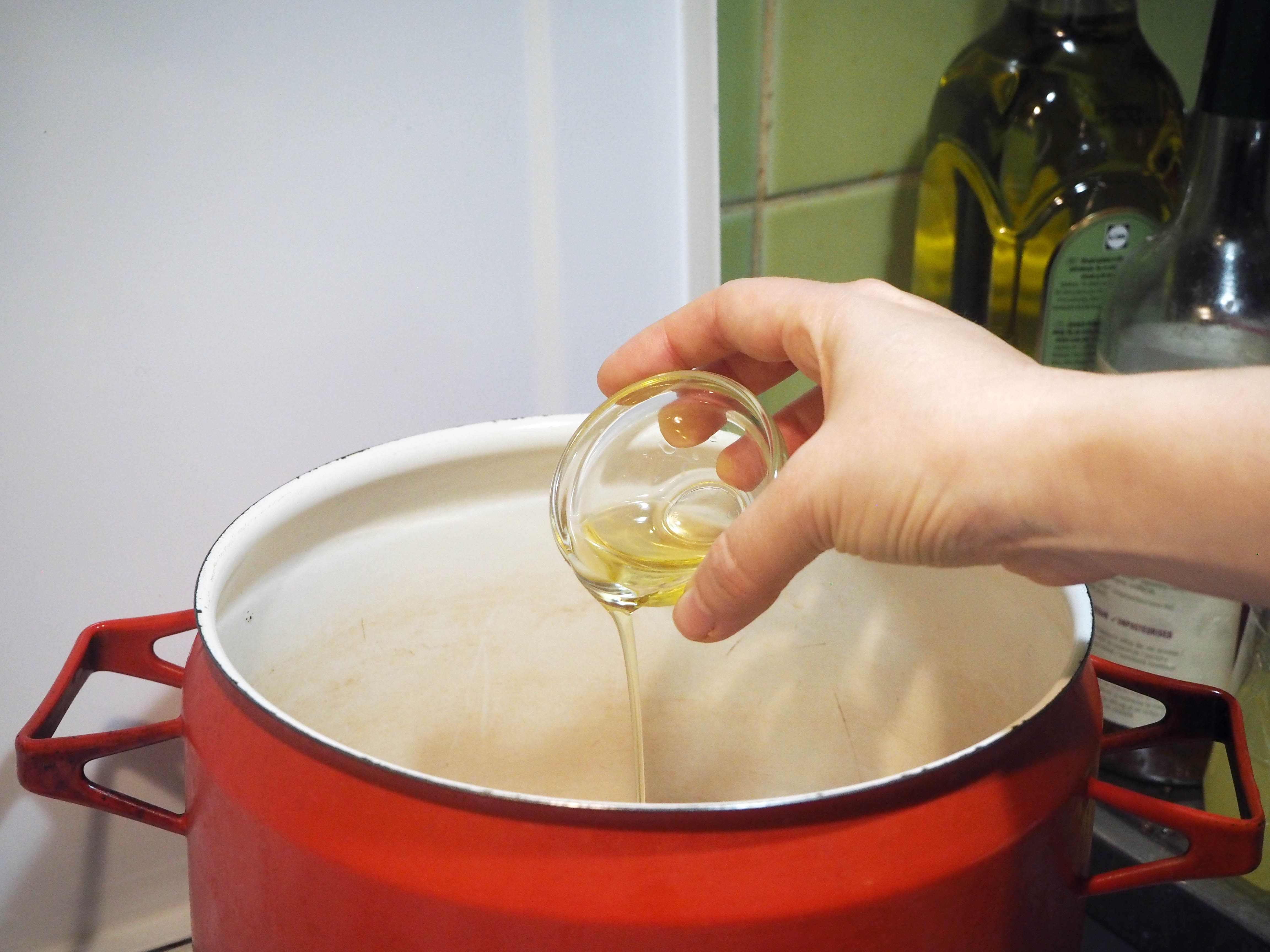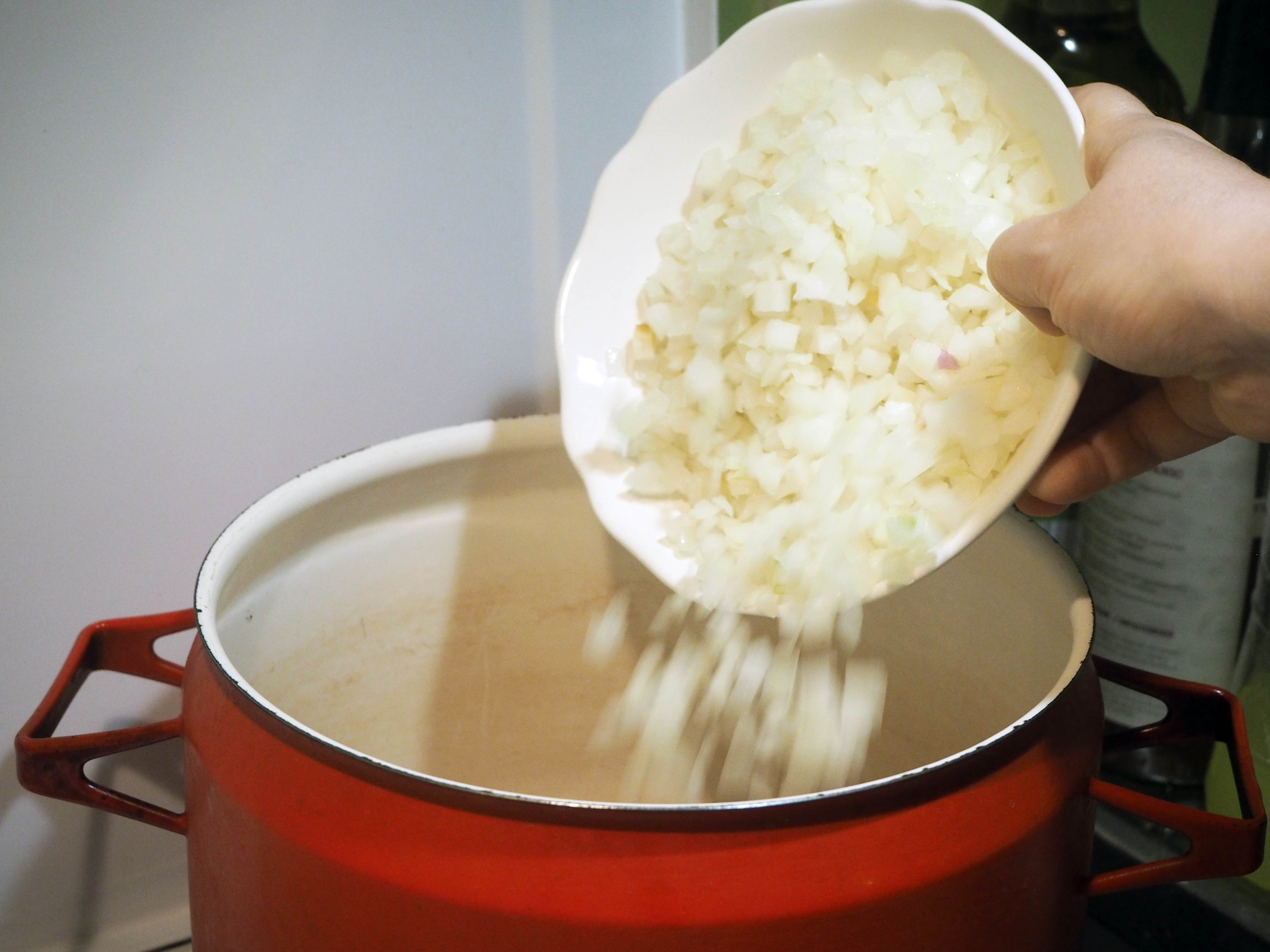 1. In a large soup pot, put olive oil and warm on medium high heat for about 15-20 seconds. Add onion and sauté for 3-4 minutes, until it is translucent.