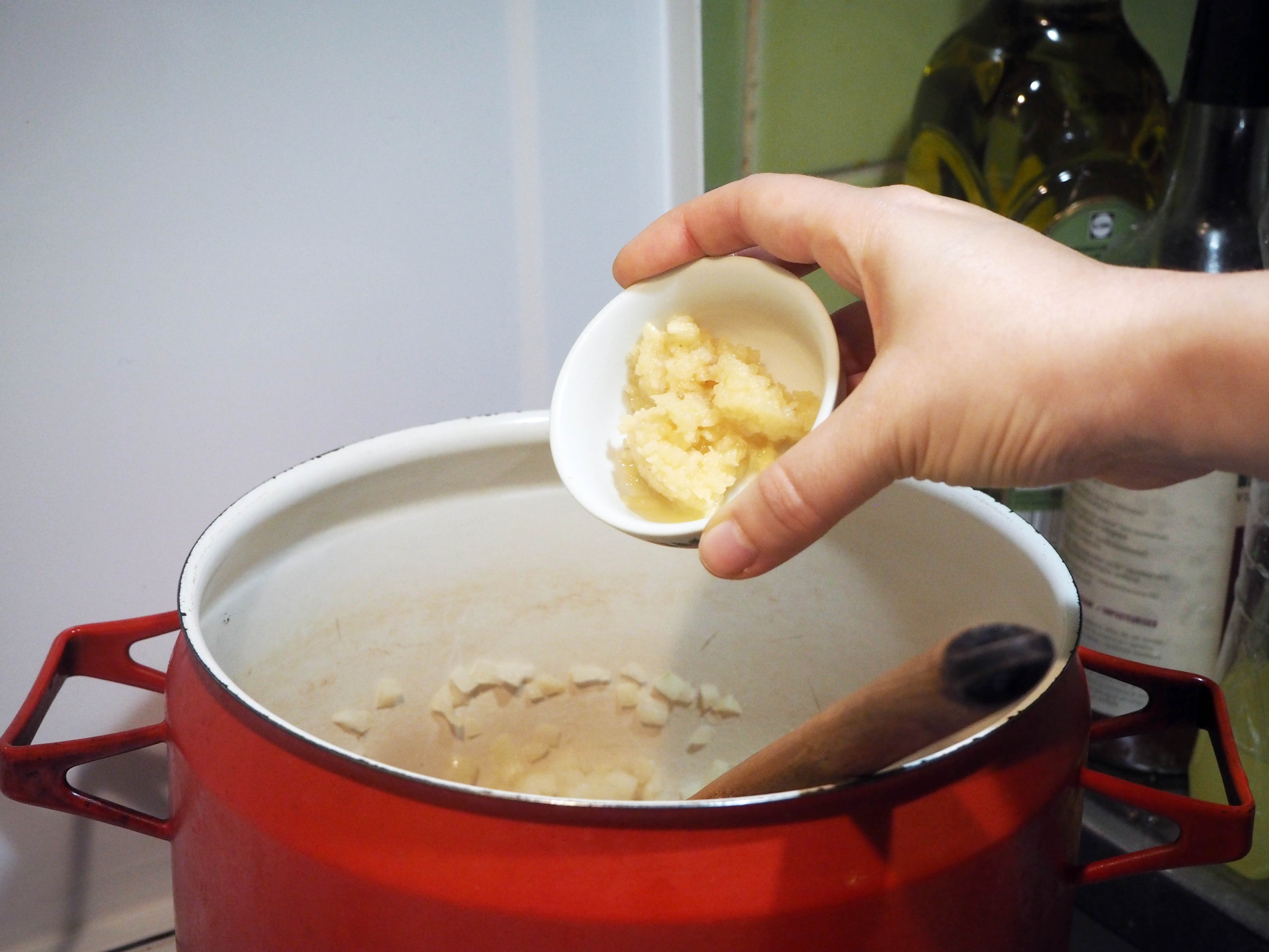 2. Add garlic and vegetable stock cube if using and continue to sauté for about 2 more minutes.