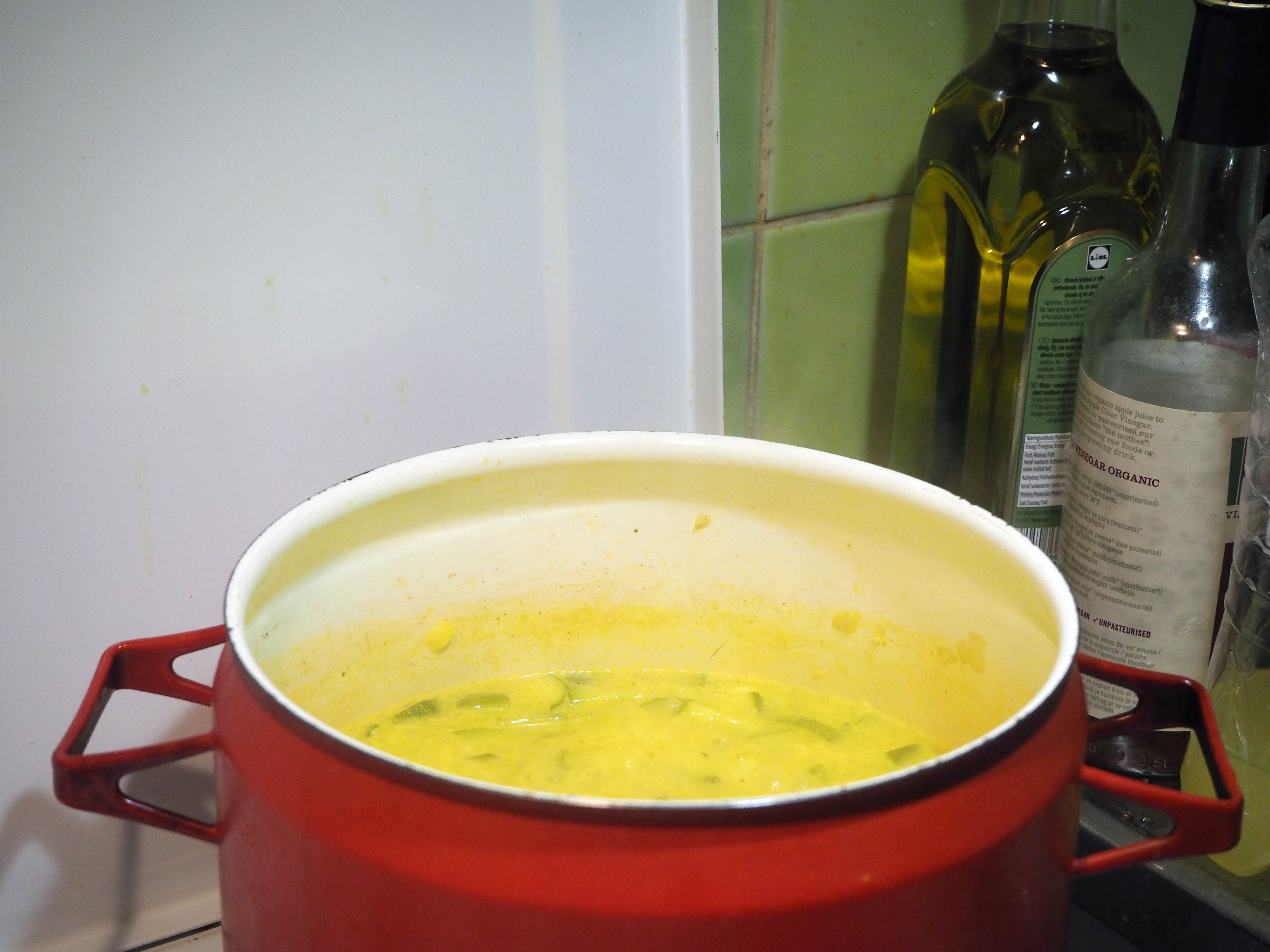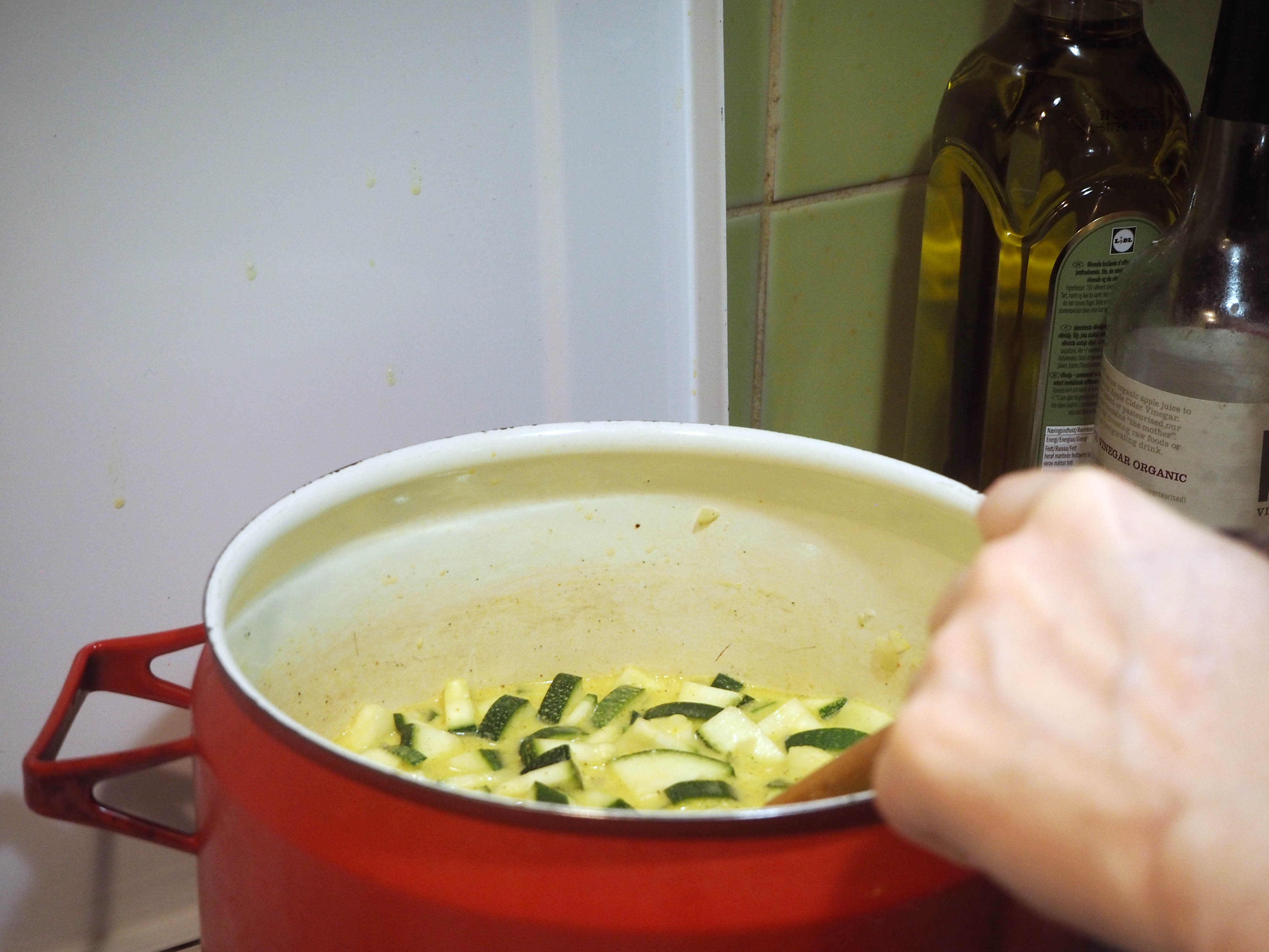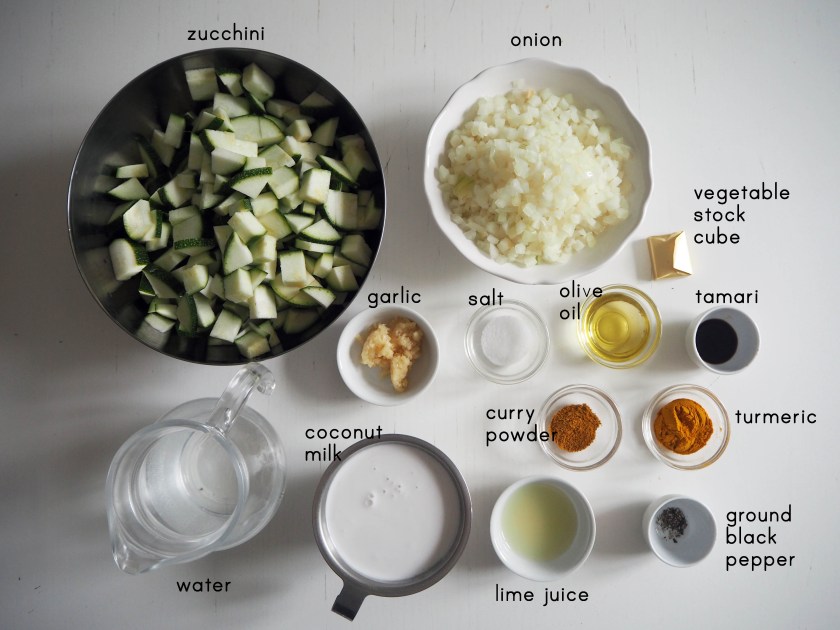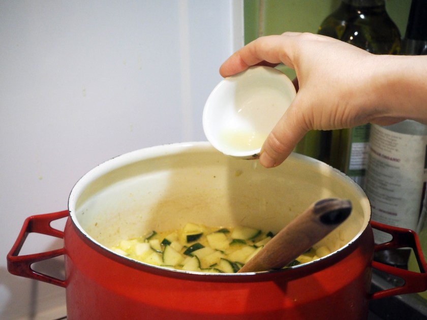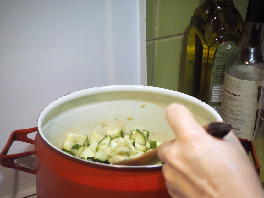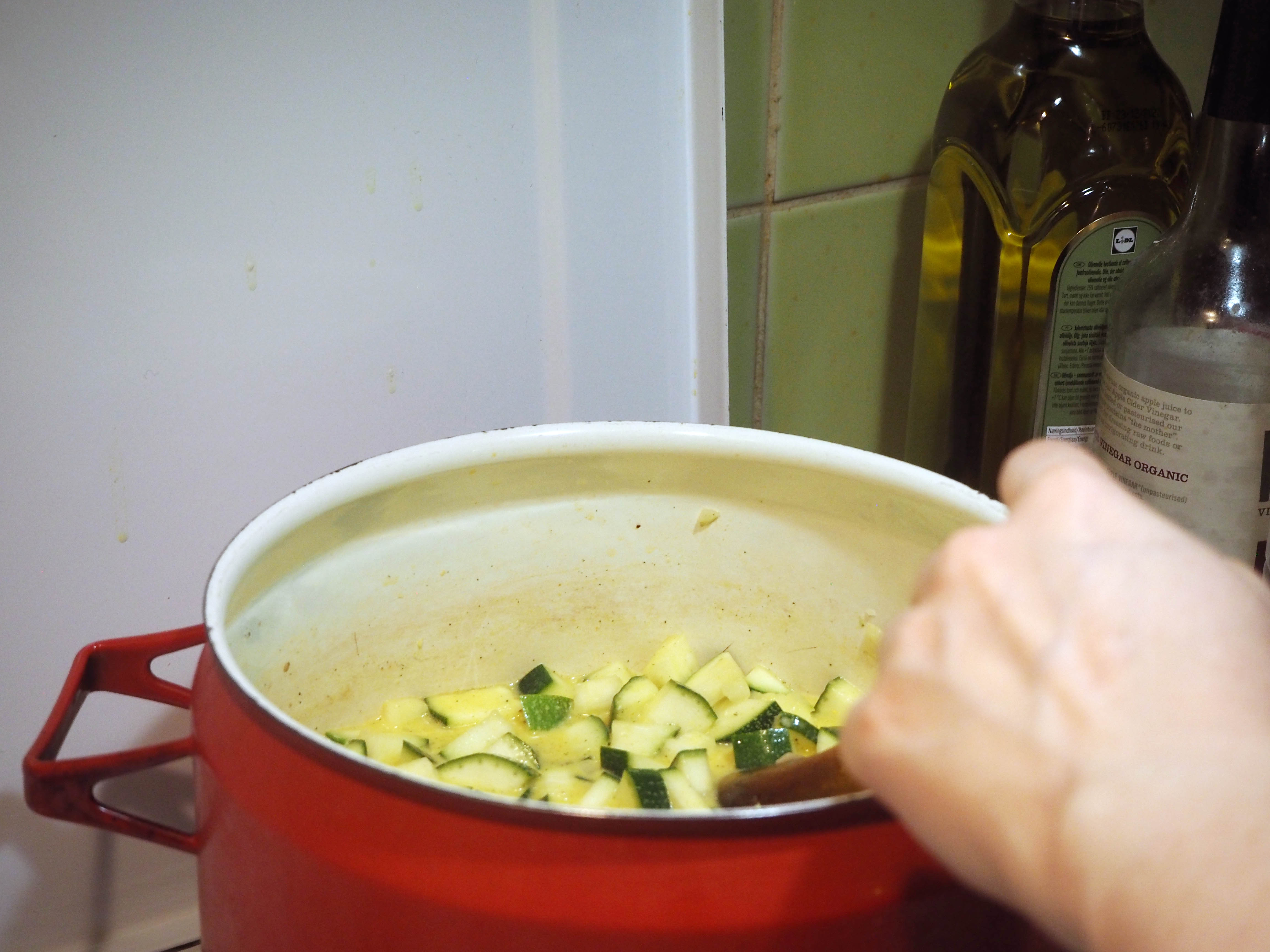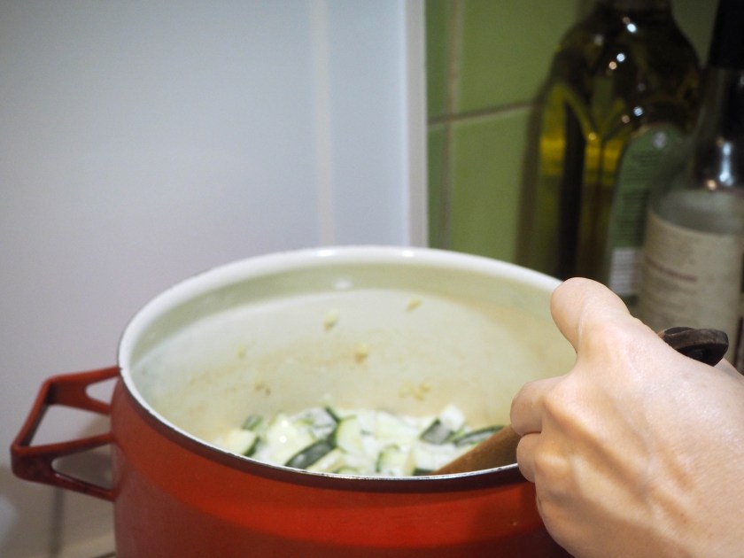 Actually, come to think of it, I never made or ate zucchini soup before. So yes, this soup was also a first for that. I diced the zucchini small, bite-sized. I thought of adding a couple of diced carrots too, as I had some at home, but in the end I kept the soup purely as zucchini soup. But you can perfectly add carrots if you like!