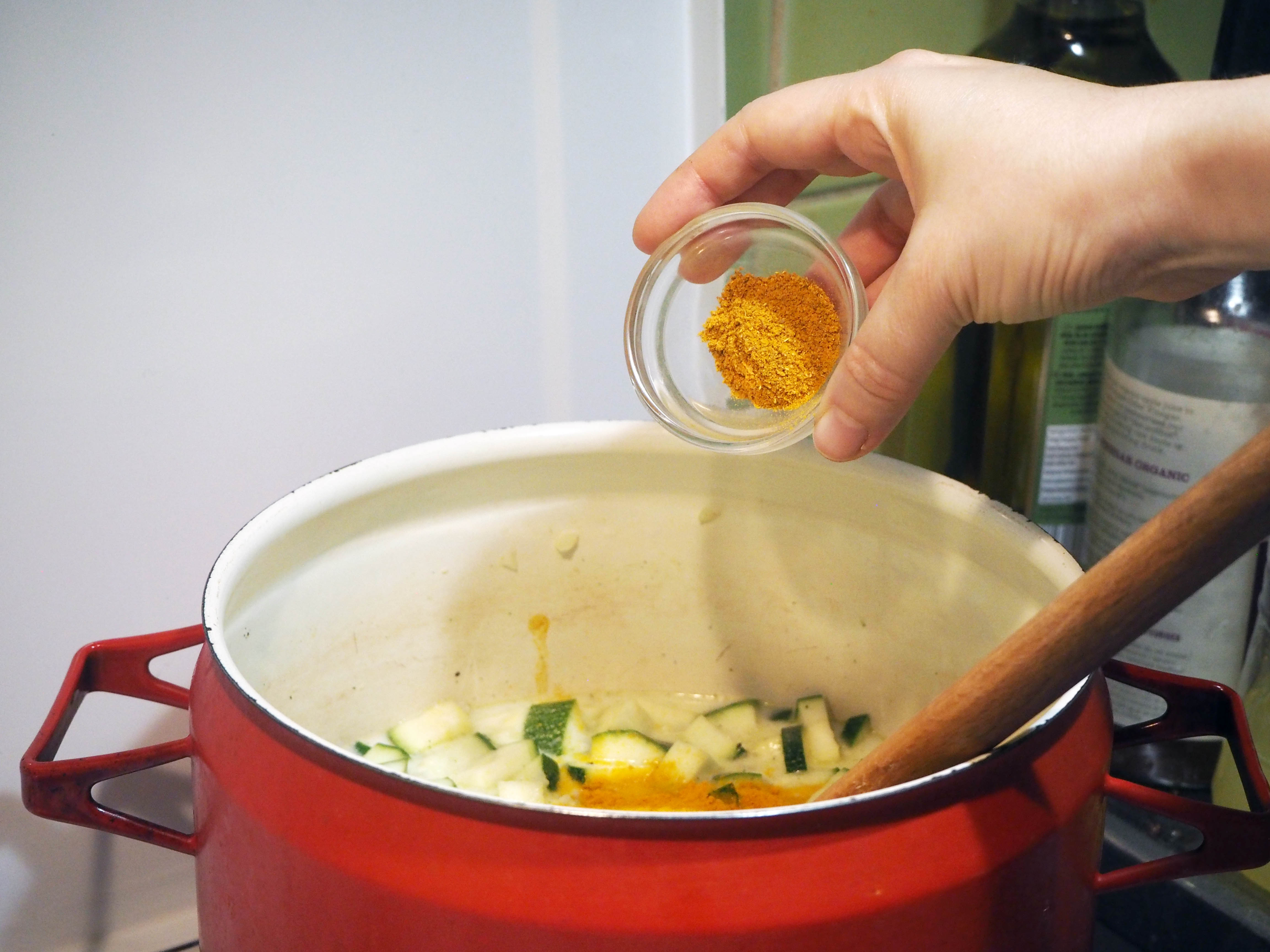 5. Add salt, turmeric, curry powder and black pepper and stir a little.
