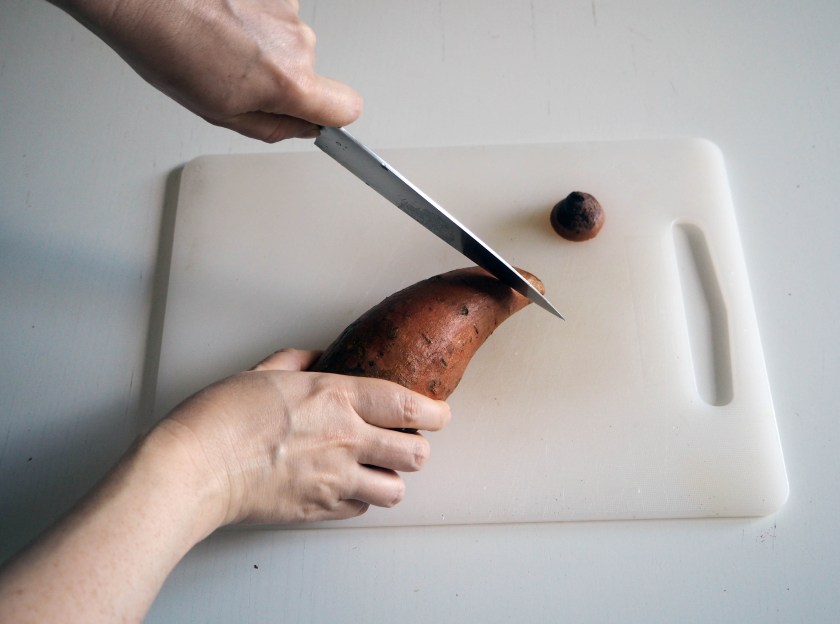 2. Trim the two ends of each sweet potato and cut them both to 4 pieces.