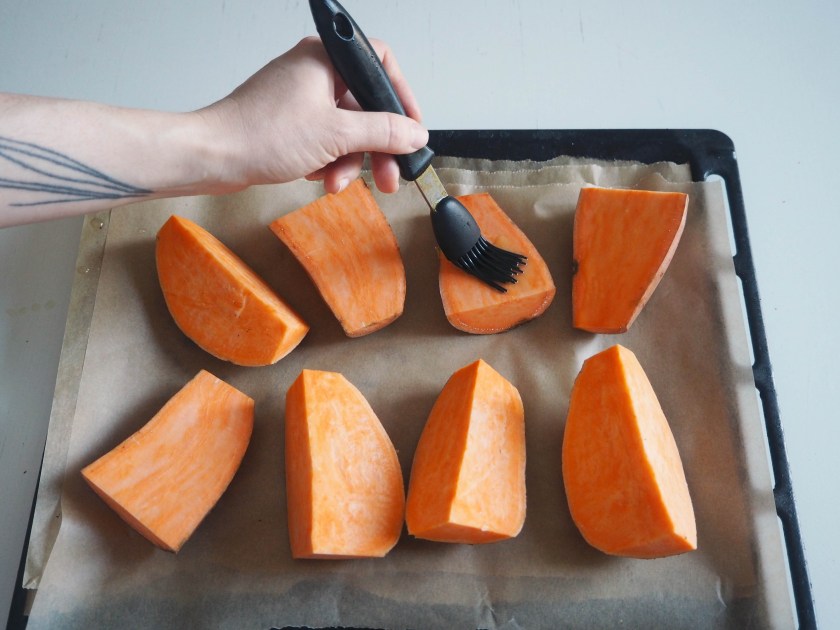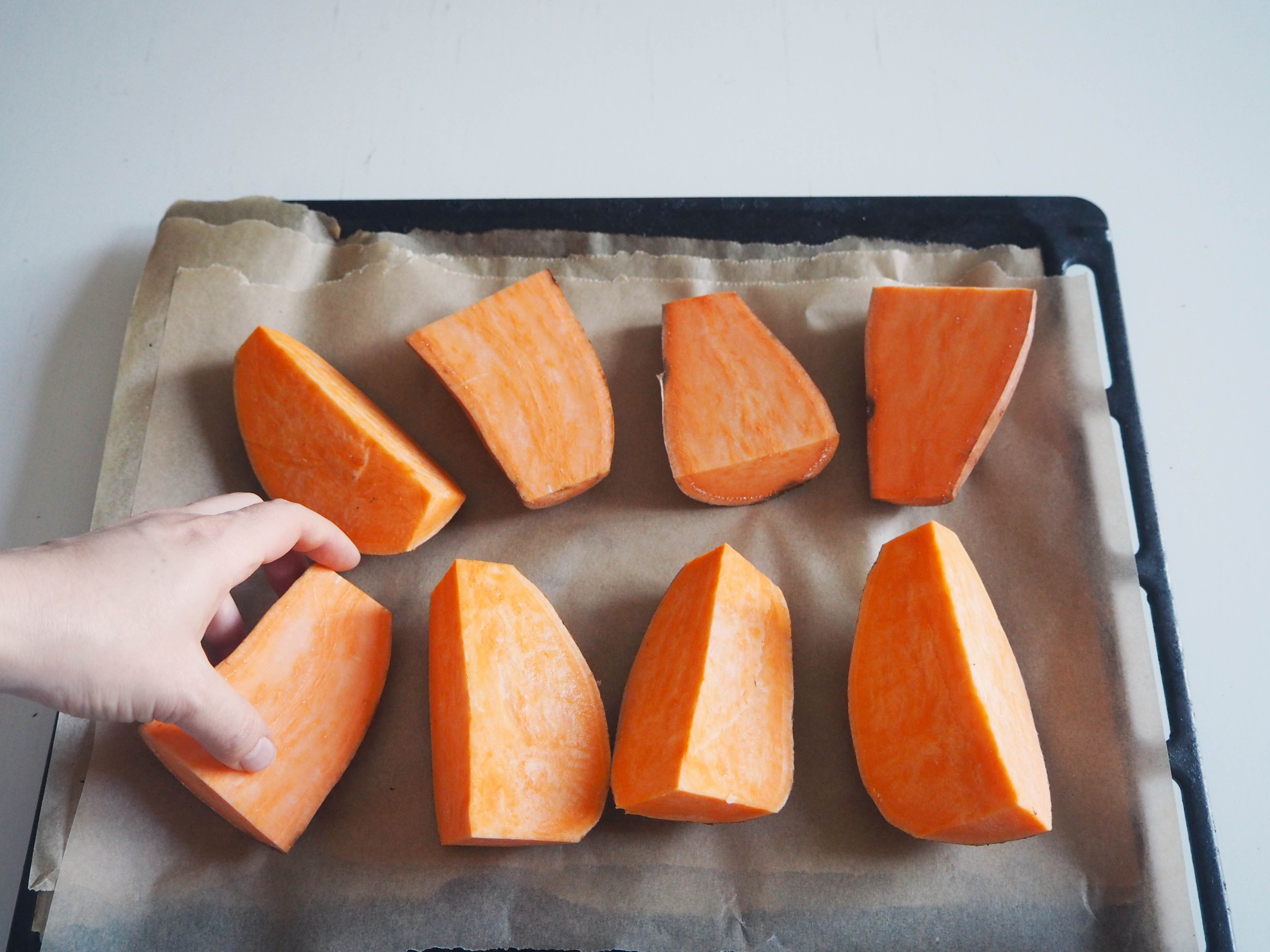 3. Put the sweet potatoes on an oven tray with a baking paper with skinny side down. Lightly brush the surfaces of the sweet potato pieces with olive oil. Put in the oven, in medium rack for about 40-45 minutes, until sweet potatoes are very soft.