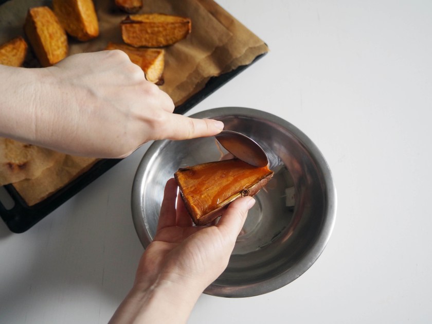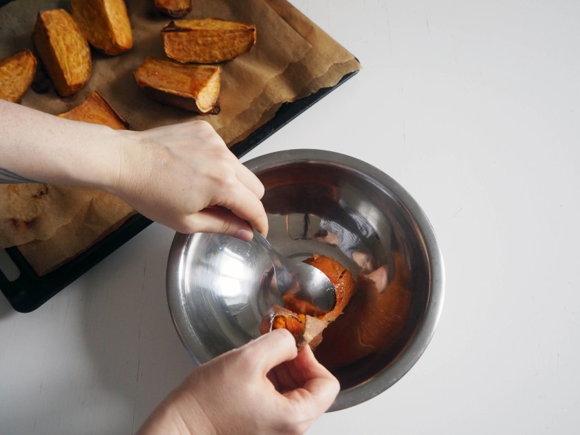 4. Let the sweet potatoes cool down for about 10 minutes after you take out of the oven, then scoop out the flesh, discard the skins.