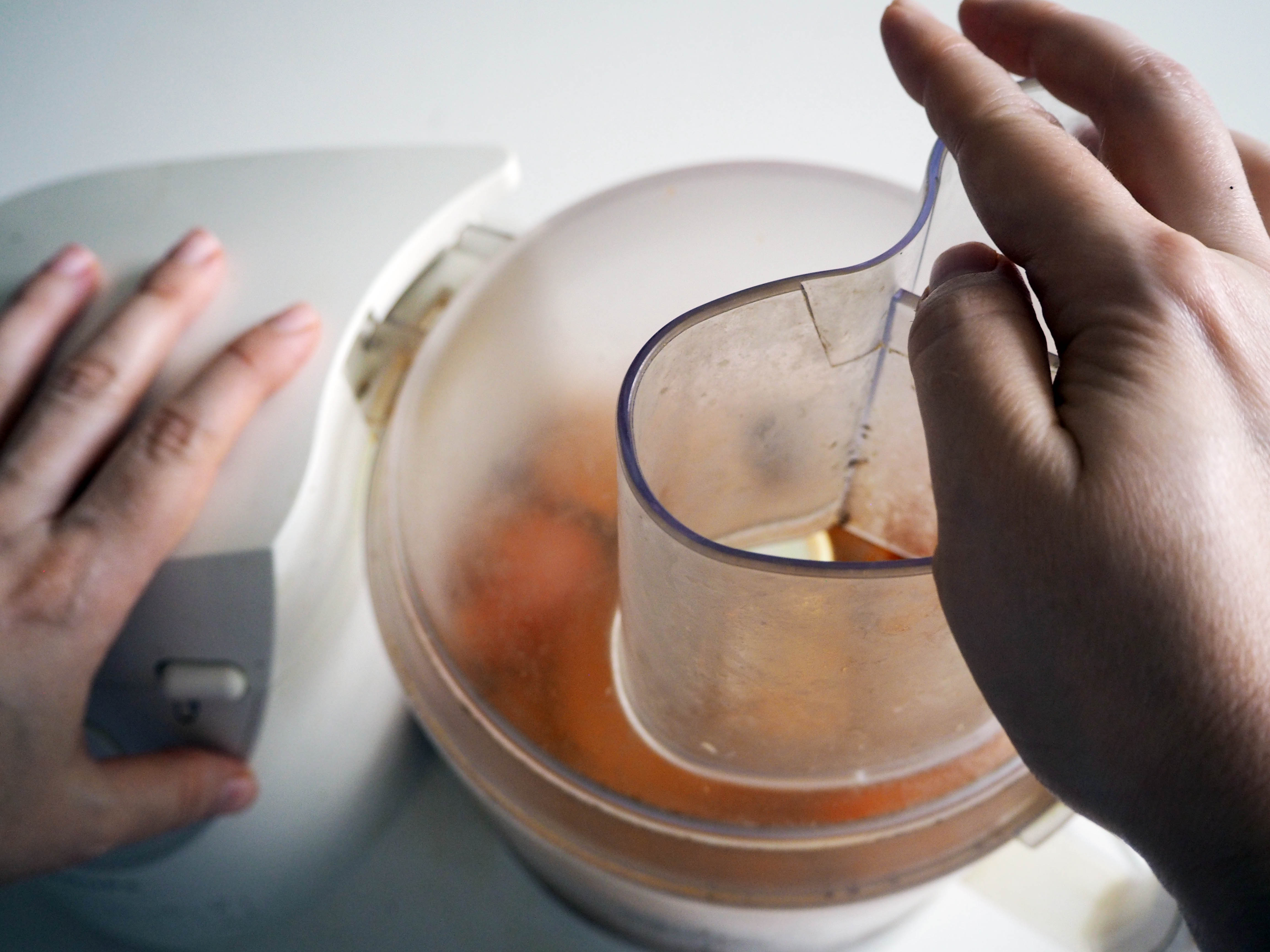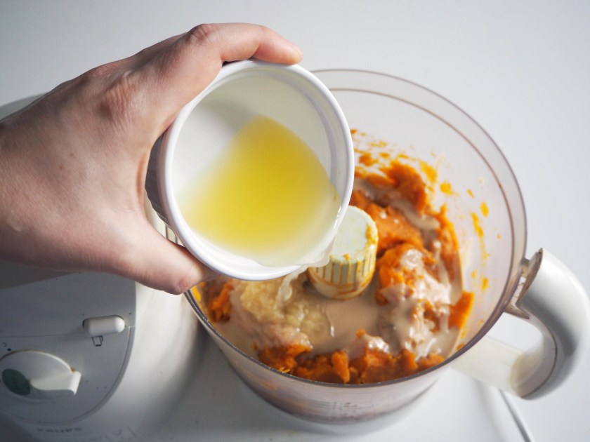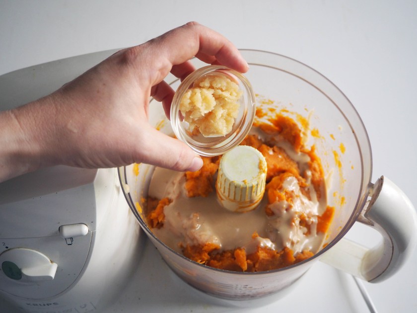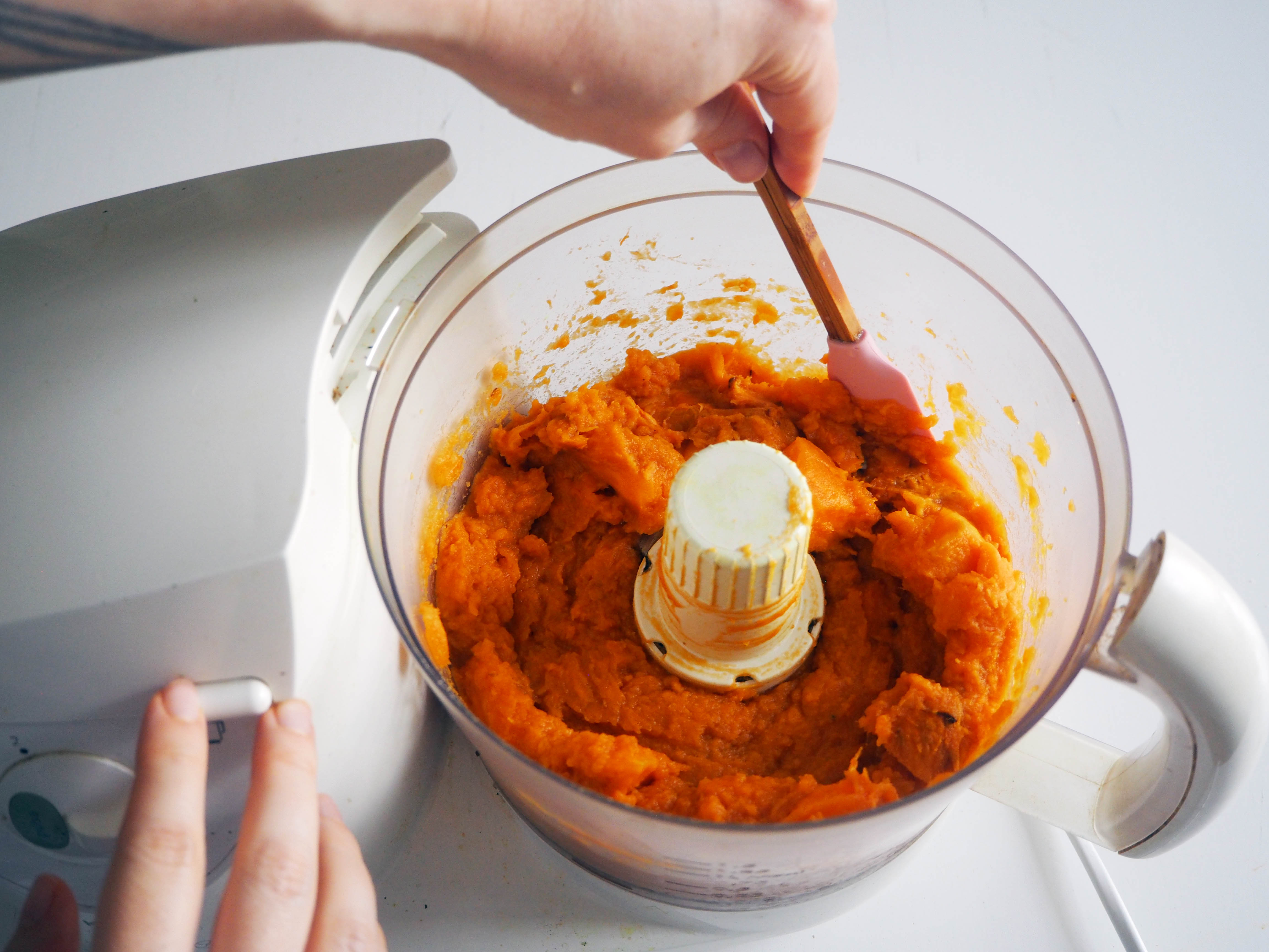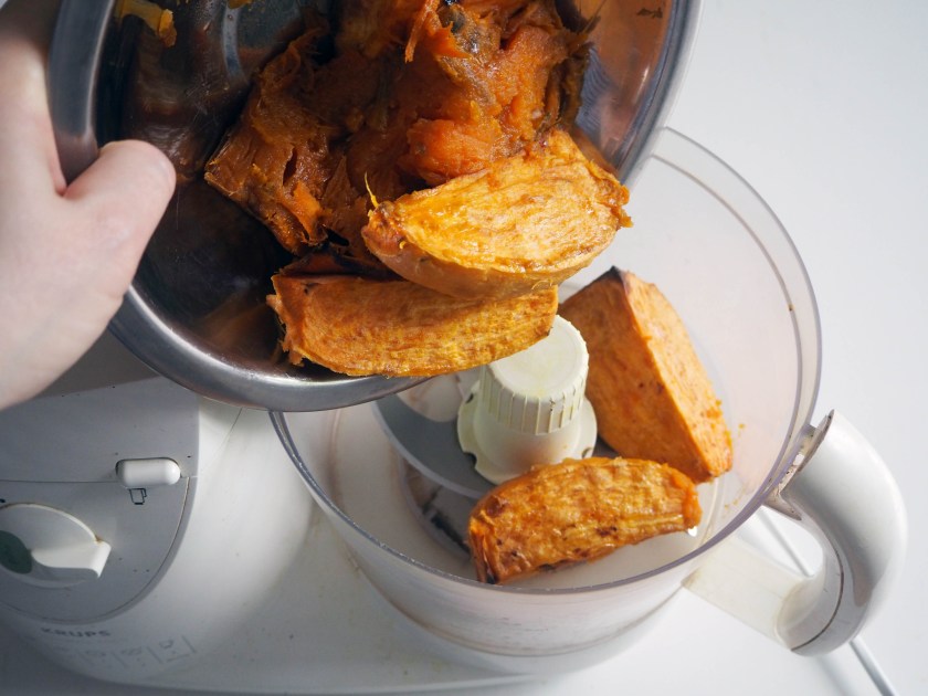 5. Put sweet potatoes in a food processor and process for a few minutes to make into a paste (it’s ok if there are some solid pieces still). Scrape the sides with a spatula if needed.