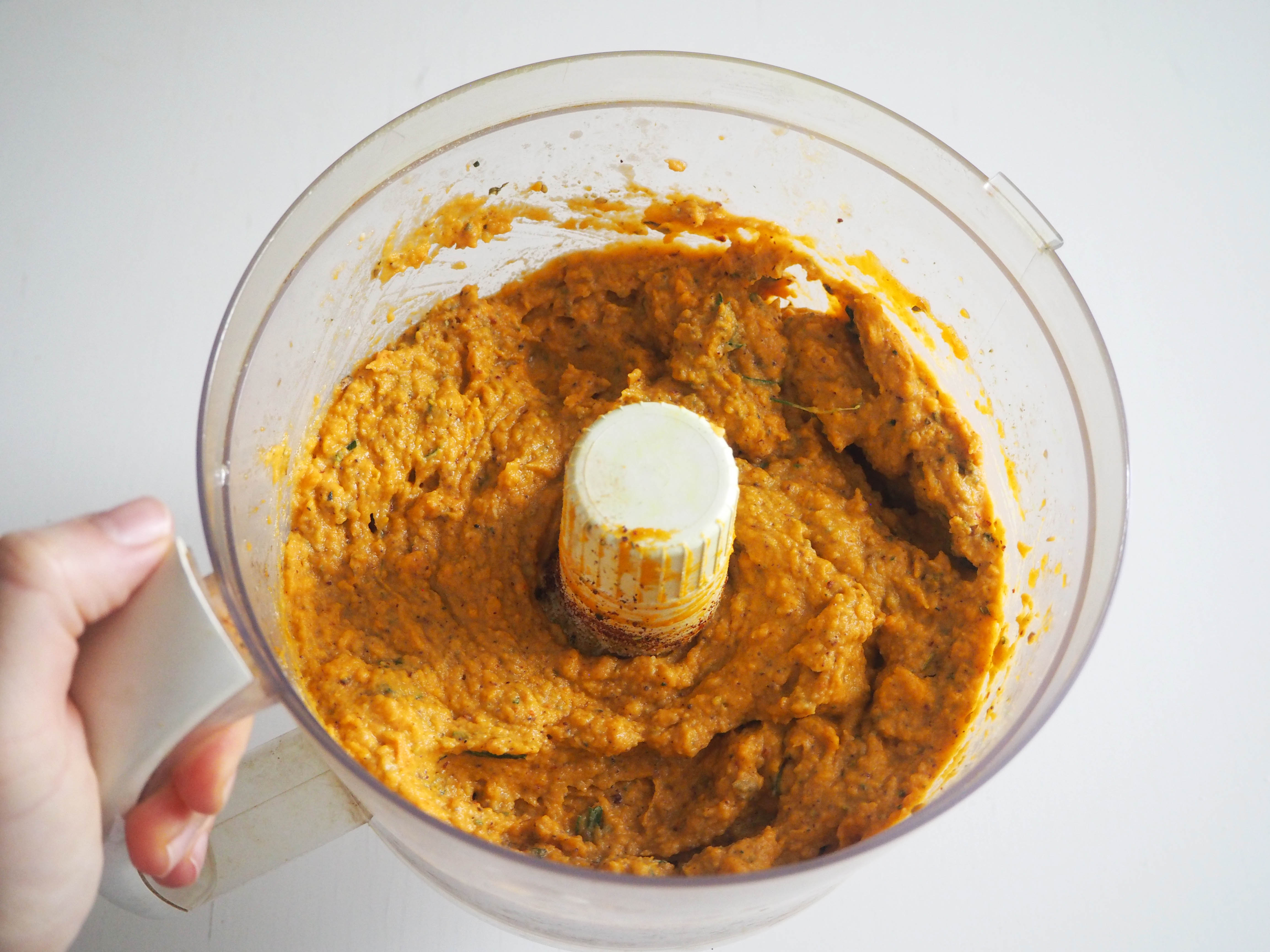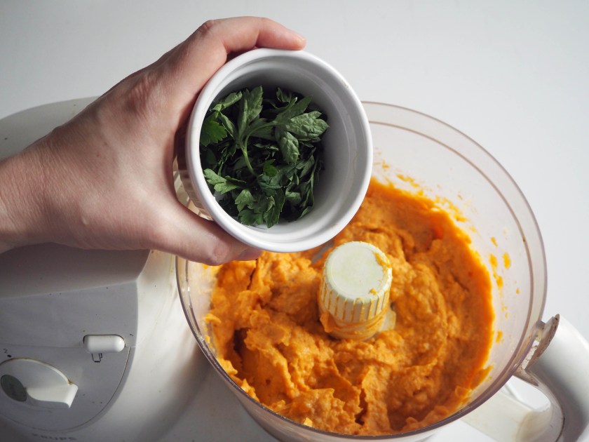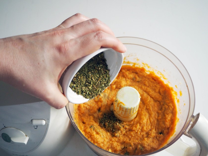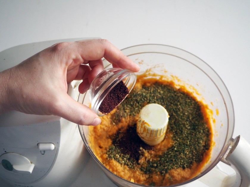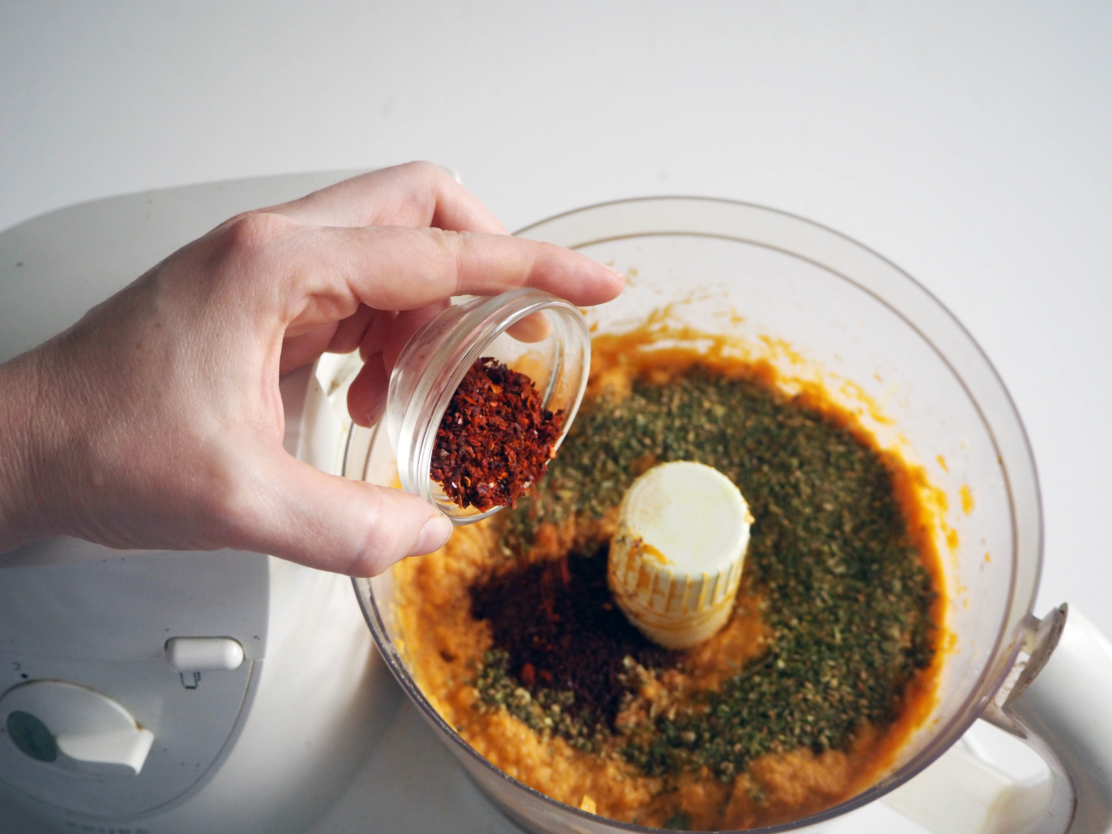 8. Add za’atar, sumac and red pepper flakes and process more to blend. Make sure that there are no big sweet potato pieces left.