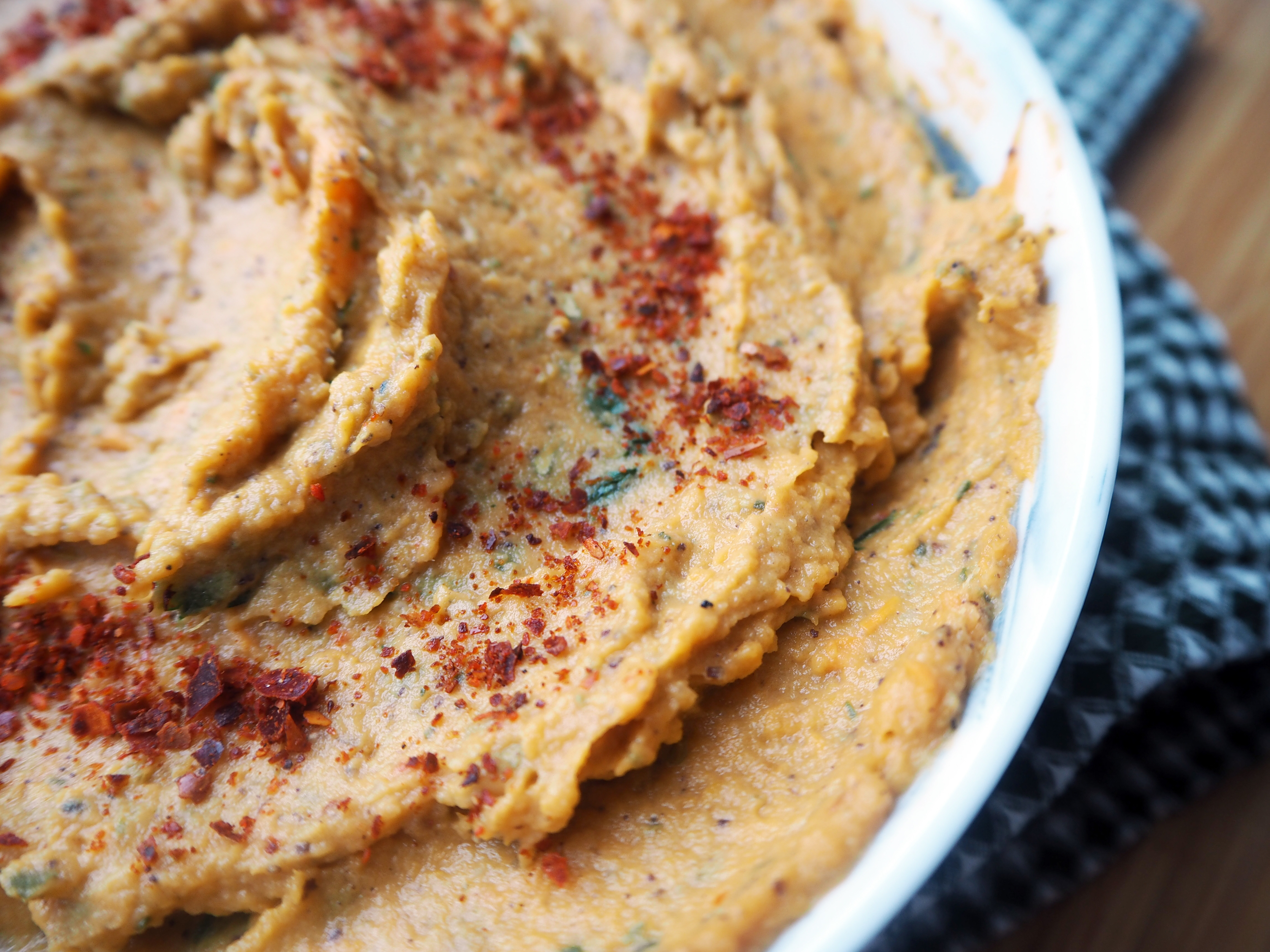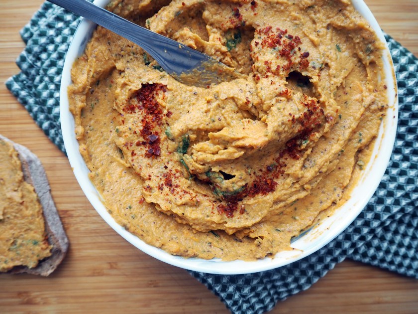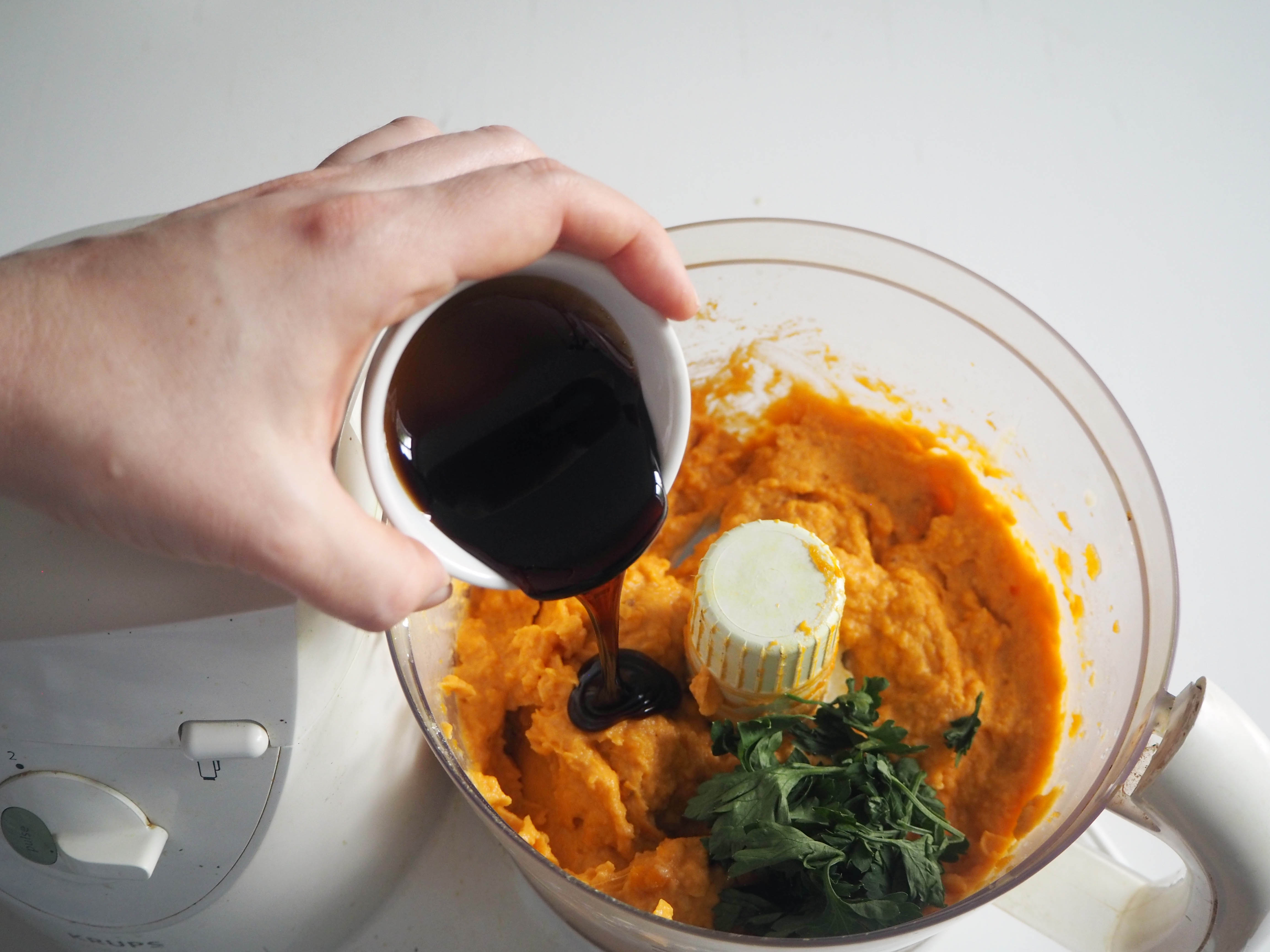 8. Add za’atar, sumac and red pepper flakes and process more to blend. Make sure that there are no big sweet potato pieces left.