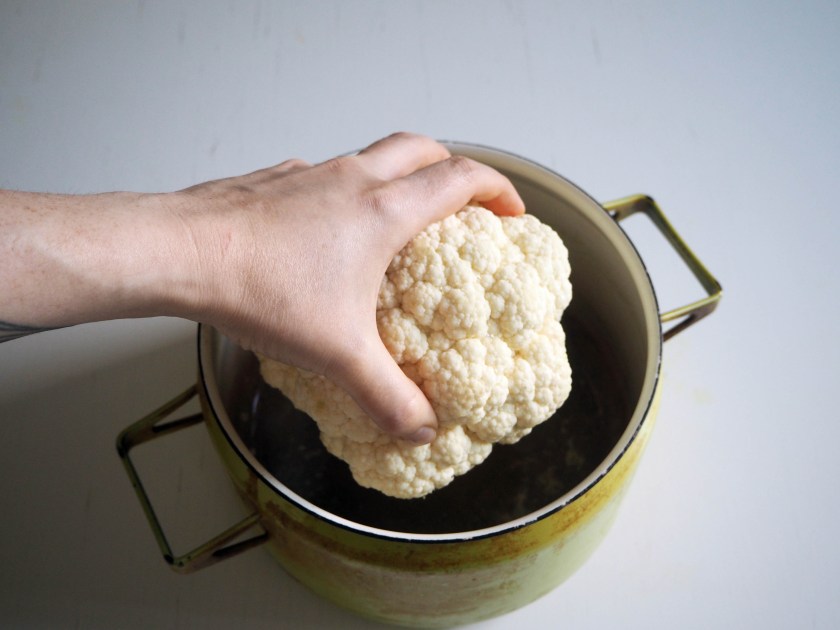 a medium size cauliflower (about 650 gr before trimming and without leaves), trimmed at the bottom a little so that it can stand straight