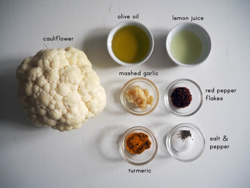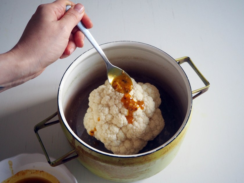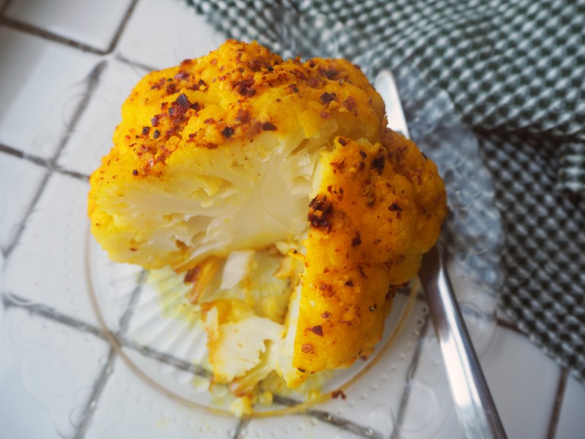 Last year, I posted a whole roasted celeriac recipe. This year it is cauliflower. And I am using one of my favourite ingredients lately: turmeric. Let’s roll!