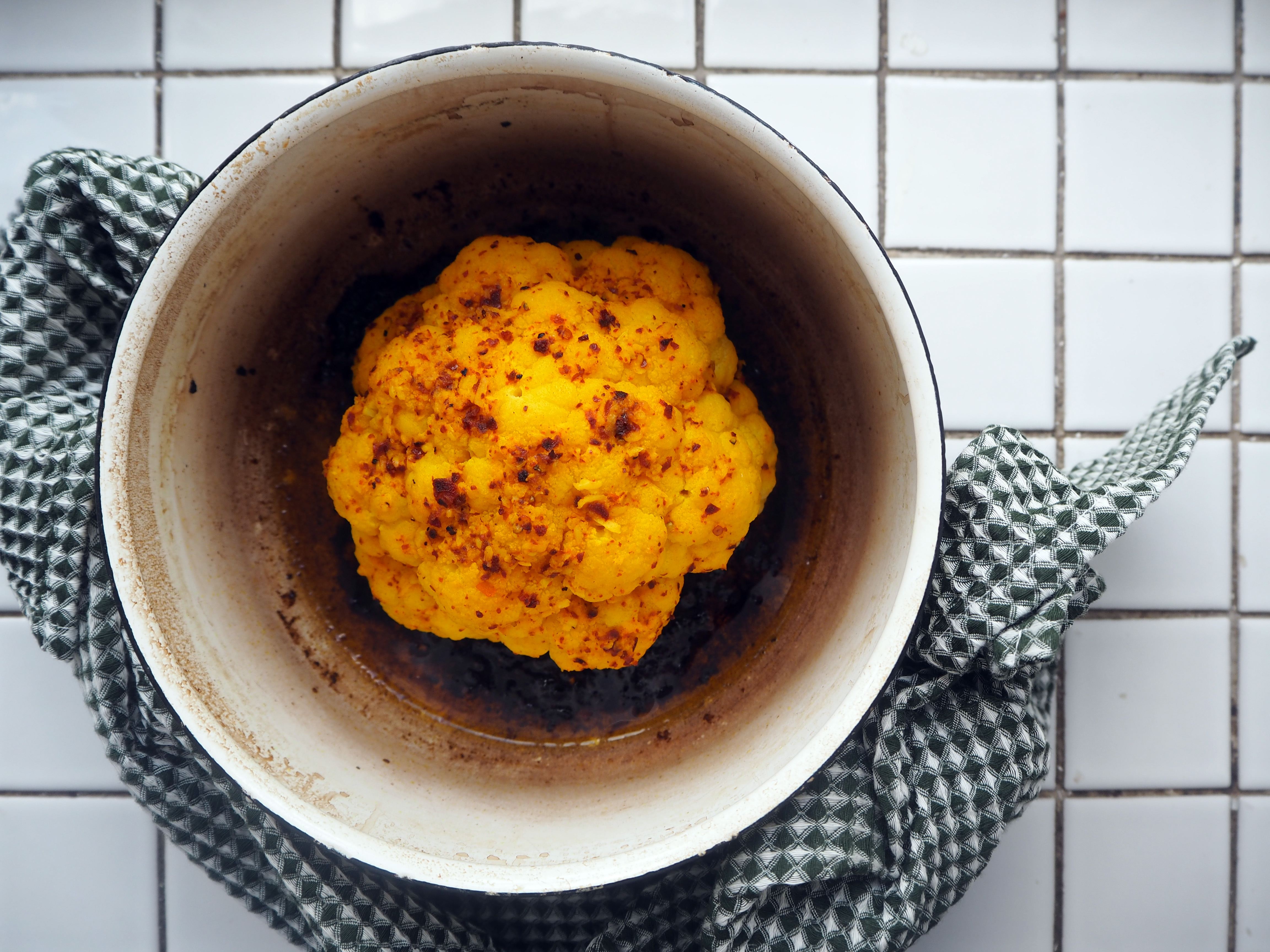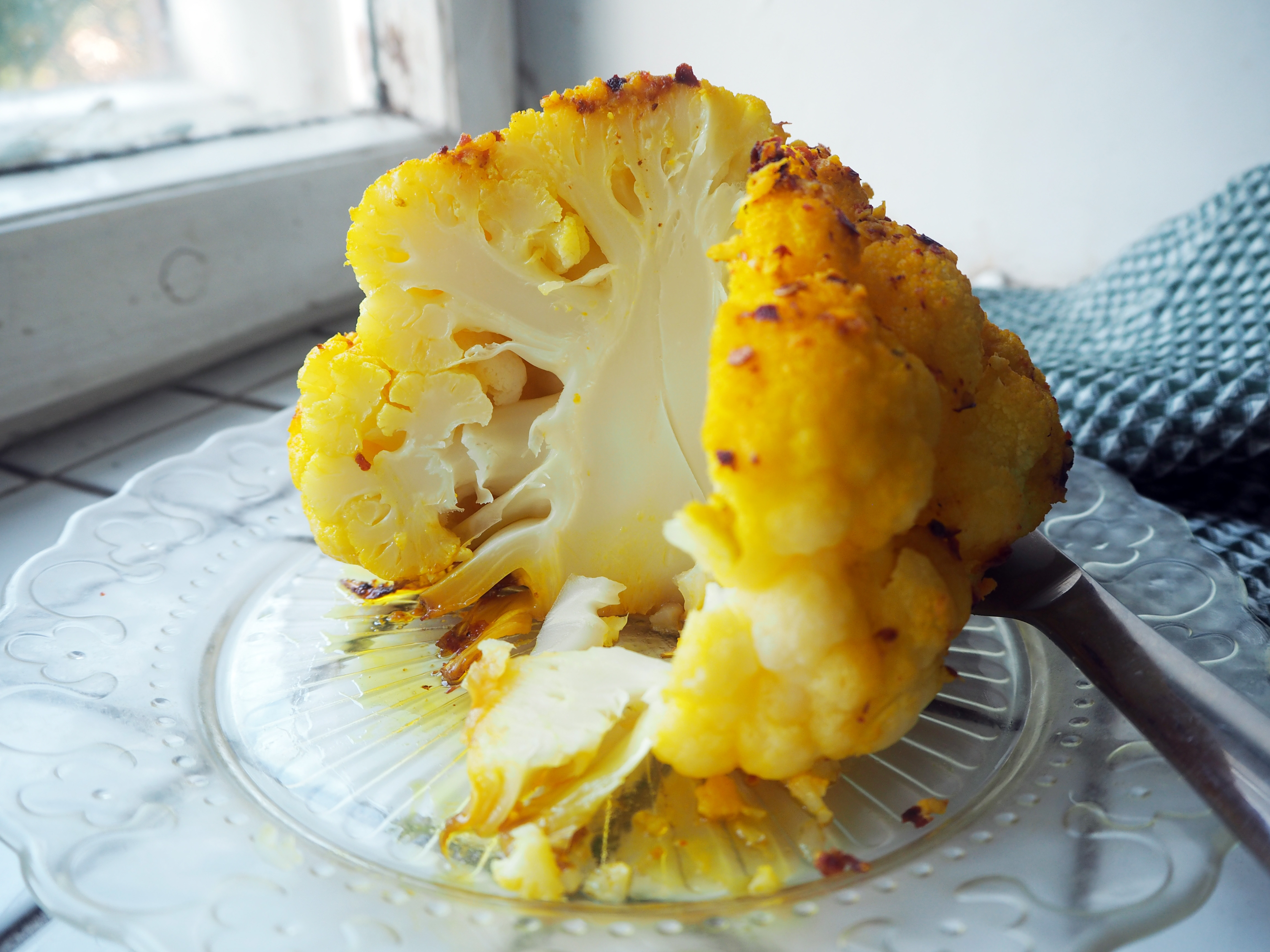 Last year, I posted a whole roasted celeriac recipe. This year it is cauliflower. And I am using one of my favourite ingredients lately: turmeric. Let’s roll!