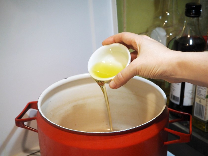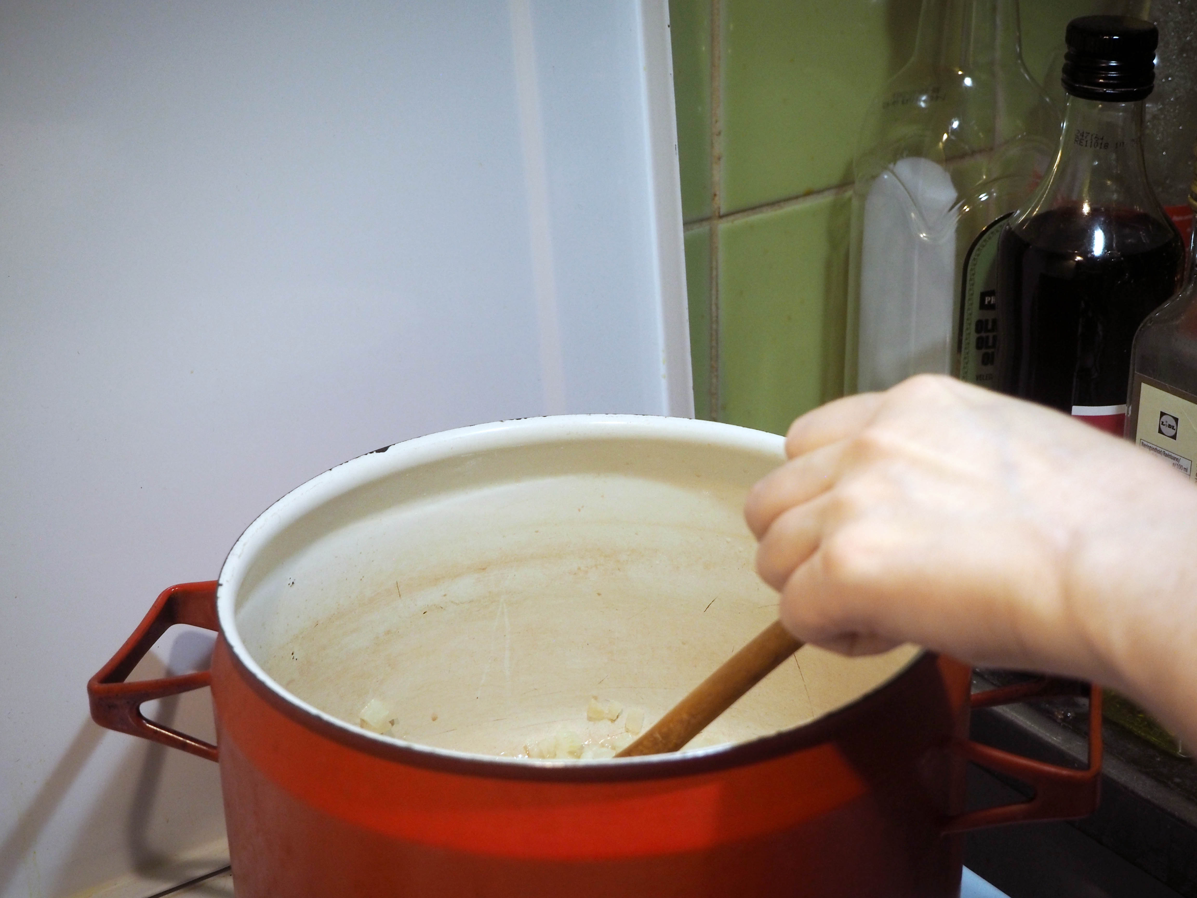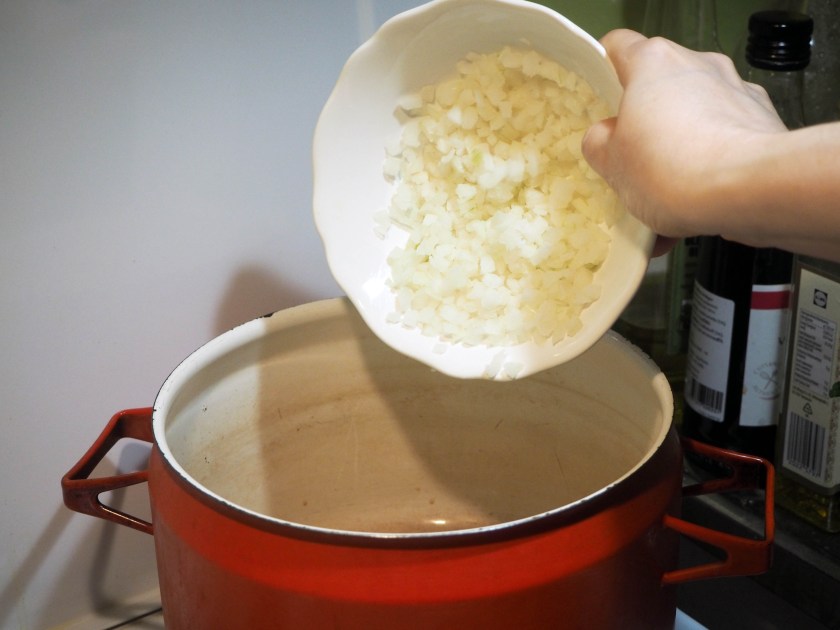 1. In a large pot, put olive oil and warm on medium high heat for about 20 seconds, then add onion and sauté for 4-5 minutes, until it is translucent.