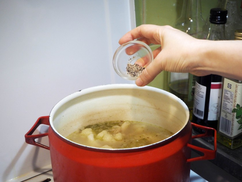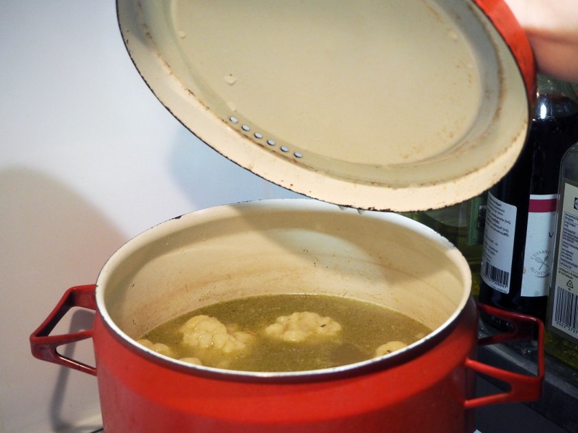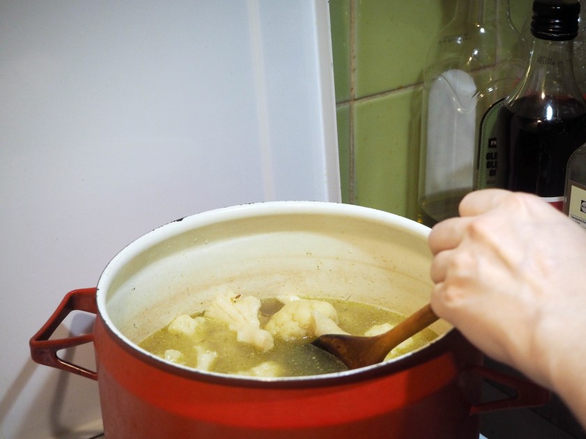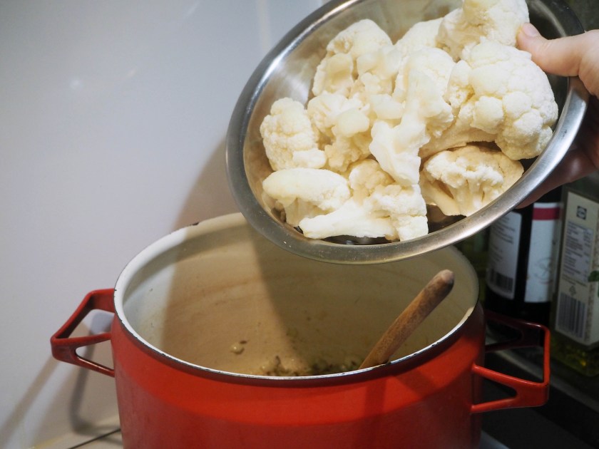 4. Stir the ingredients and cover the pot (I left ajar). Let the soup come to a boil, then turn the heat to medium and simmer for about 20 minutes, until cauliflower is fully cooked and tender.