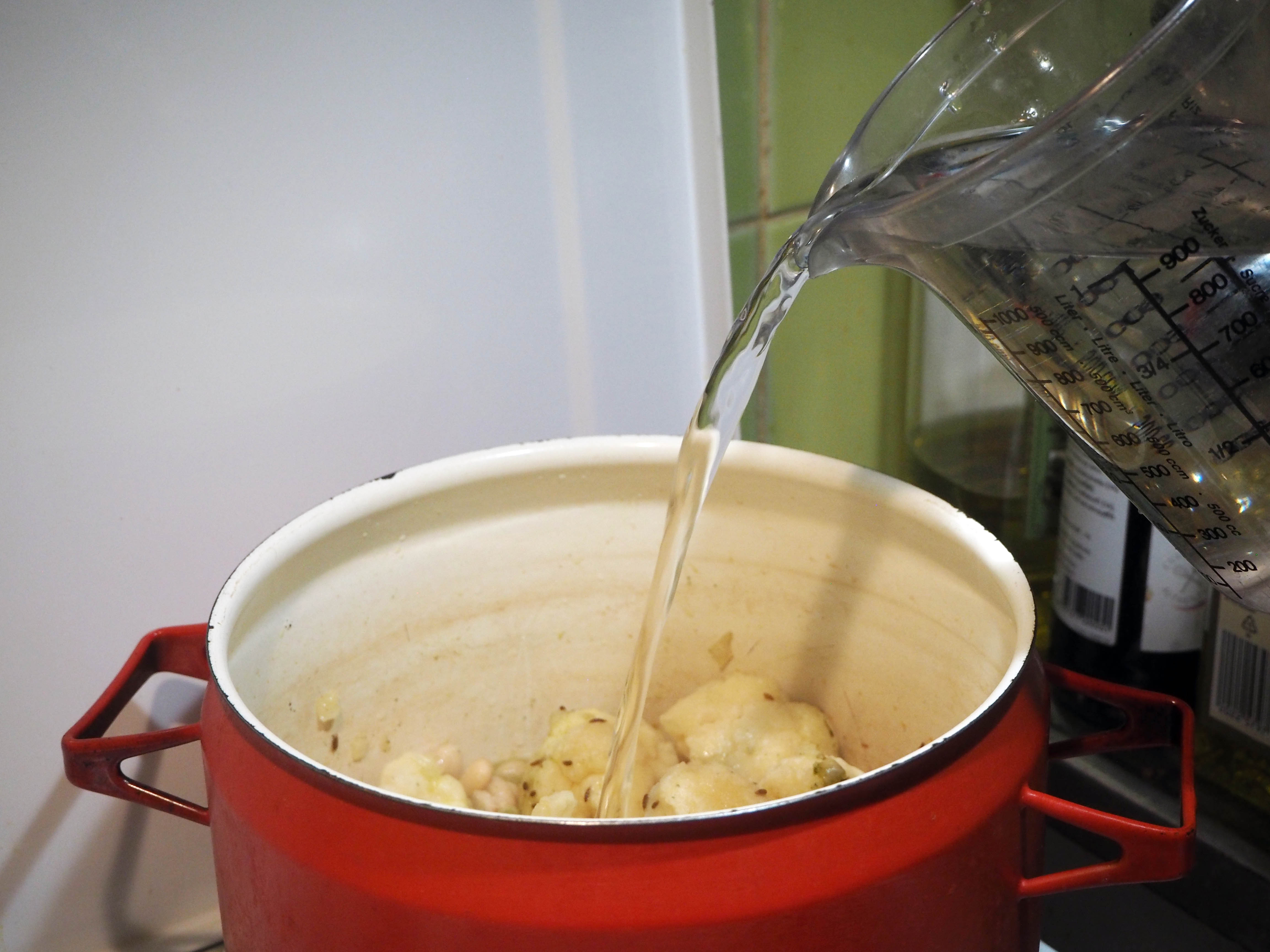 3. Add cauliflower florets and half of the beans, then add water (or vegetable broth).