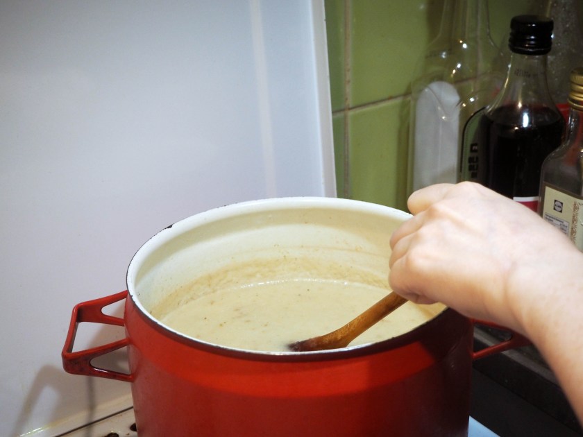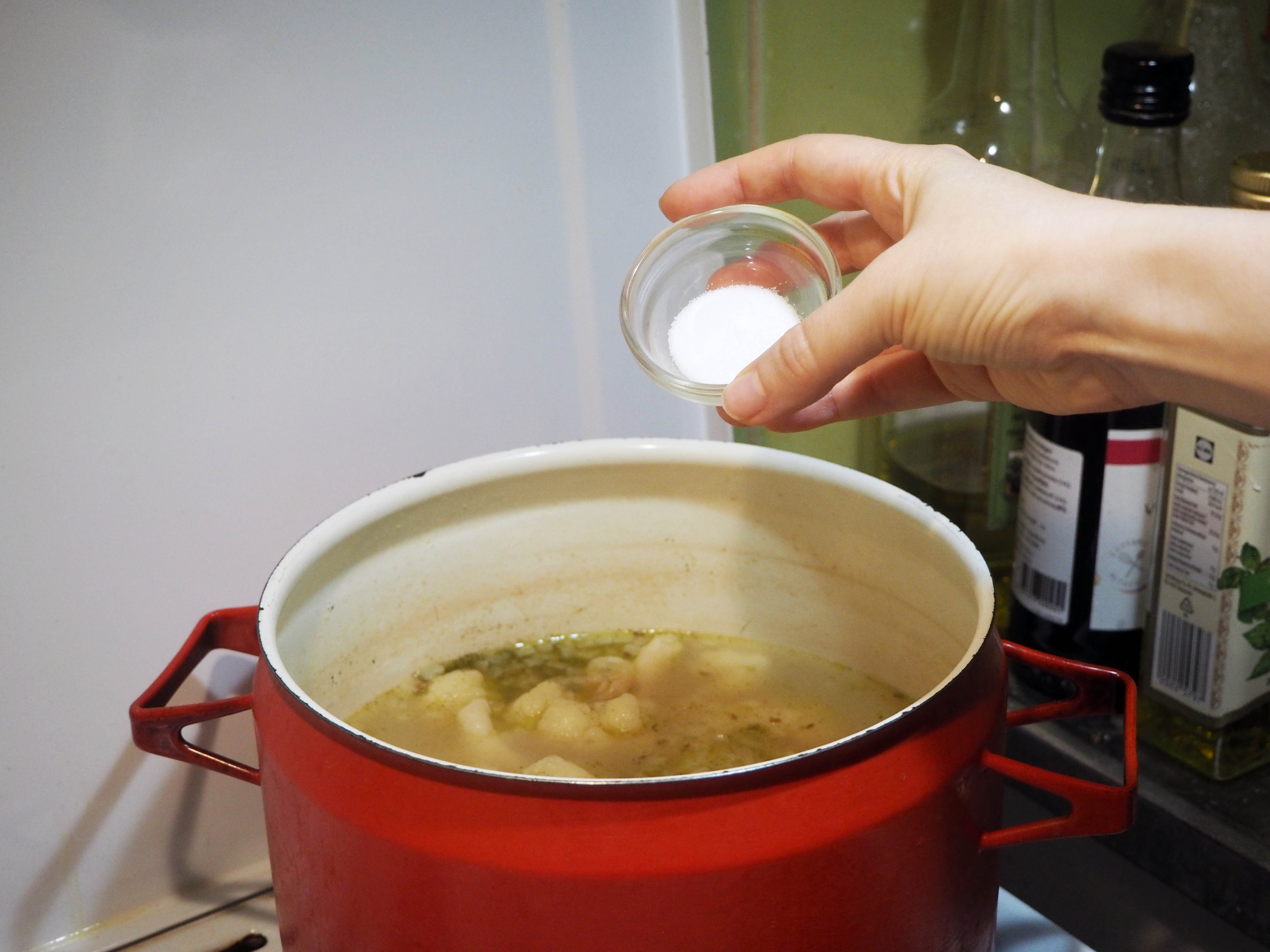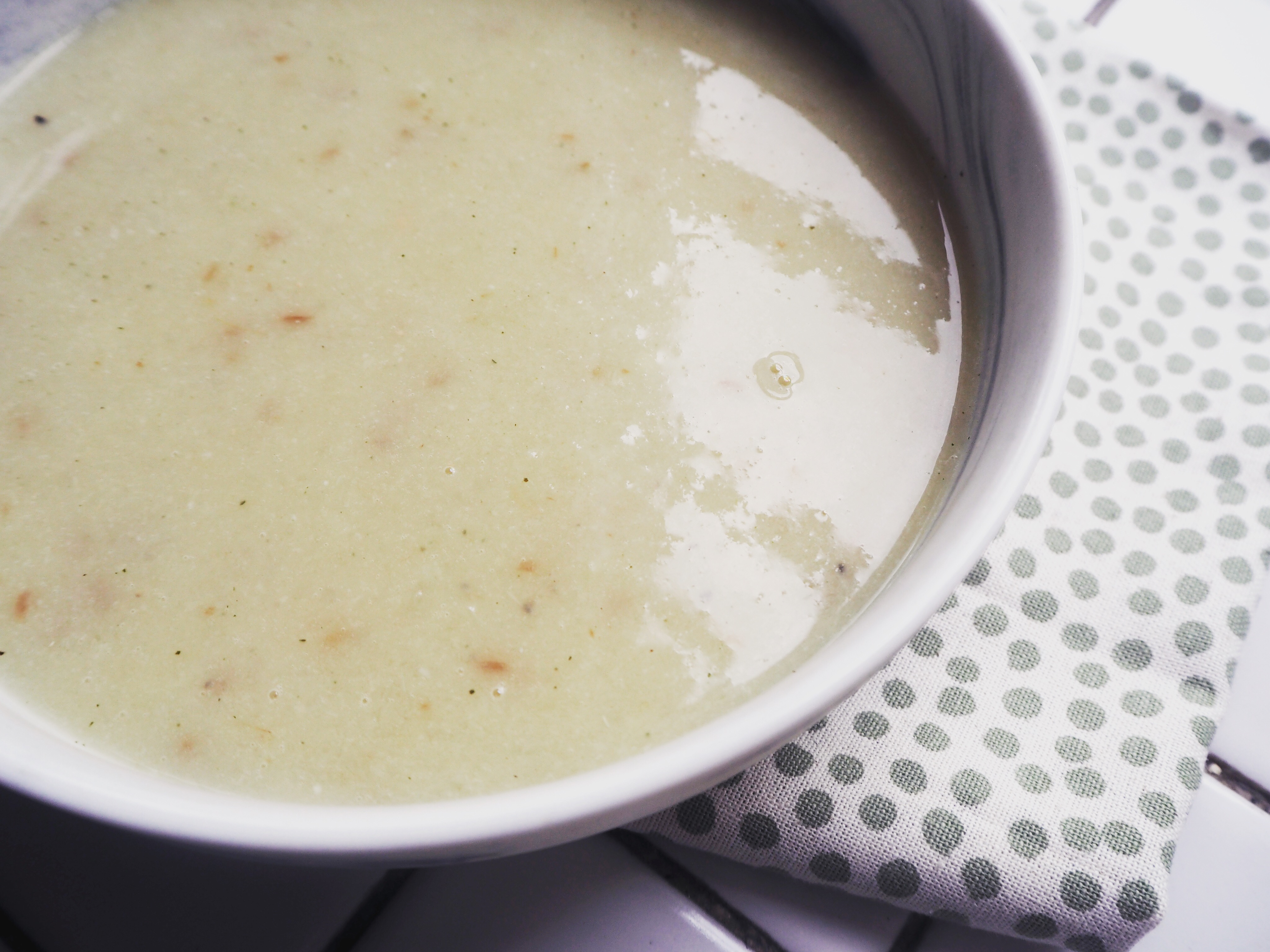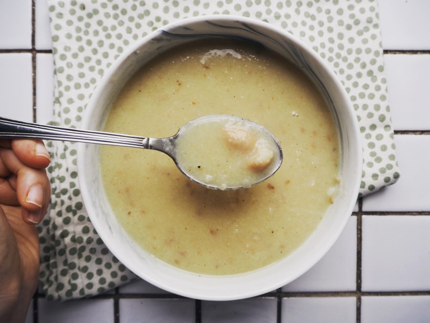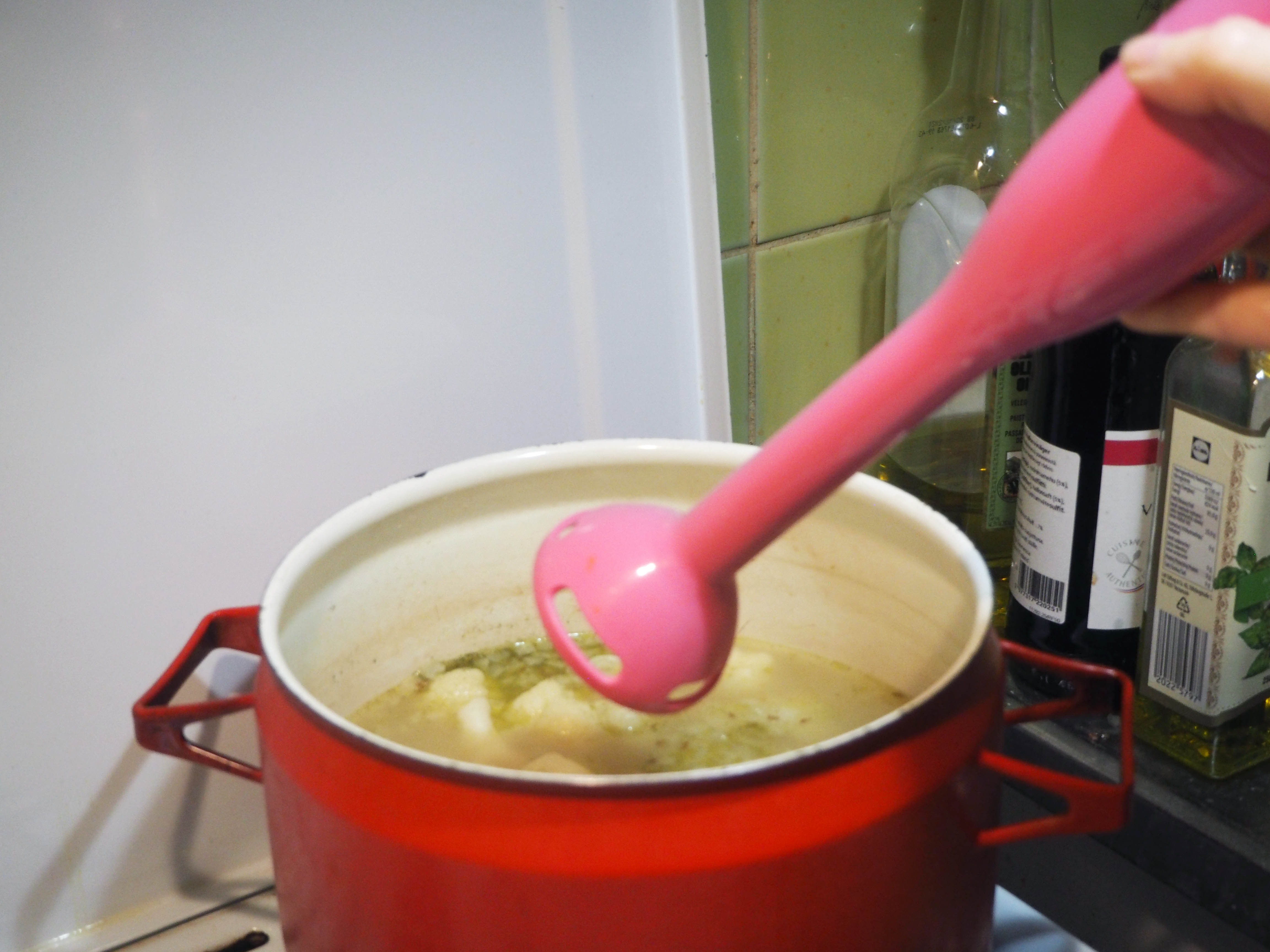 5. When the soup has cooked, add some salt and pepper to taste then turn off the heat. Using a hand blender, puree the soup.